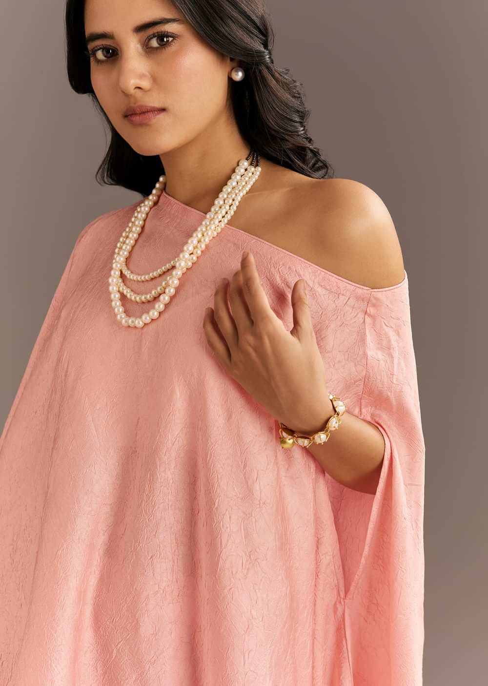 Pink Crush Silk One Shoulder Kurta With Pearl Neckpiece