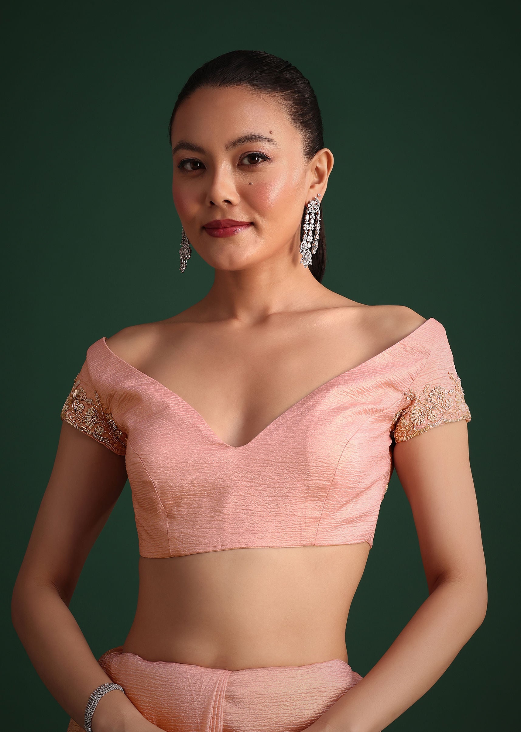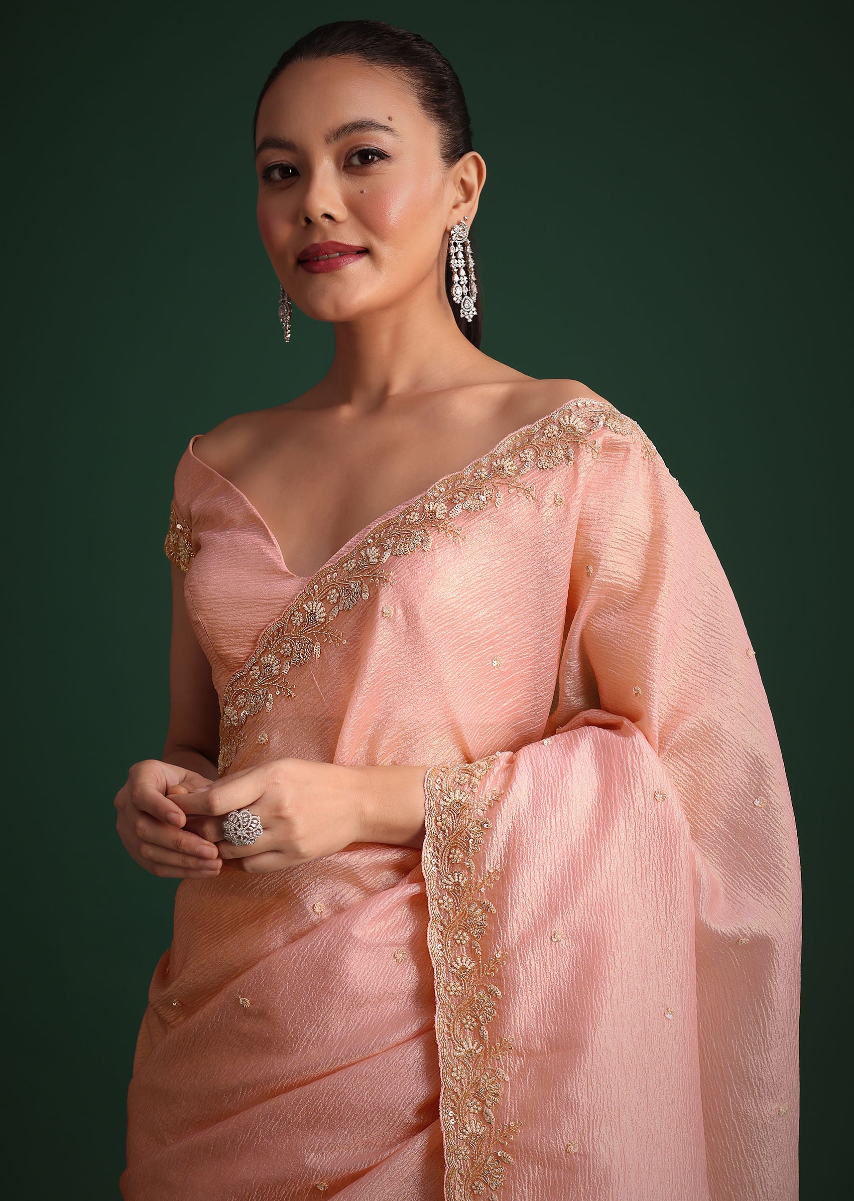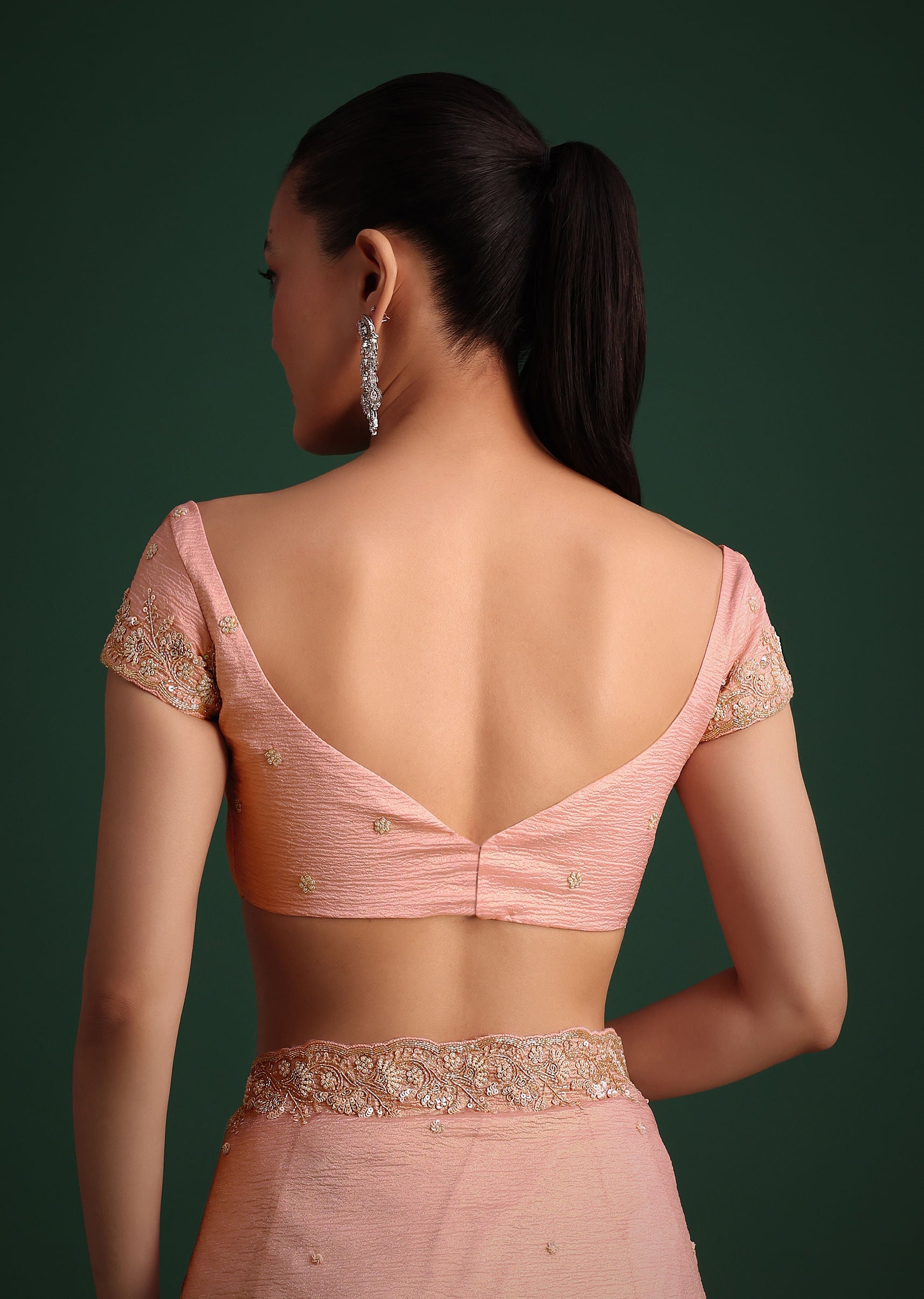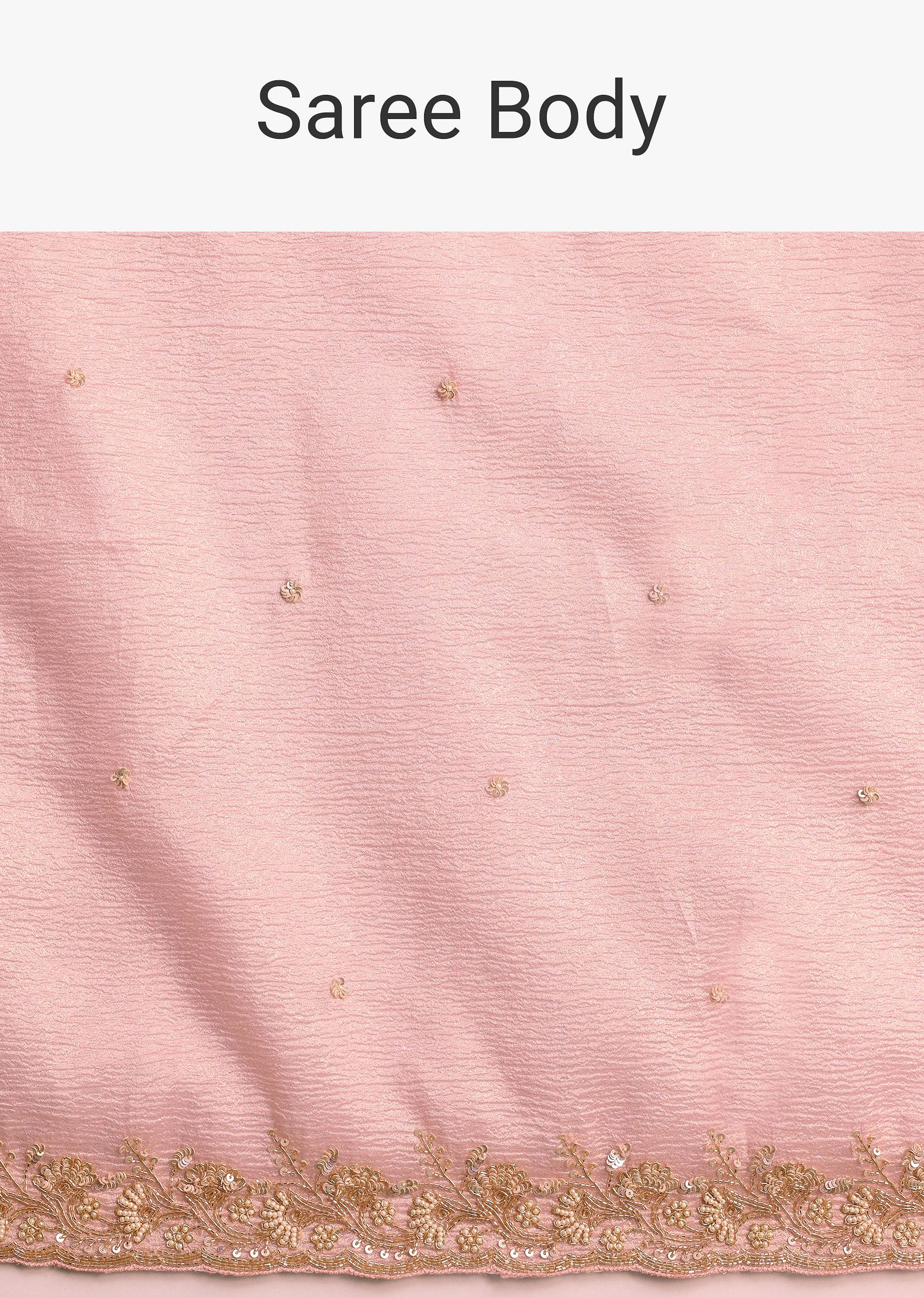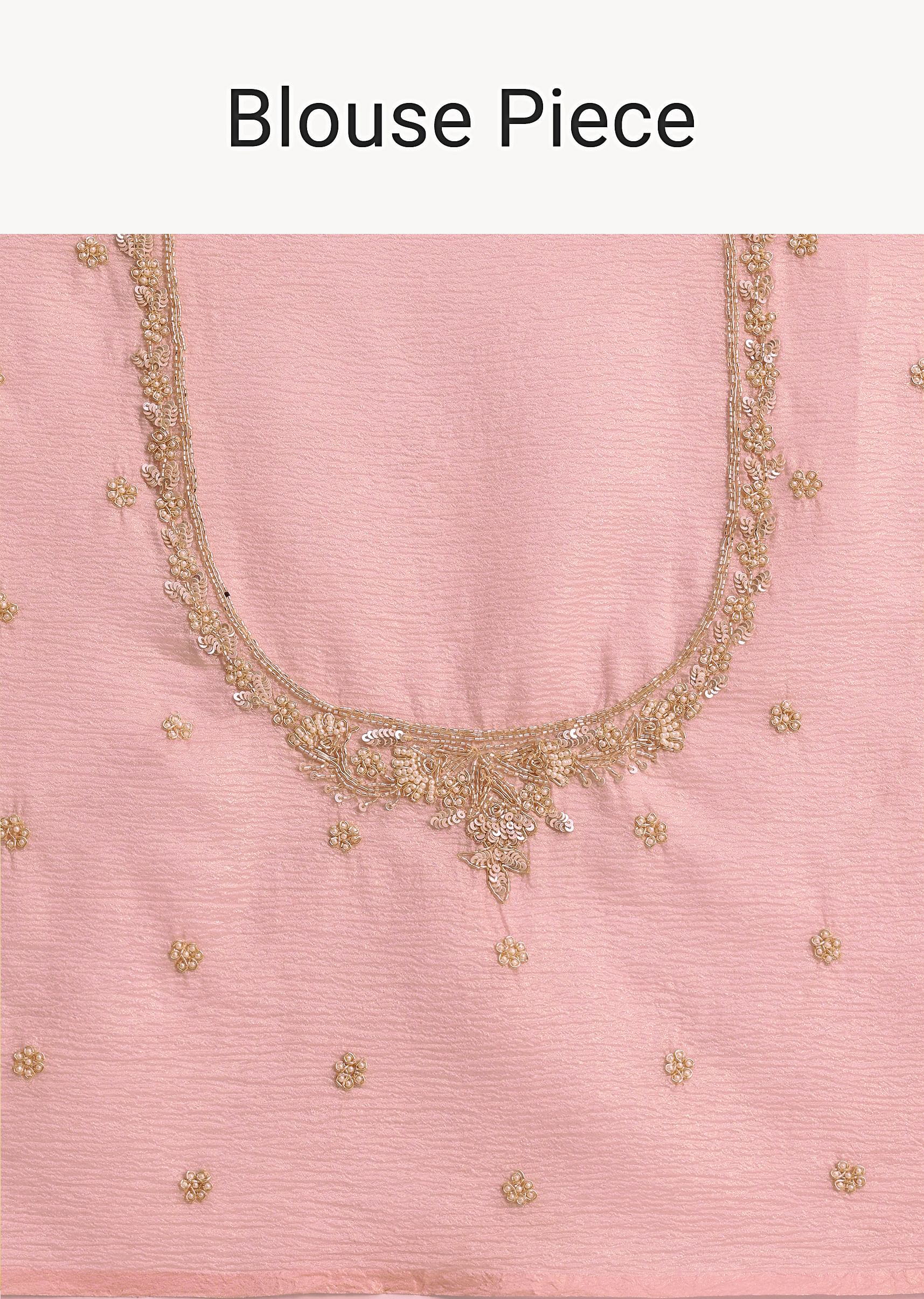 Our pink crushed silk saree features exquisite sequin and cutdana work all over, making it a luxurious addition for festive celebrations. Paired with an unstitched blouse fabric, the glossy drape... More Product Details