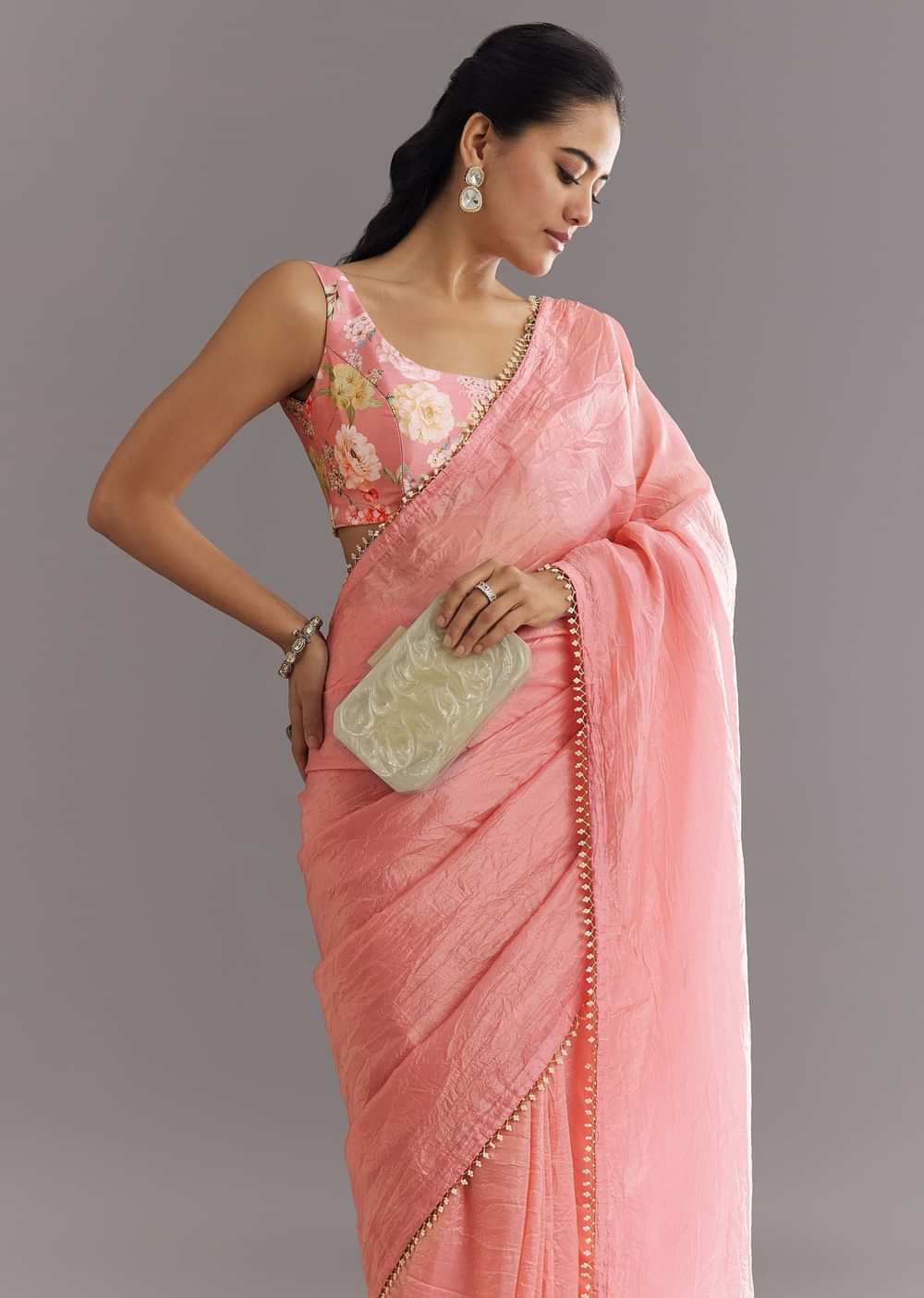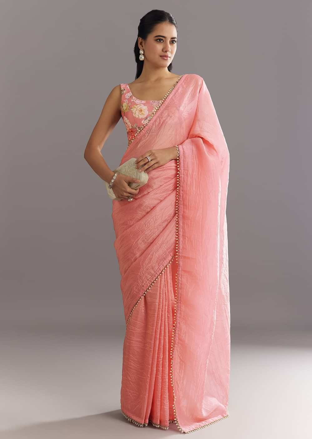 Soft as rose petals and glowing with charm, this pink crushed tissue saree features a border highlighted with shimmering cutdana and delicate moti—ideal for moments wrapped in elegance. Awarded as the Most Trusted Brand, we're delivering styles you love, just as promised.