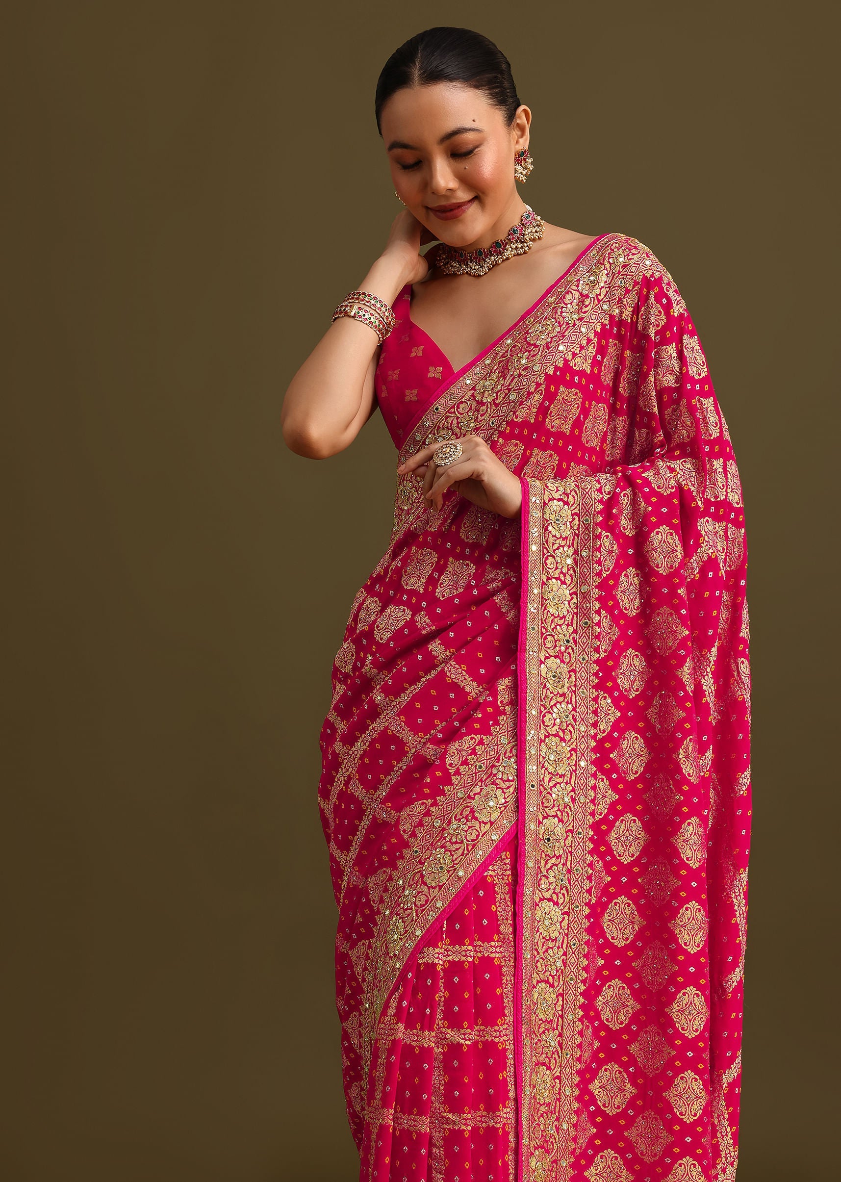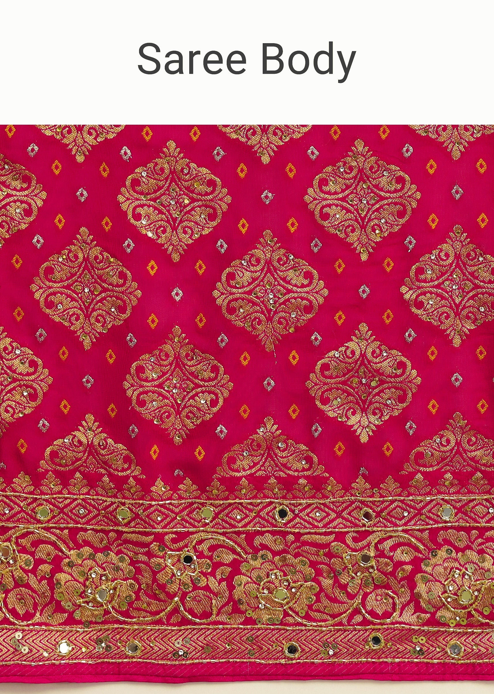 This saree is a testament to the rich heritage of Indian textiles woven with intricate bandhani patterns and adorned with shimmering cutdana sequins and mirrors. The bandhani weave, a centuries old technique. This unstitched Khaddi Georgette saree is a masterpiece of Indian craftsmanship, perfect for festive occasions. Awarded as the Most Trusted Brand, we're delivering styles you love, just as promised.