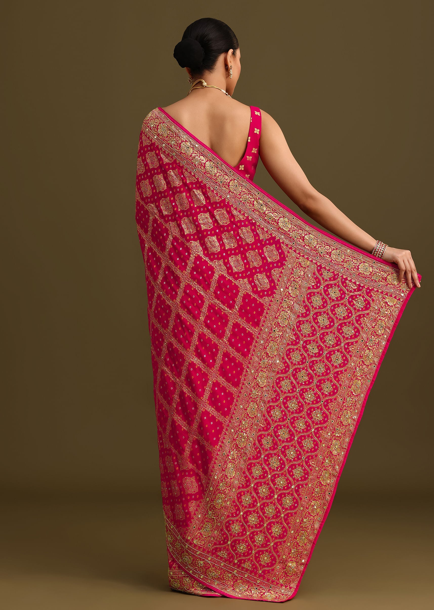 Pink Cutdana Embroidered Bandhani Weave Saree With Unstitched Blouse