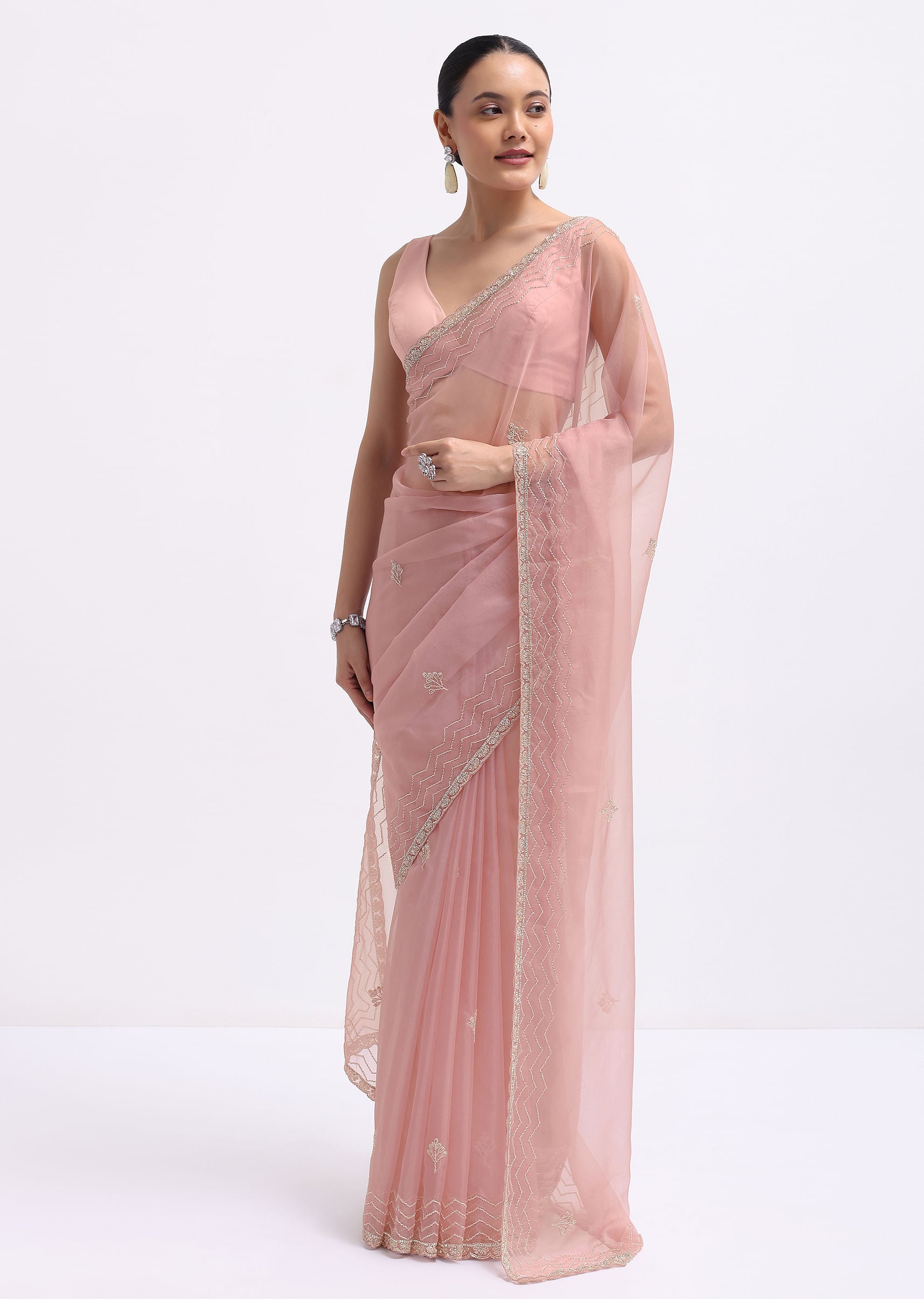 Pink Cutdana Embroidered Organza Saree With Unstitched Blouse