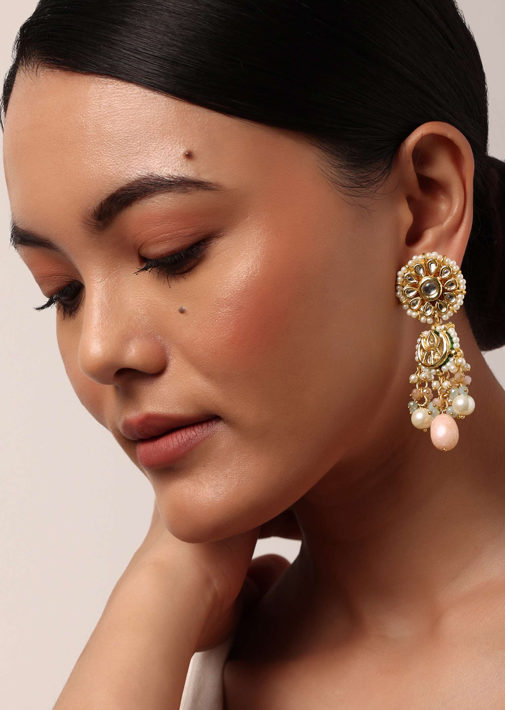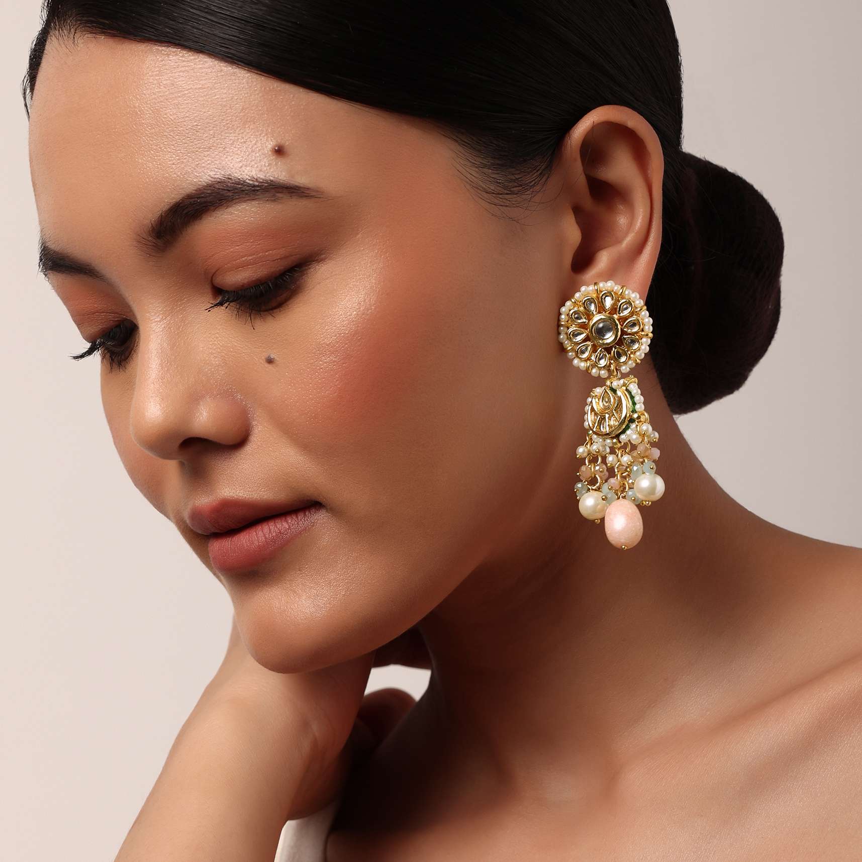 Keep it fun and vibrant at festive gatherings with our captivating pink danglers. Delicately crafted on a mix metal base, these exquisite earrings are adorned with a cluster of pink and white beads. Designed with a floral top, the delicated embedded kundan uplift its timeless charm.Avoid contact with water, chemicals, harsh liquids, perfumes, etc.Do not wear this piece of jewelry while showering, gymming, swimming, etc.Please keep the product away from moisture and humidity when not in use. Awarded as the Most Trusted Brand, we're delivering styles you love, just as promised.