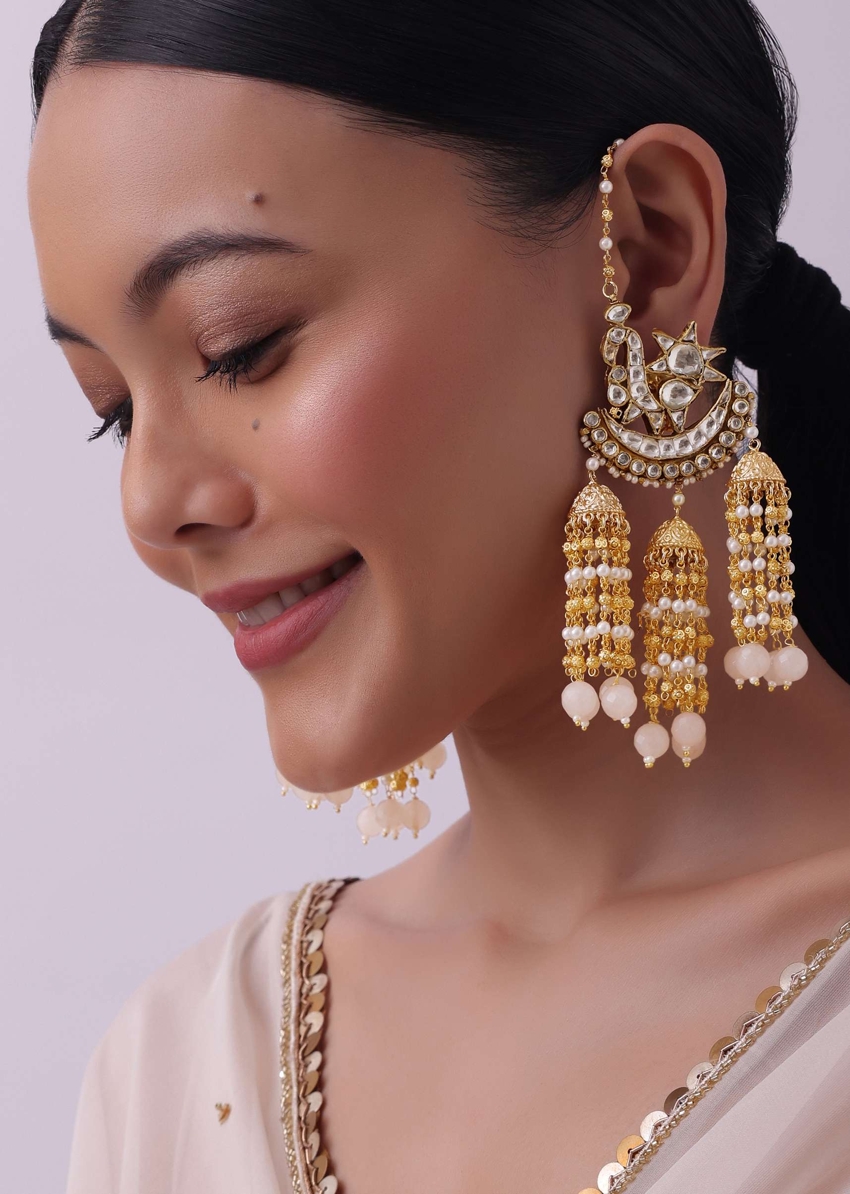 Introducing our captivating dangler earrings with three bell drops adorned with delicate pink beads. These exquisite earrings feature intricate kundan work, meticulously crafted in mix metal gold finish. EVENT - Perfect for weddings and grand celebrations. Store in a dust bag. Keep away from moisture, perfume, alcohol, and harsh chemicals. Spot clean only. Keep away from sharp objects. A. Awarded as the Most Trusted Brand, we're delivering styles you love, just as promised.