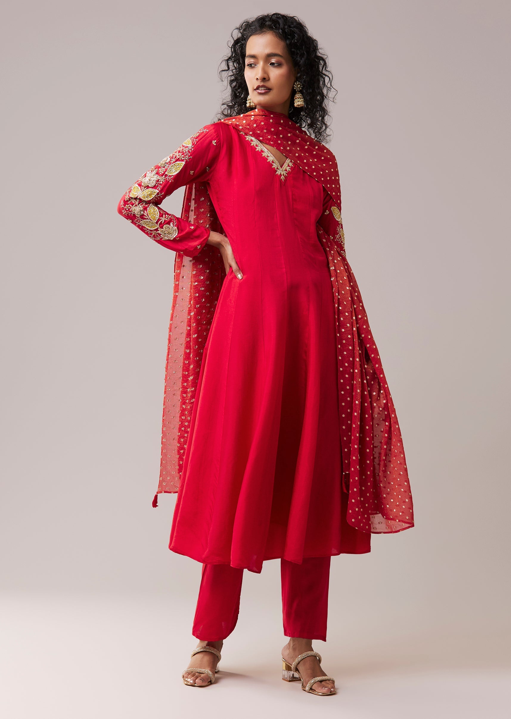 Rich detailing and graceful structure come together in this zardosi and sequin work anarkali, crafted for refined festive elegance. The silk anarkali features intricate embellishment along the neckline and patch... More Product Details