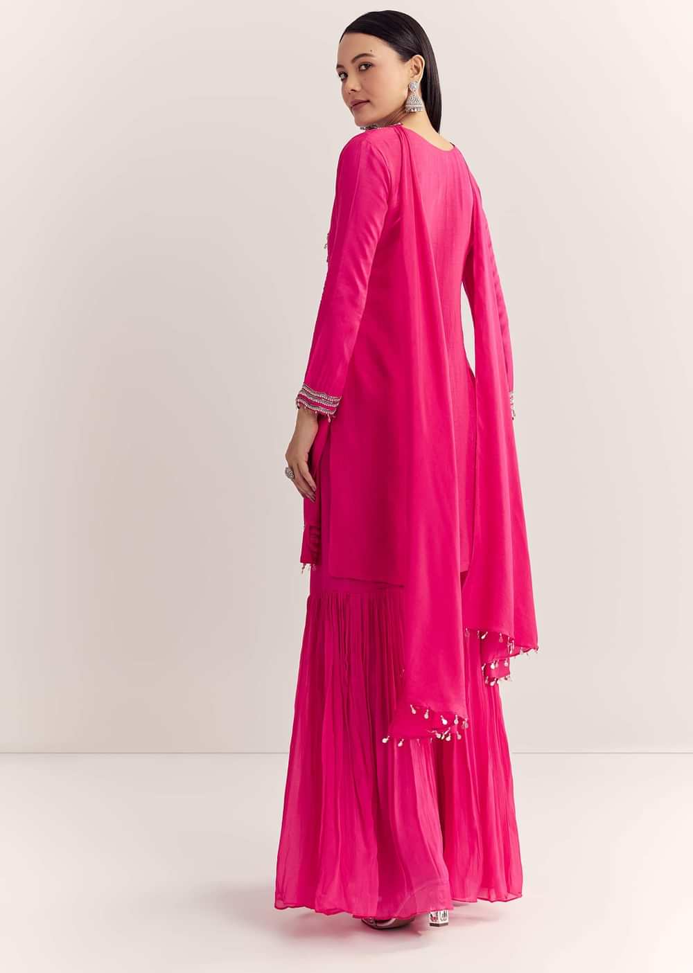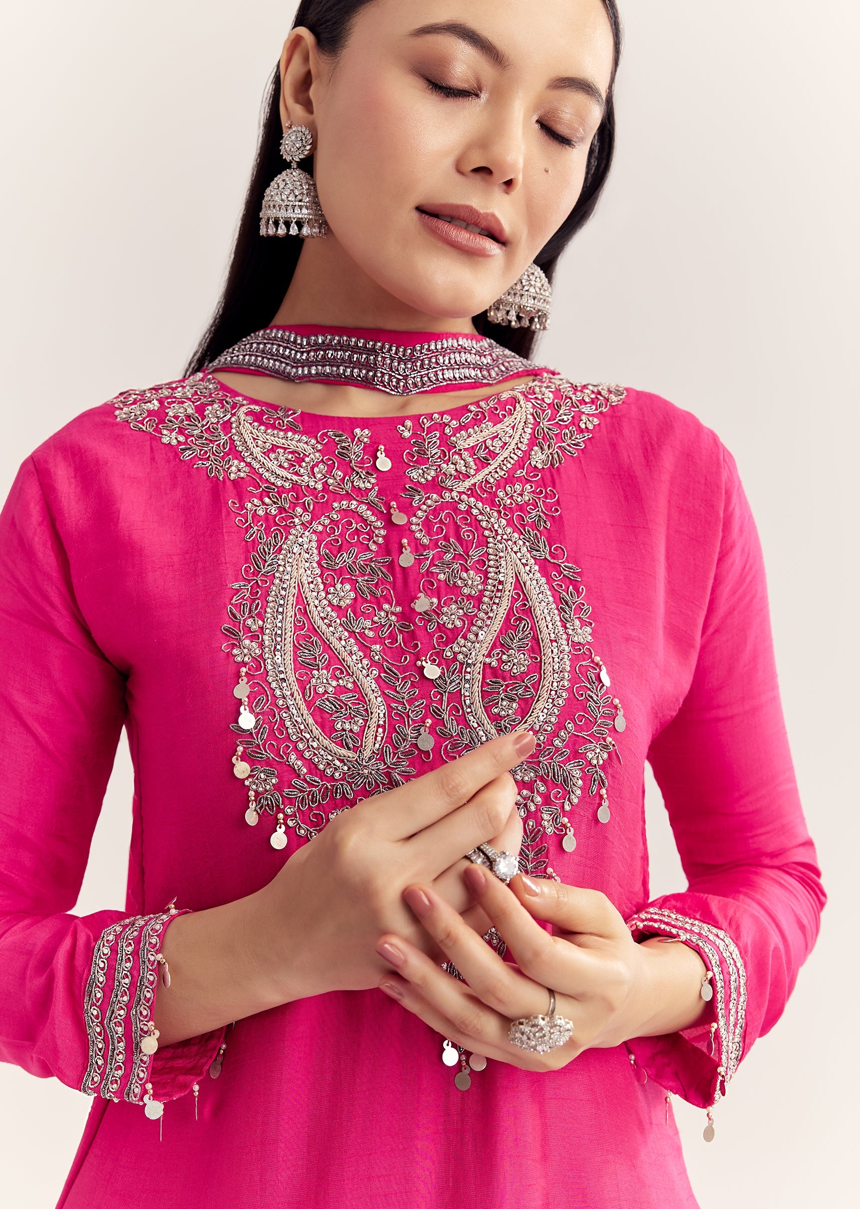 Pink Dola Silk Kurta Set With Zardosi And Choker Dupatta