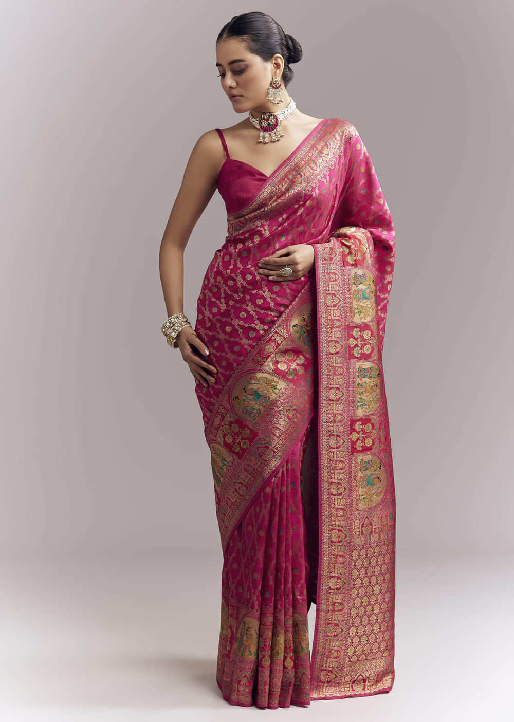 Traditional patterning comes to life as this pink dola silk woven saree carries all-over jaal work with a story-rich border of human motifs. The zari sits flat and precise so... More Product Details
