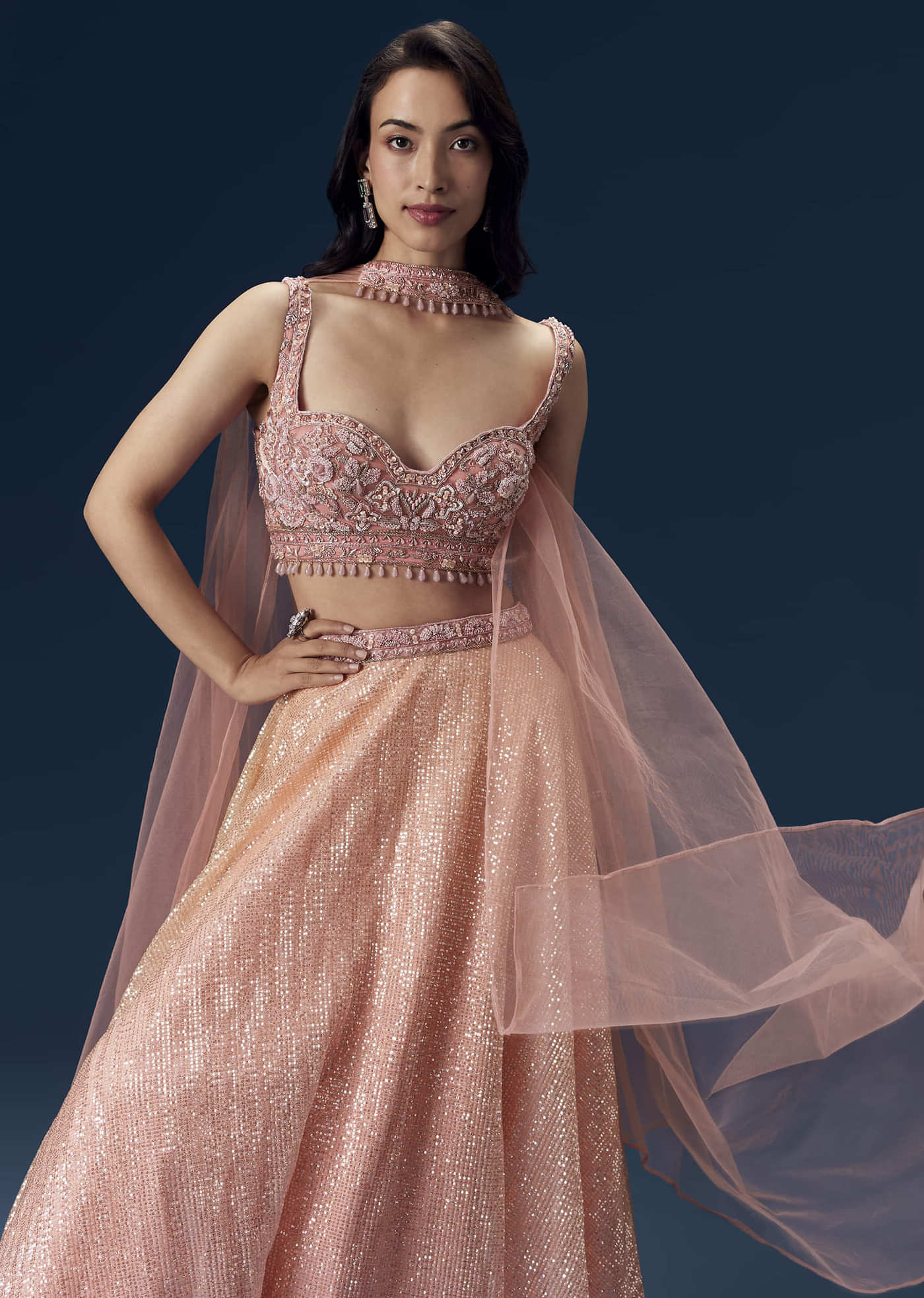 Crafted for the style forward bridesmaid, this pink lehenga set blends soft charm with modern sophistication. Sparkling sequin and cutdana detailing adds subtle radiance, while the unique choker-style dupatta creates... More Product Details
