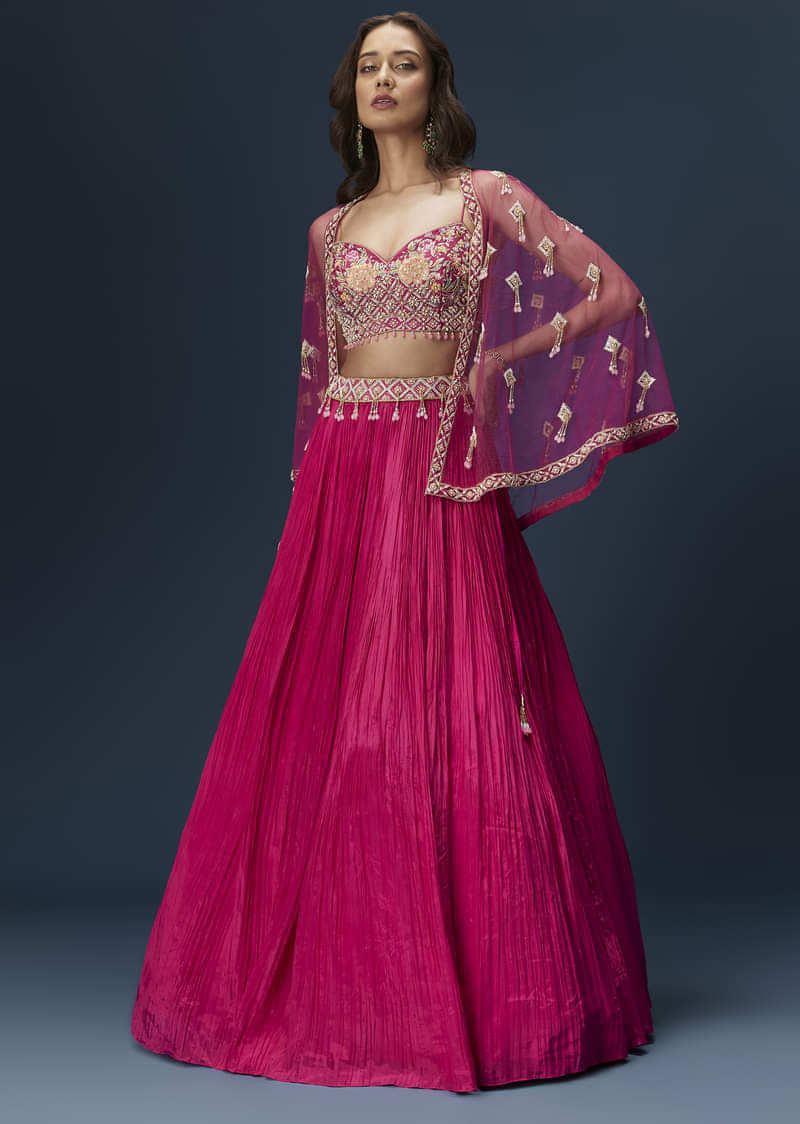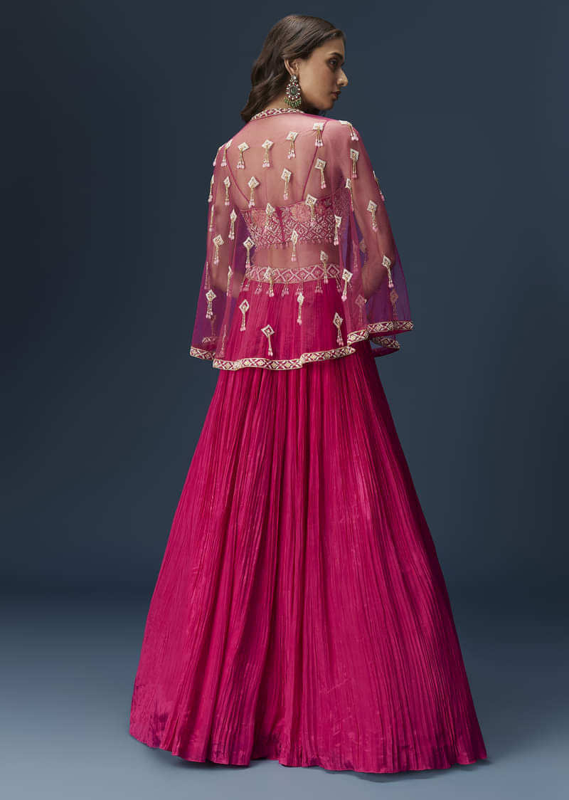A vibrant pink lehenga set featuring a structured blouse with delicate embroidery, paired with a matching cape and a flared lehenga. This modern silhouette blends tradition with contemporary flair for... More Product Details
