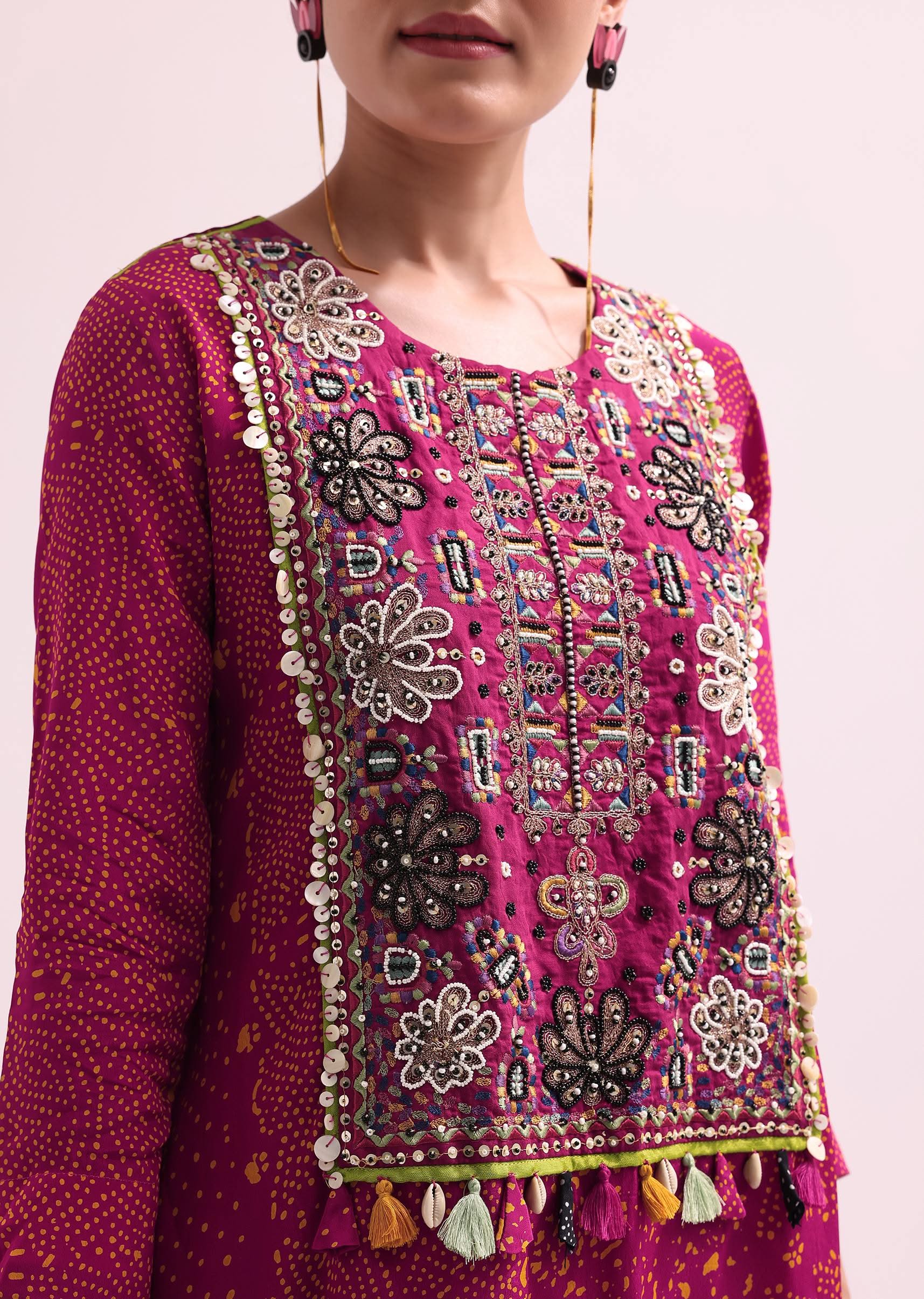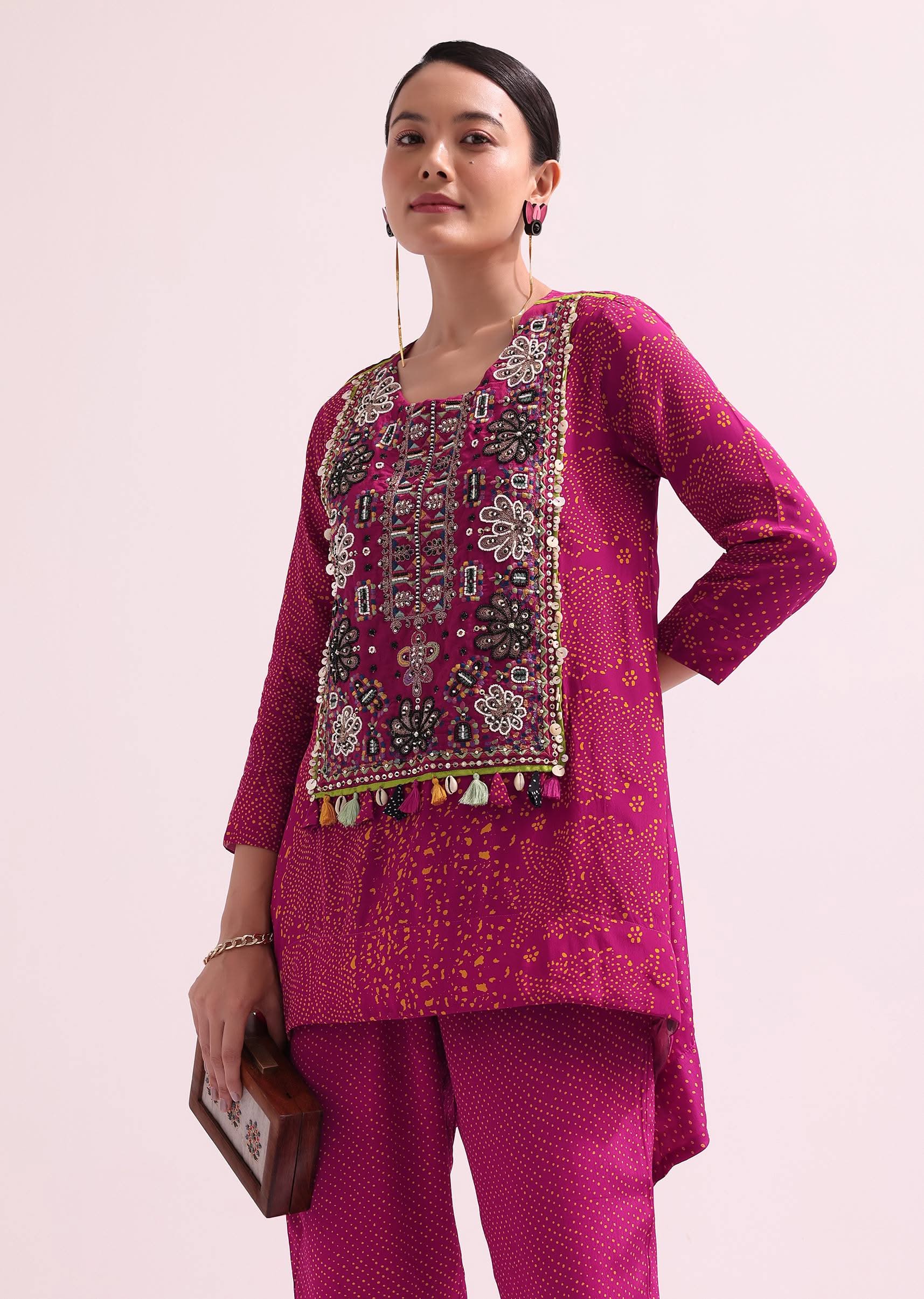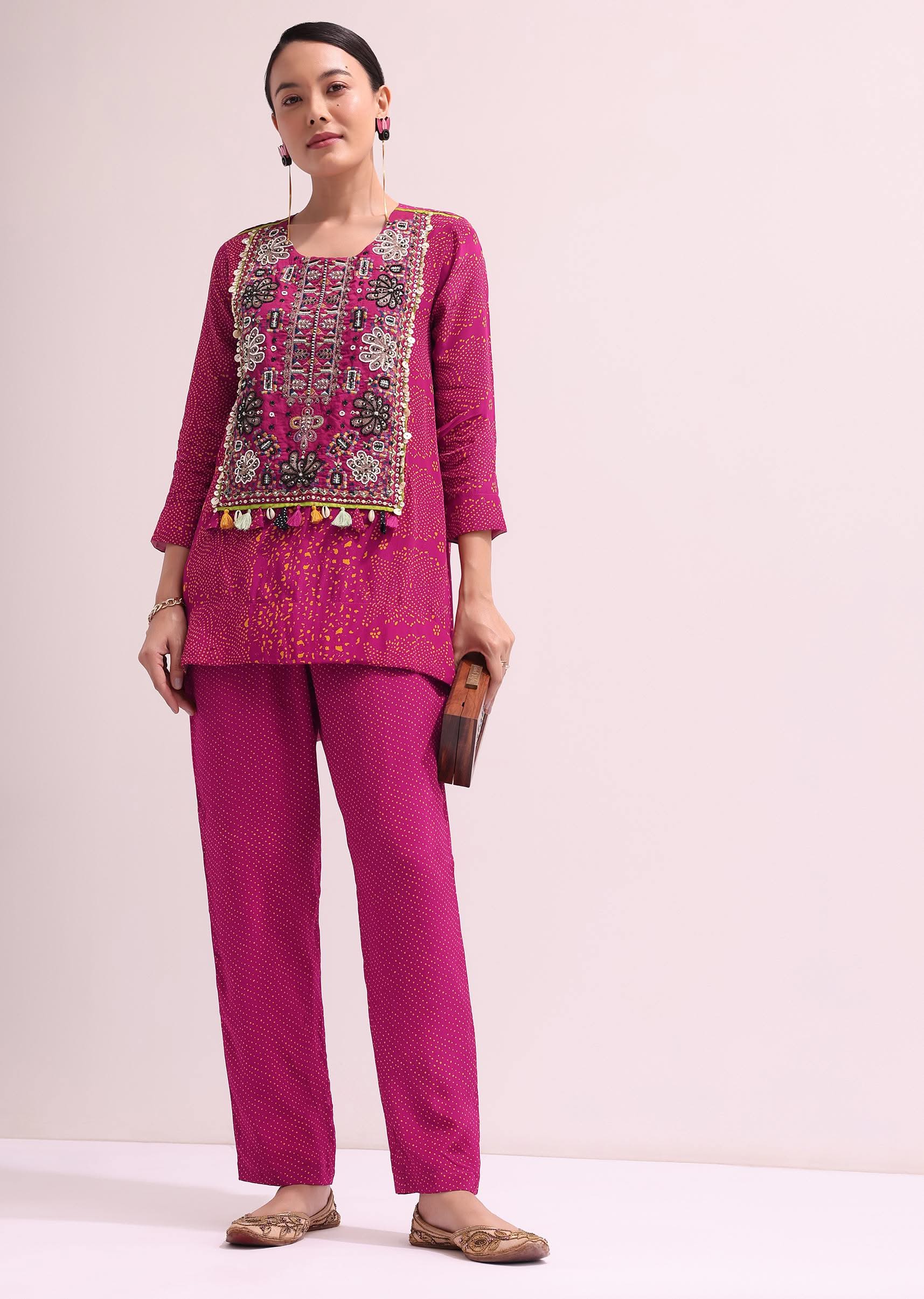 Pink embroidered kurta and pant setThis set is fabricated from crepe fabric and accompanied by beads, resham, and sequins embroidery.Style this set for festive events.This set comes with a kurta... More Product Details
