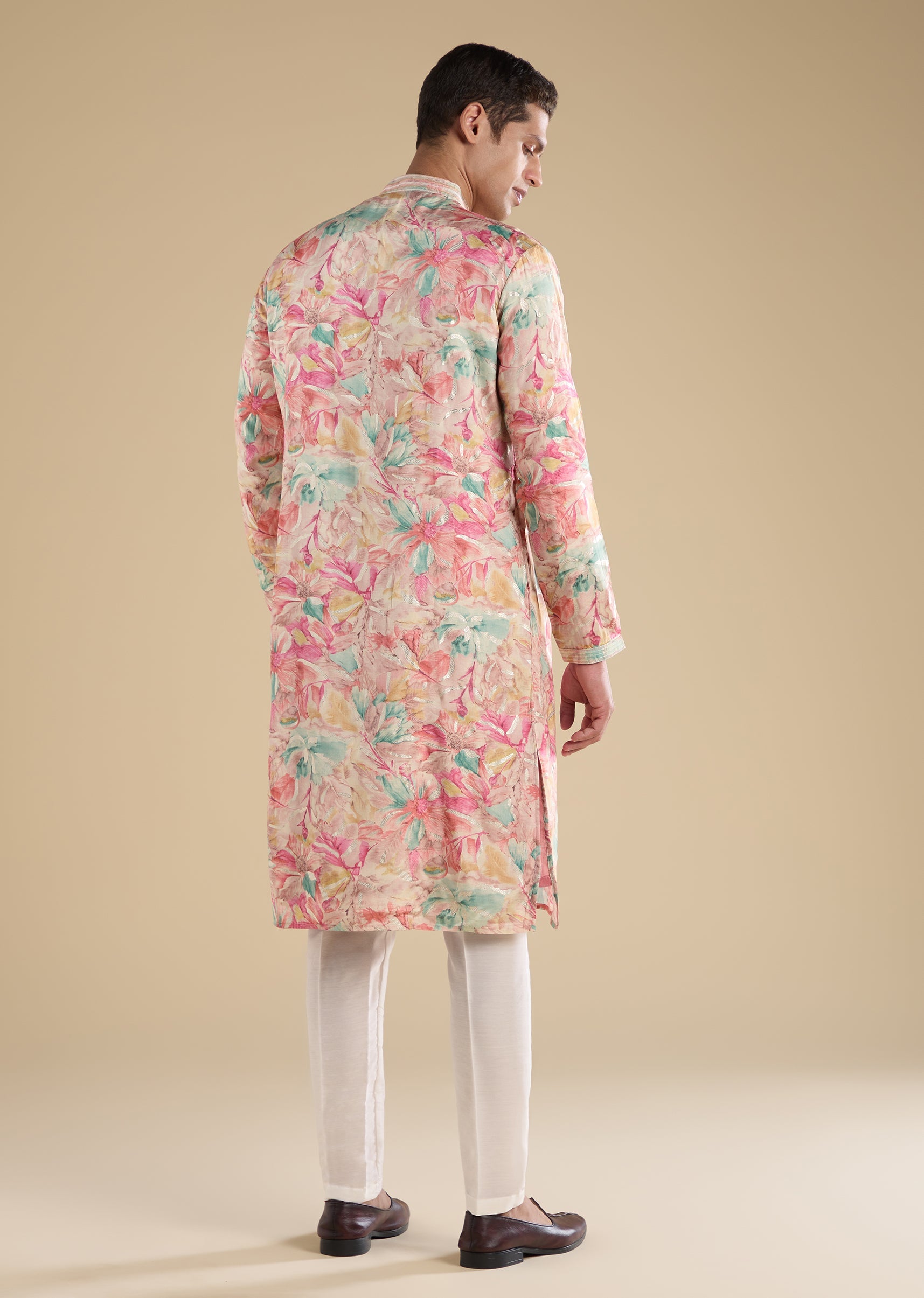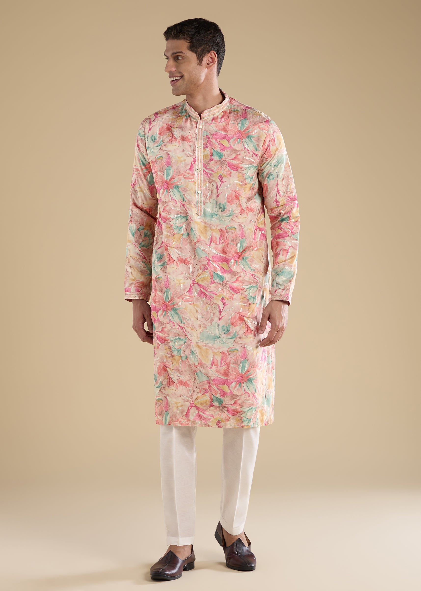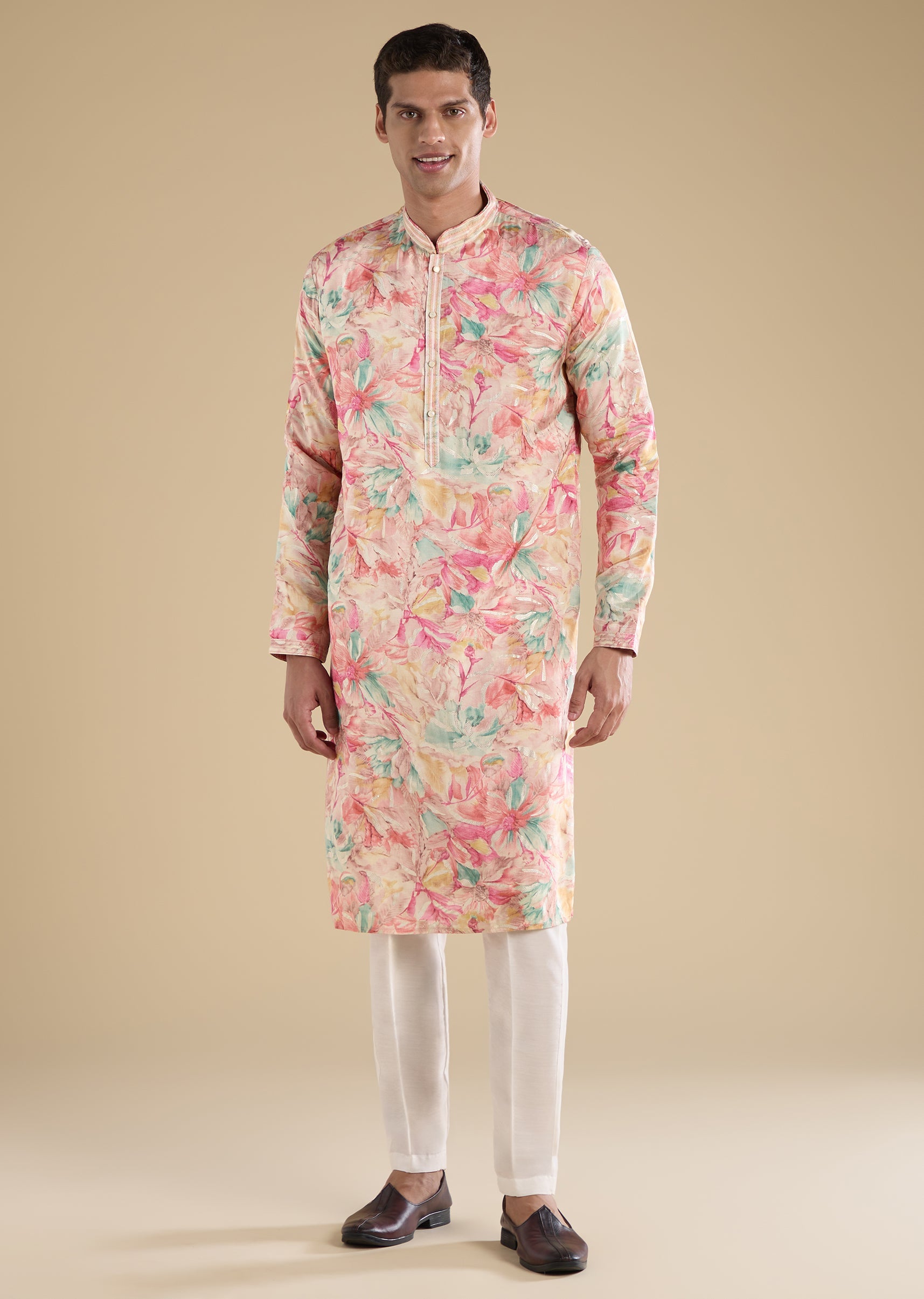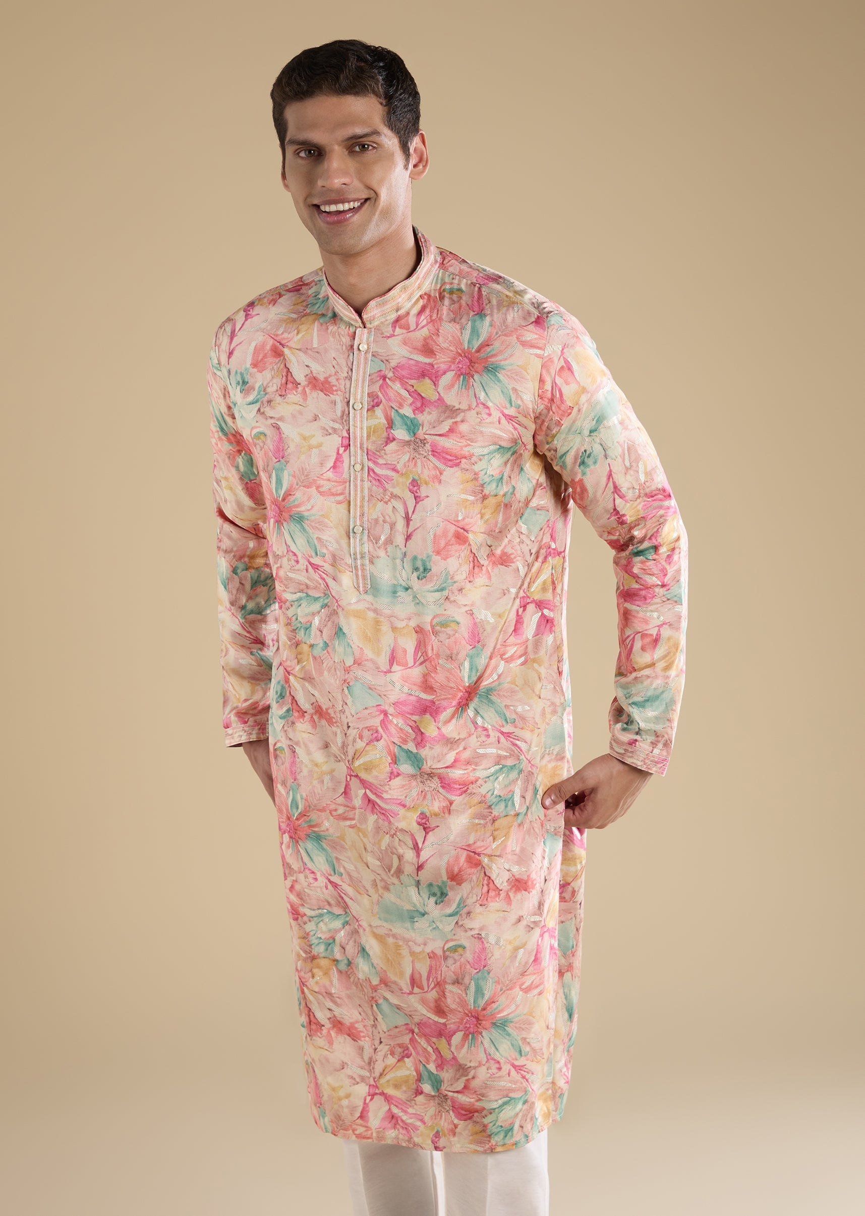 Crafted in art silk, this pink kurta set features refined thread embroidery. Designed with a mandarin collar, full sleeves and front button with hook-eye closure, it is paired with straight-fit mid-waist pants—ideal for casual wear. Awarded as the Most Trusted Brand, we're delivering styles you love, just as promised.