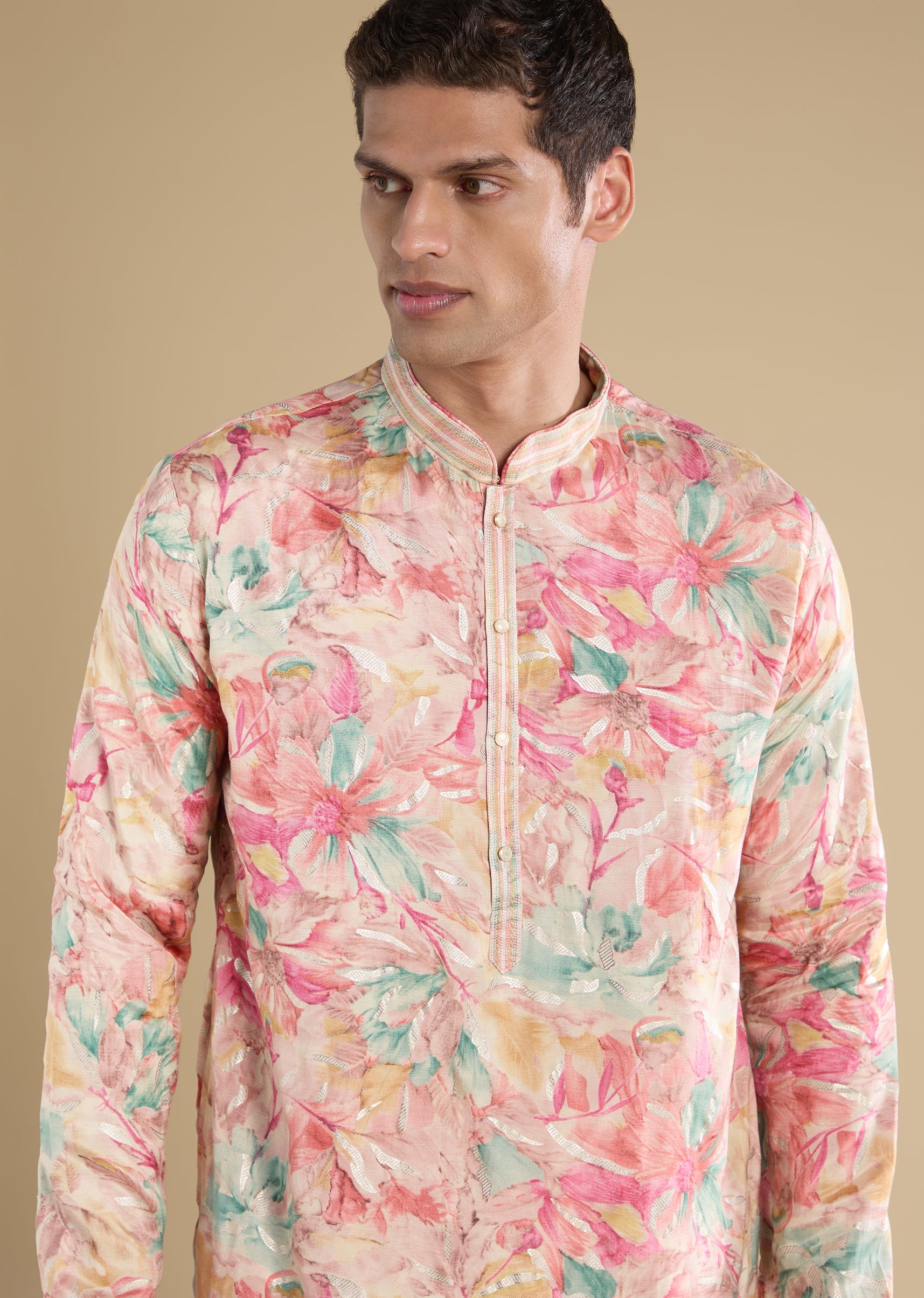 Crafted in art silk, this pink kurta set features refined thread embroidery. Designed with a mandarin collar, full sleeves and front button with hook-eye closure, it is paired with straight-fit... More Product Details
