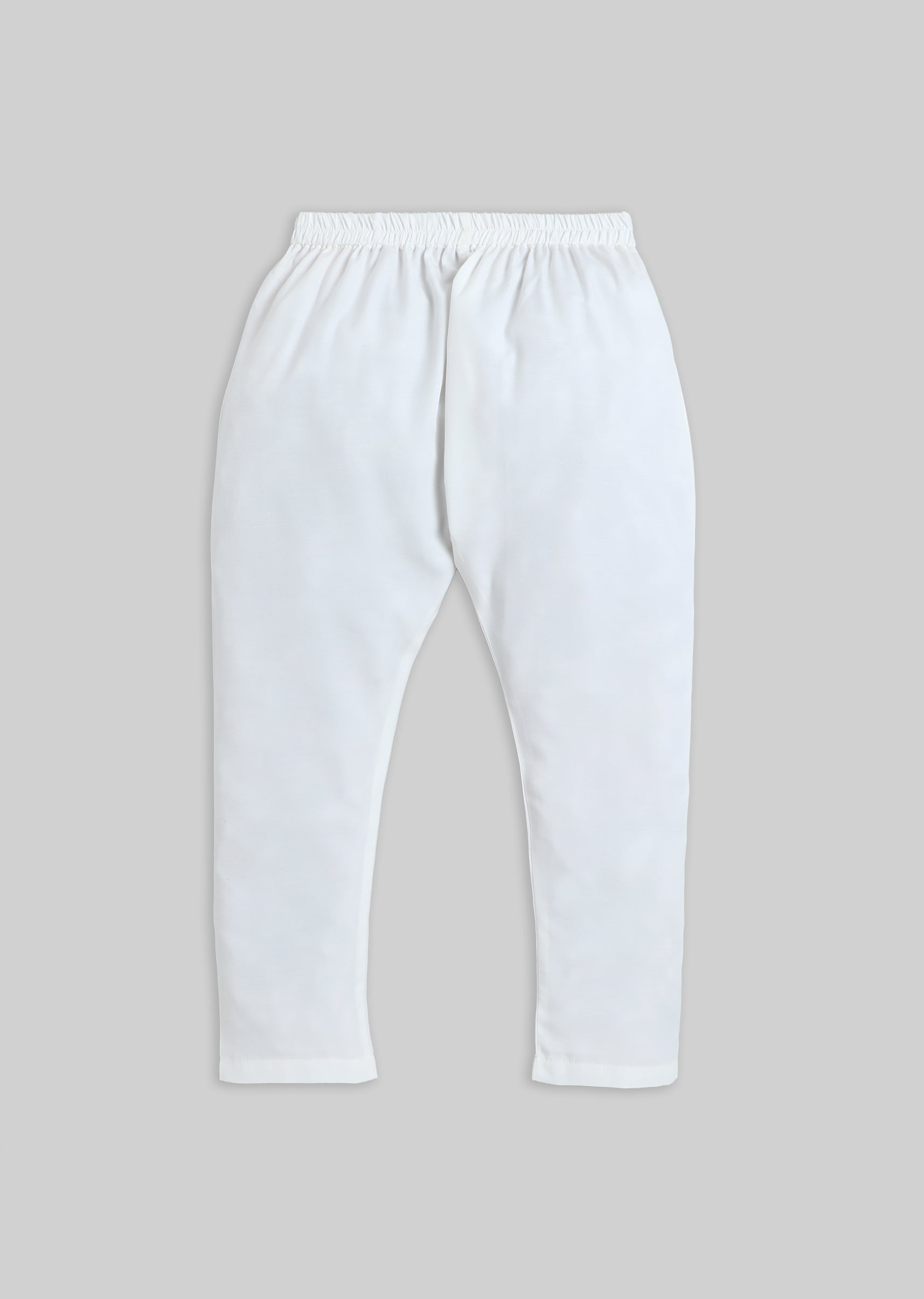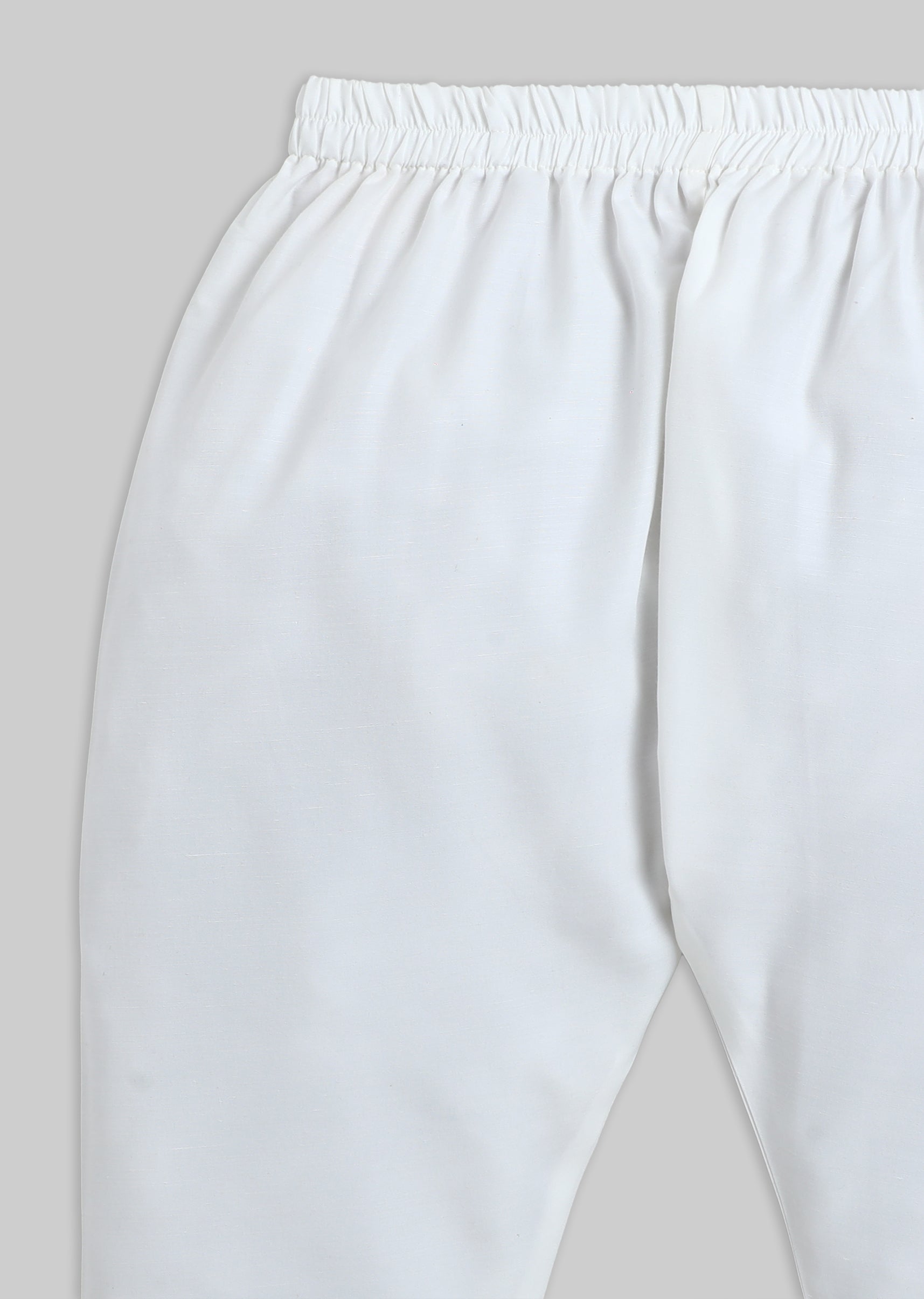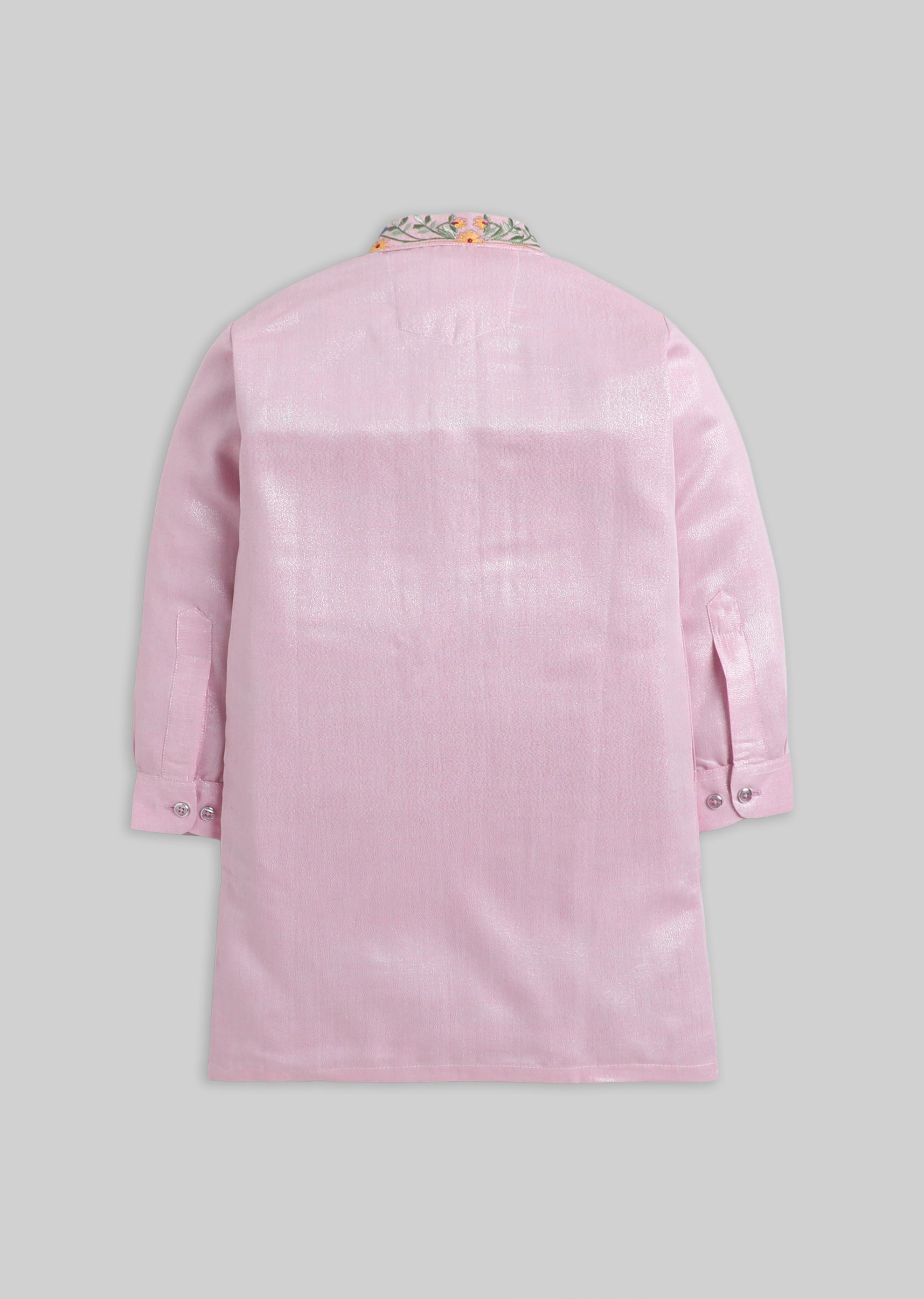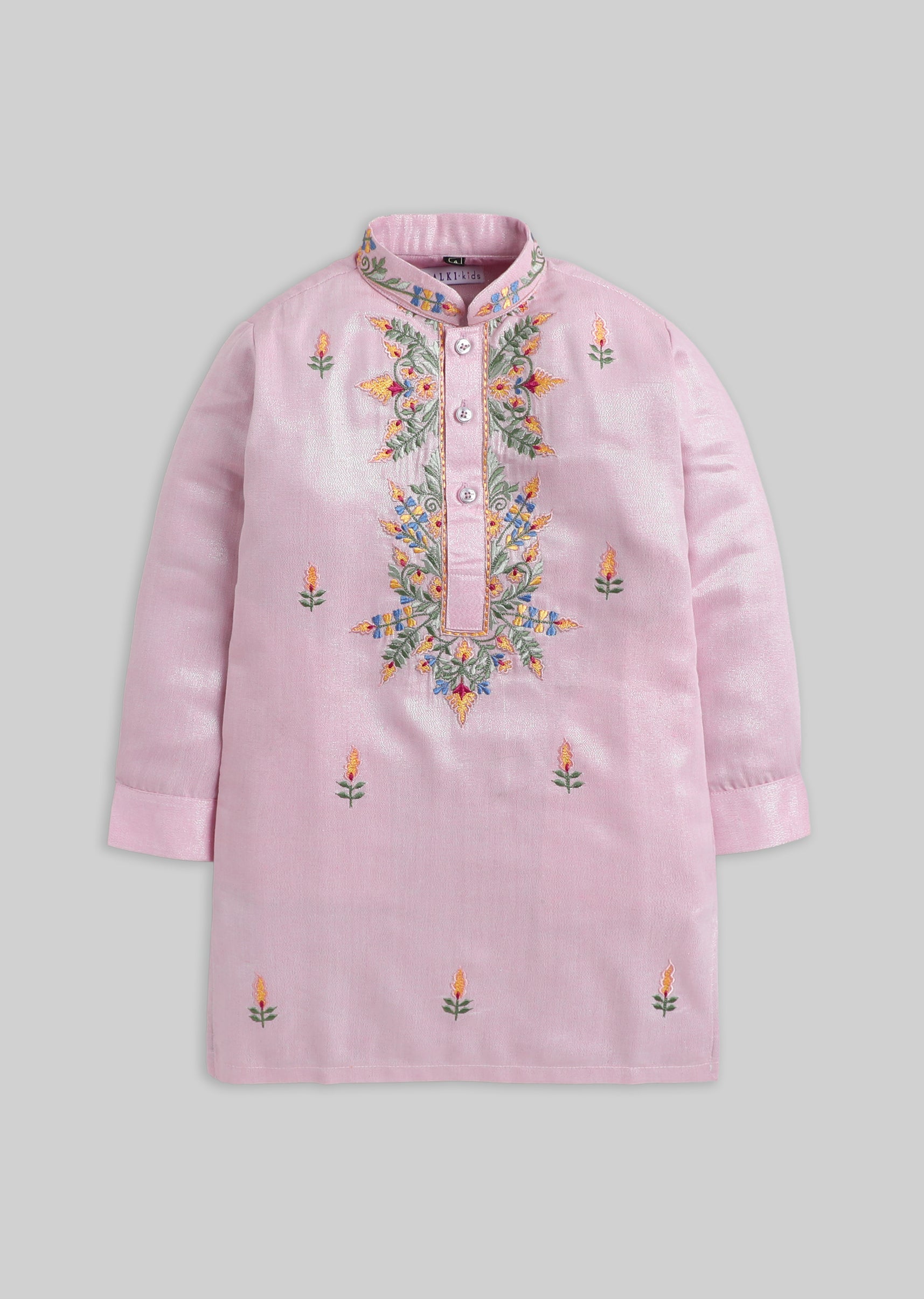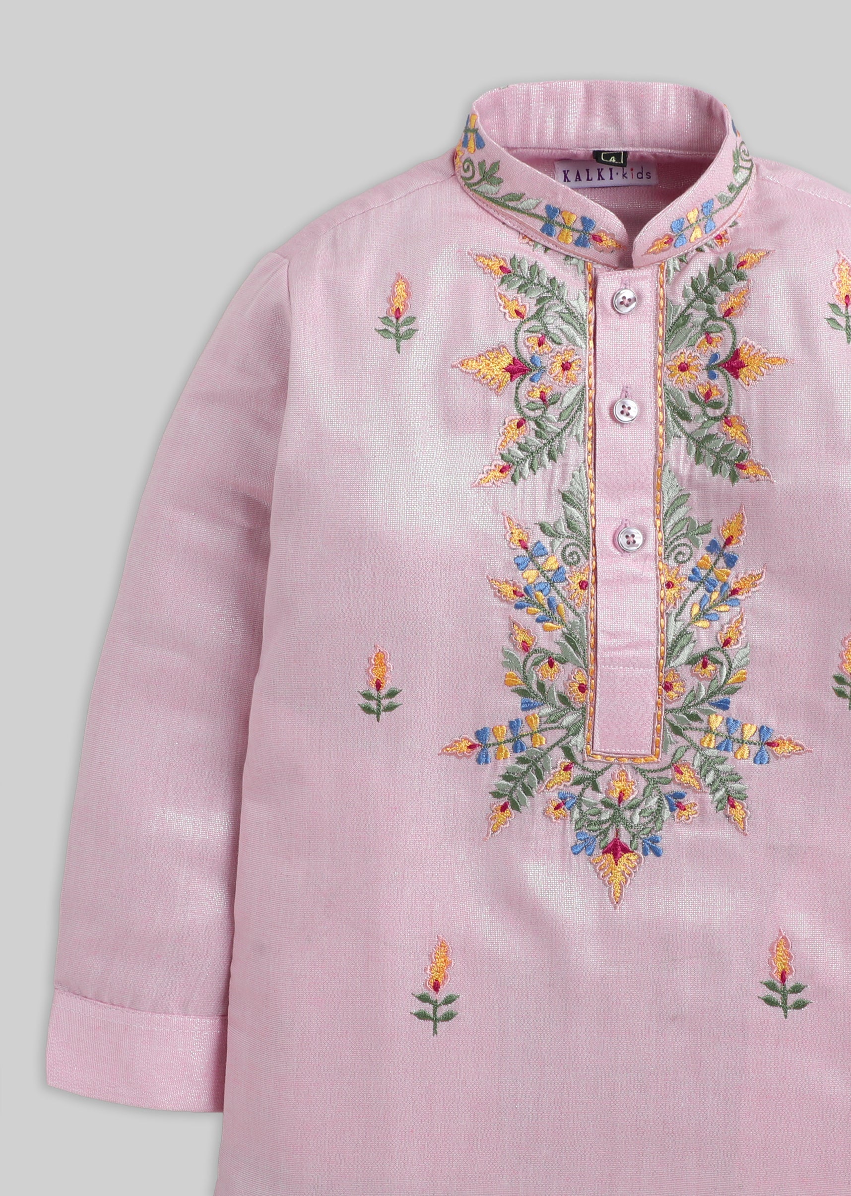 A pastel pink silk kurta set with subtle embroidered detailing, finished with a mandarin collar, 3/4th sleeves, and button front. Paired with matching pants for a complete festive look.