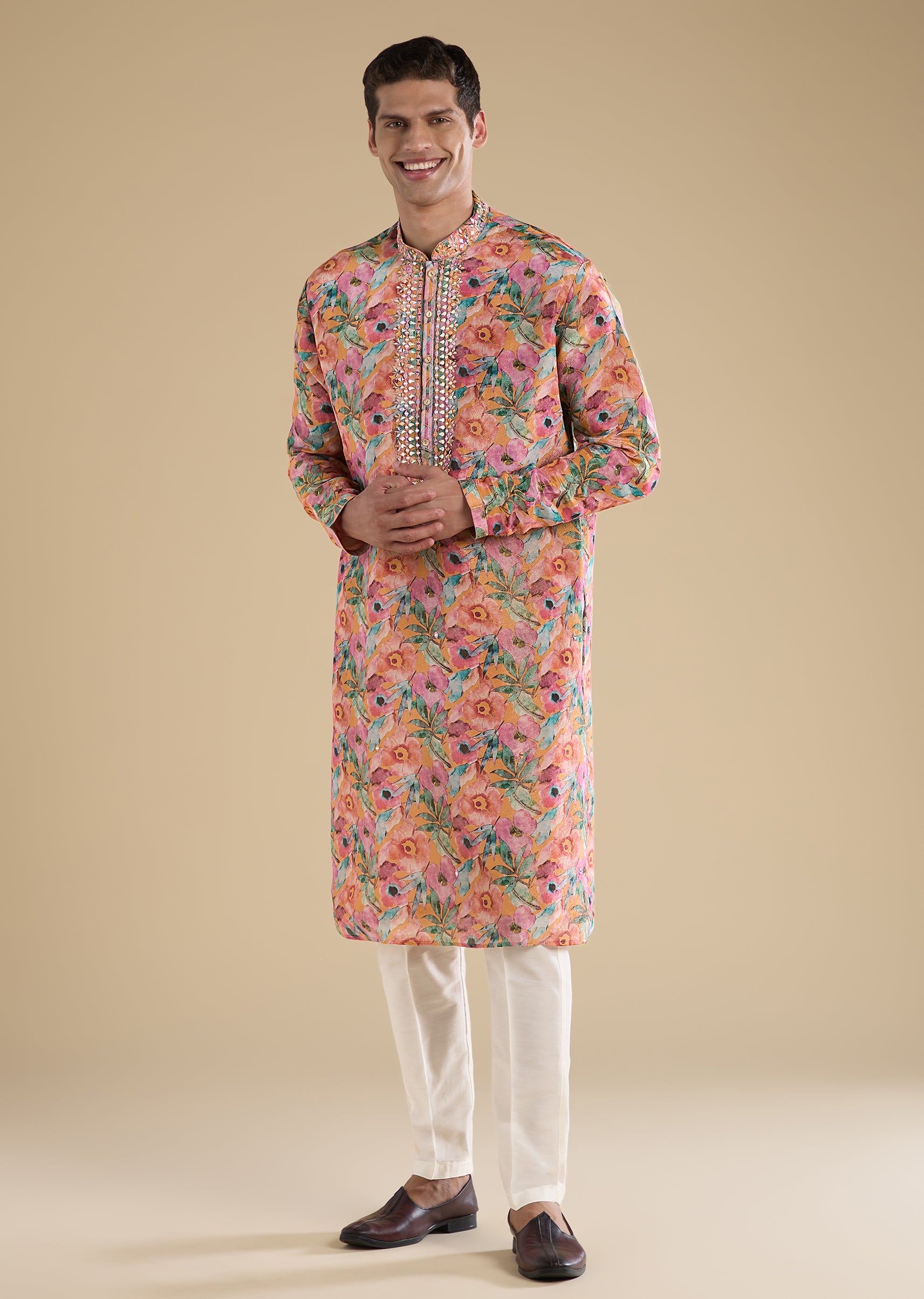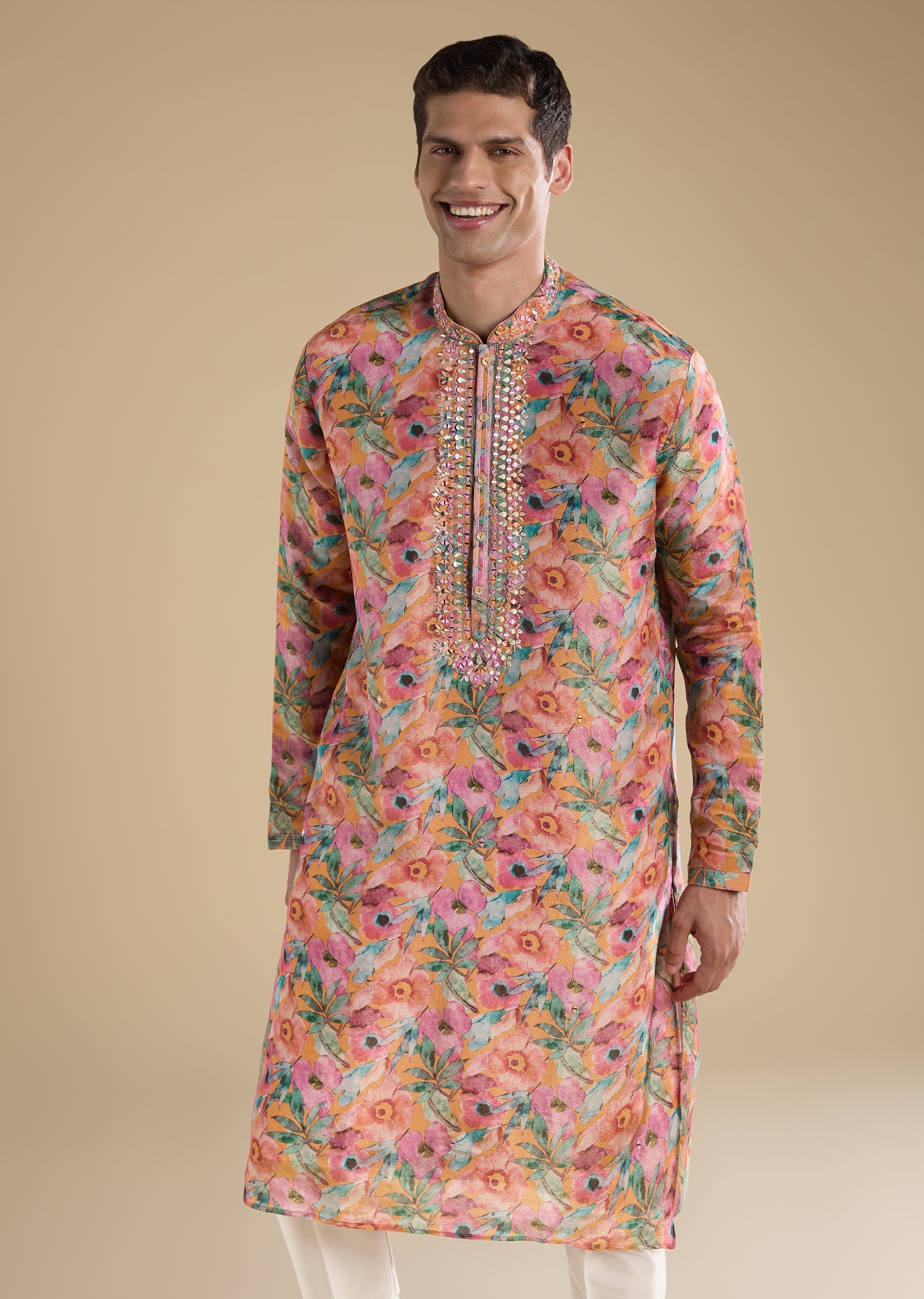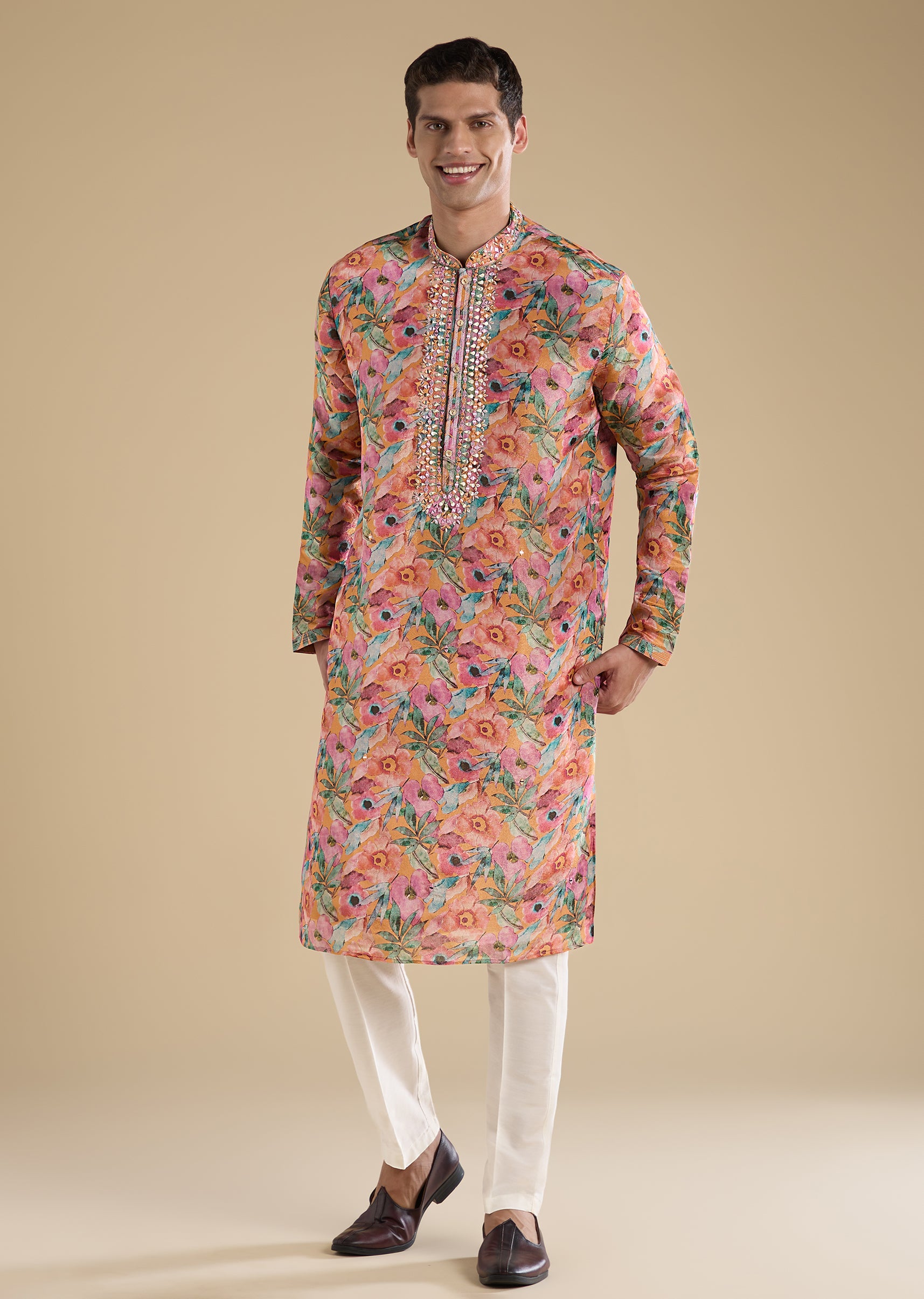 Crafted in art silk, this pink kurta set features thread embroidery with mirror work. Designed with a mandarin collar, full sleeves and front button with hook-eye closure, it is paired... More Product Details