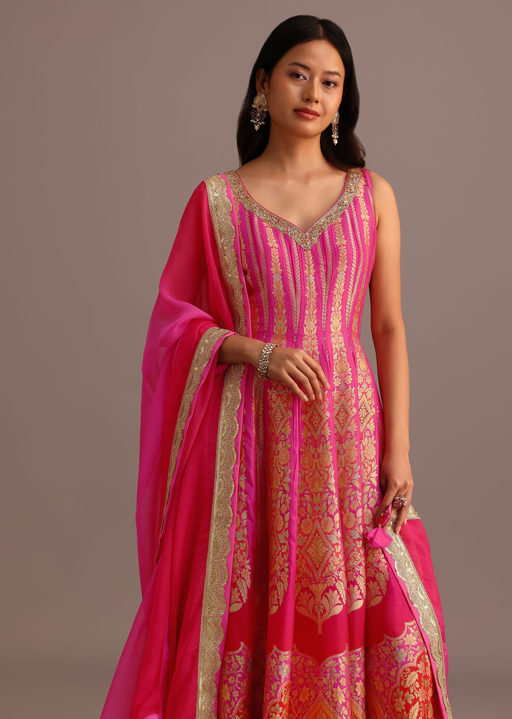 A touch of color and elegance, this pink embroidered kurta palazzo set with organza dupatta is a vision to behold. With intricate banarasi weave, cutdana, and zardosi work on the... More Product Details
