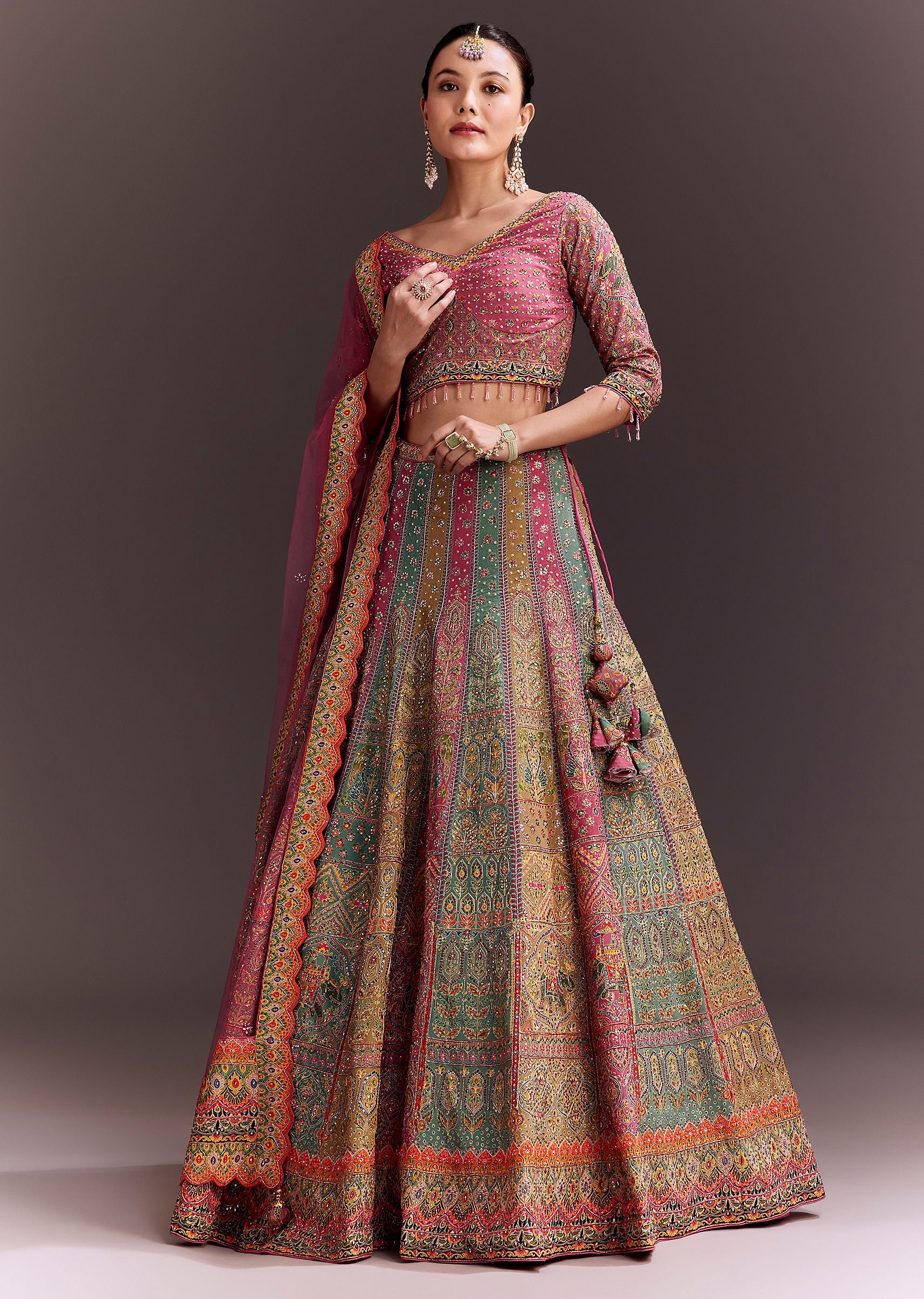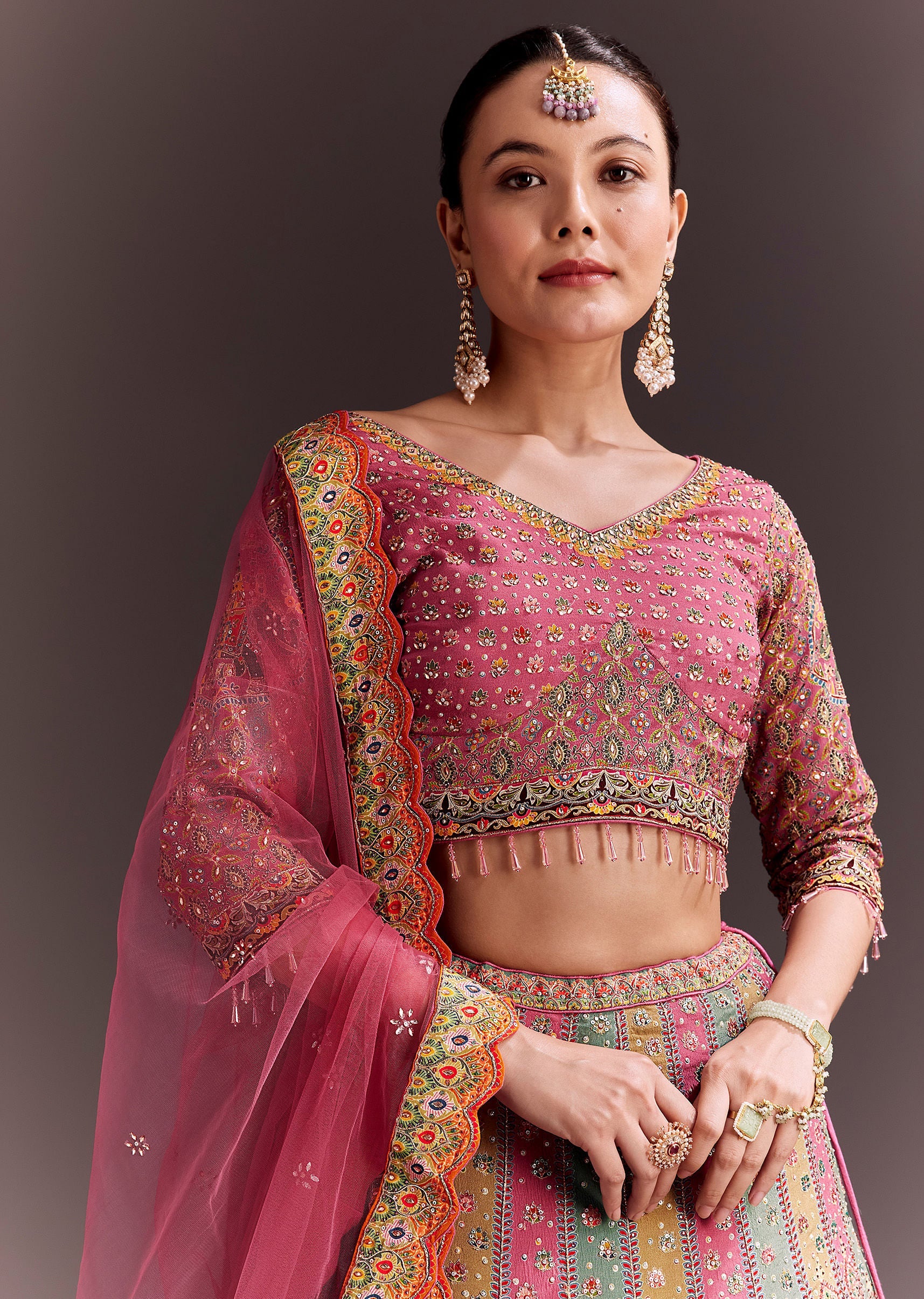 This pink embroidered lehenga set features exquisite detailing with intricate motifs and a vibrant color palette. The delicate embellishments on the multi color lehenga and blouse create a luxurious appeal.... More Product Details