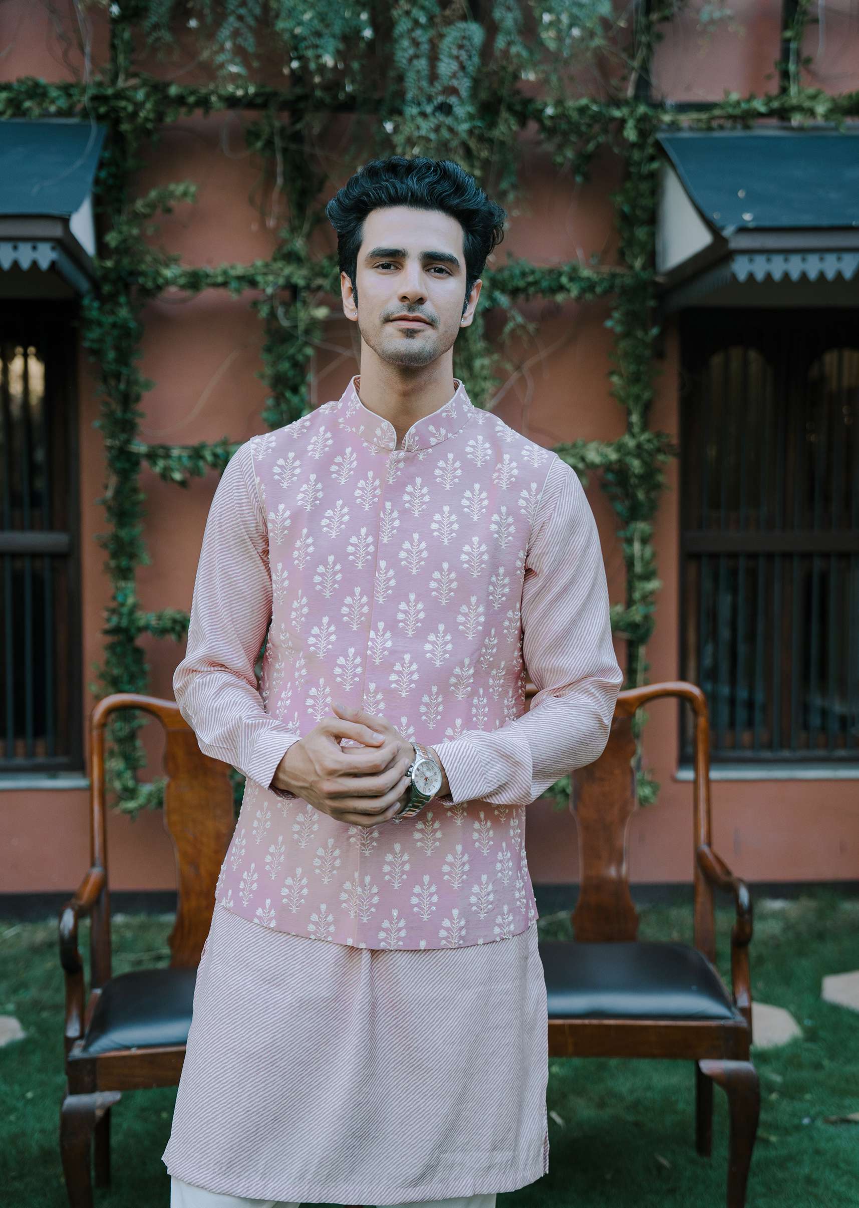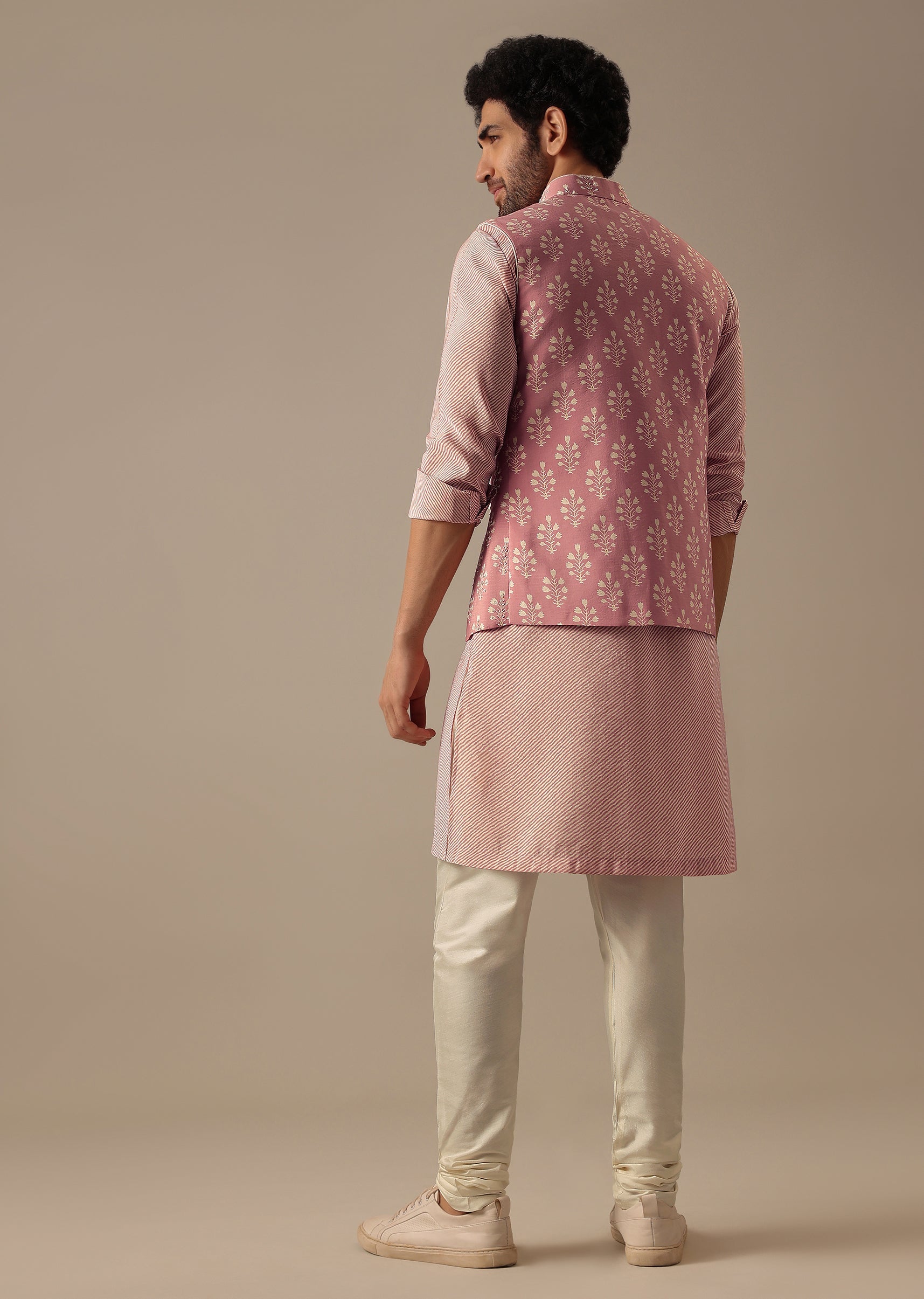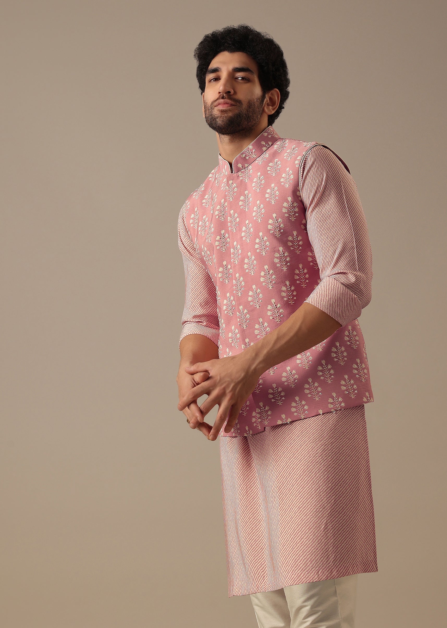 An exquisite kurta in a stunning pink hue for the fashion-savvy man. Made with blended art silk fabric, this ensemble keeps you comfortable all along. Adorned with floral buttis, you are sure to make heads turn at the next wedding celebration. Featuring cutwork detail on the bundi, it comes with a striped pattern, full-sleeve kurta, and coordinating churidar.Complete with a dainty brooch and a bejewelled juttis to steal the limelight. Awarded as the Most Trusted Brand, we're delivering styles you love, just as promised.