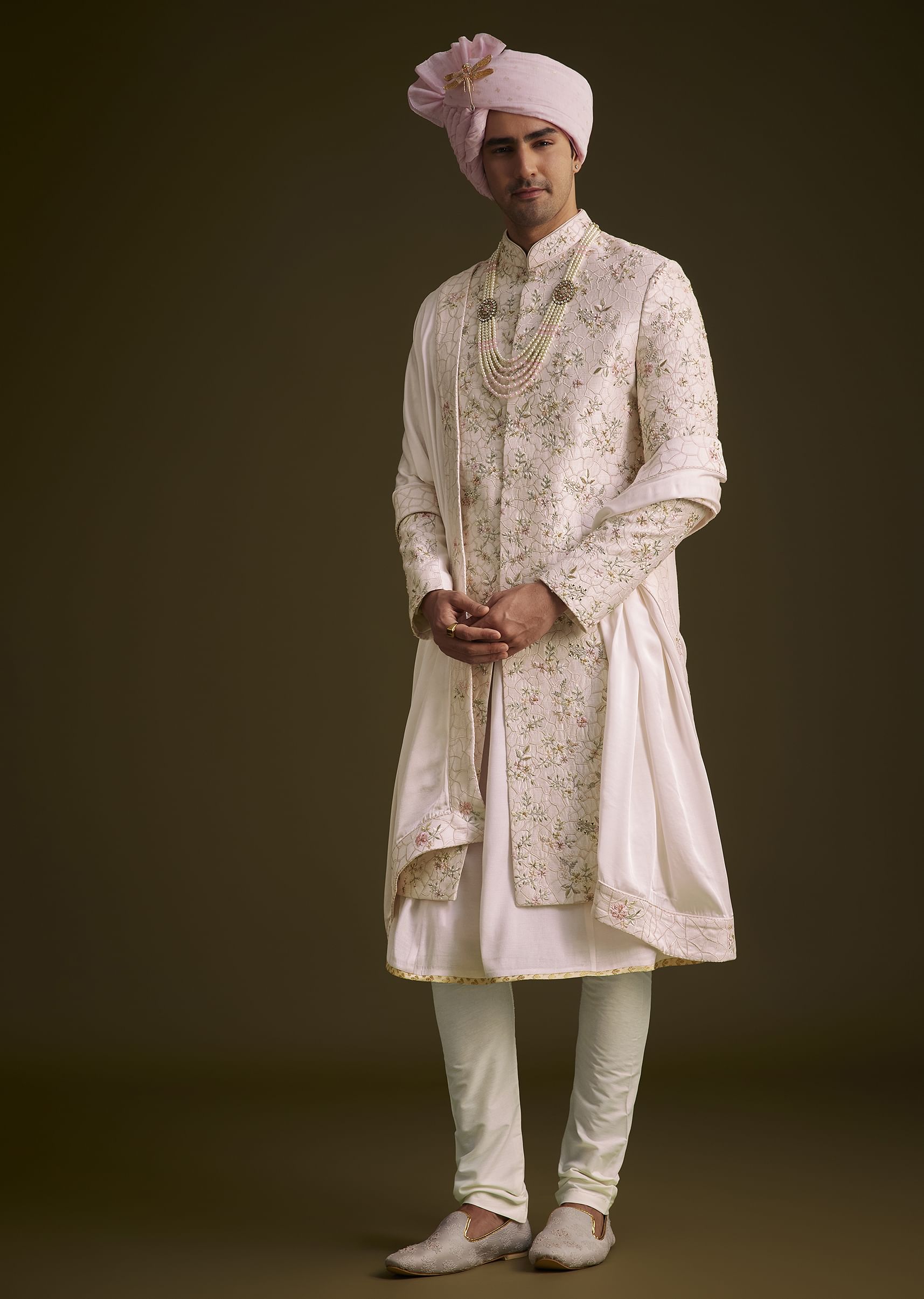 Pink Floral Embroidered Sherwani With Pearl Detailing