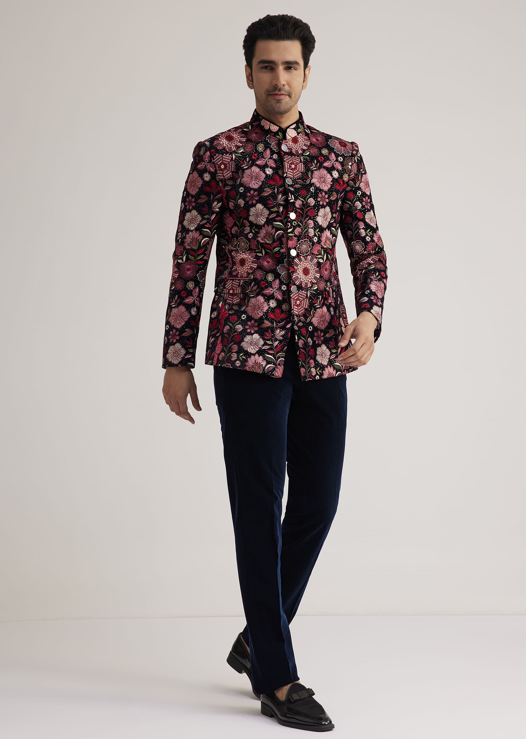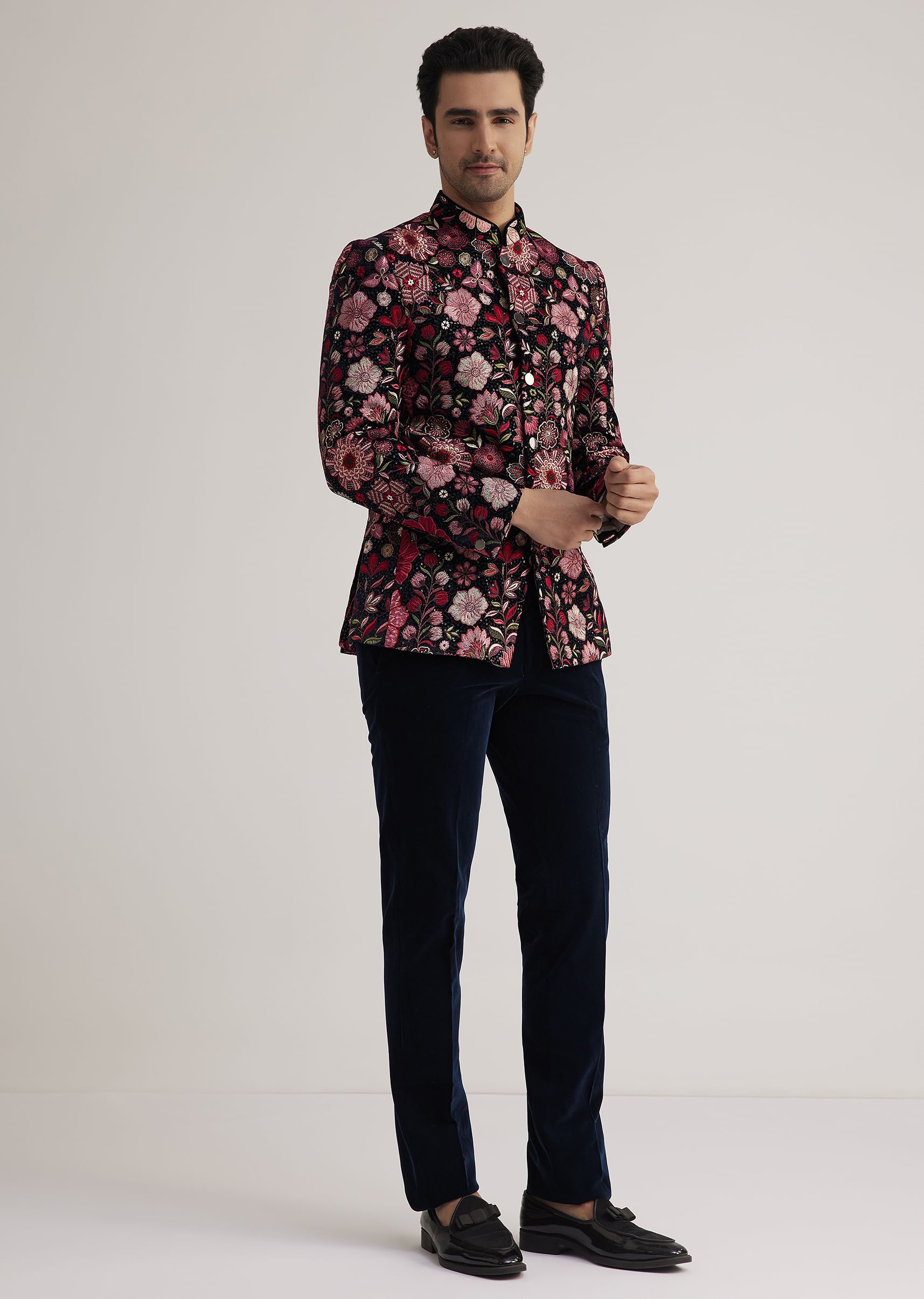 Pink Floral Embroidered Velvet Jodhpuri Suit