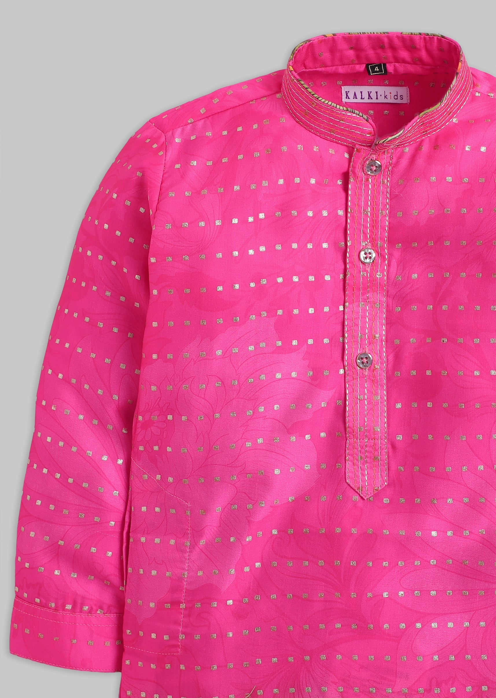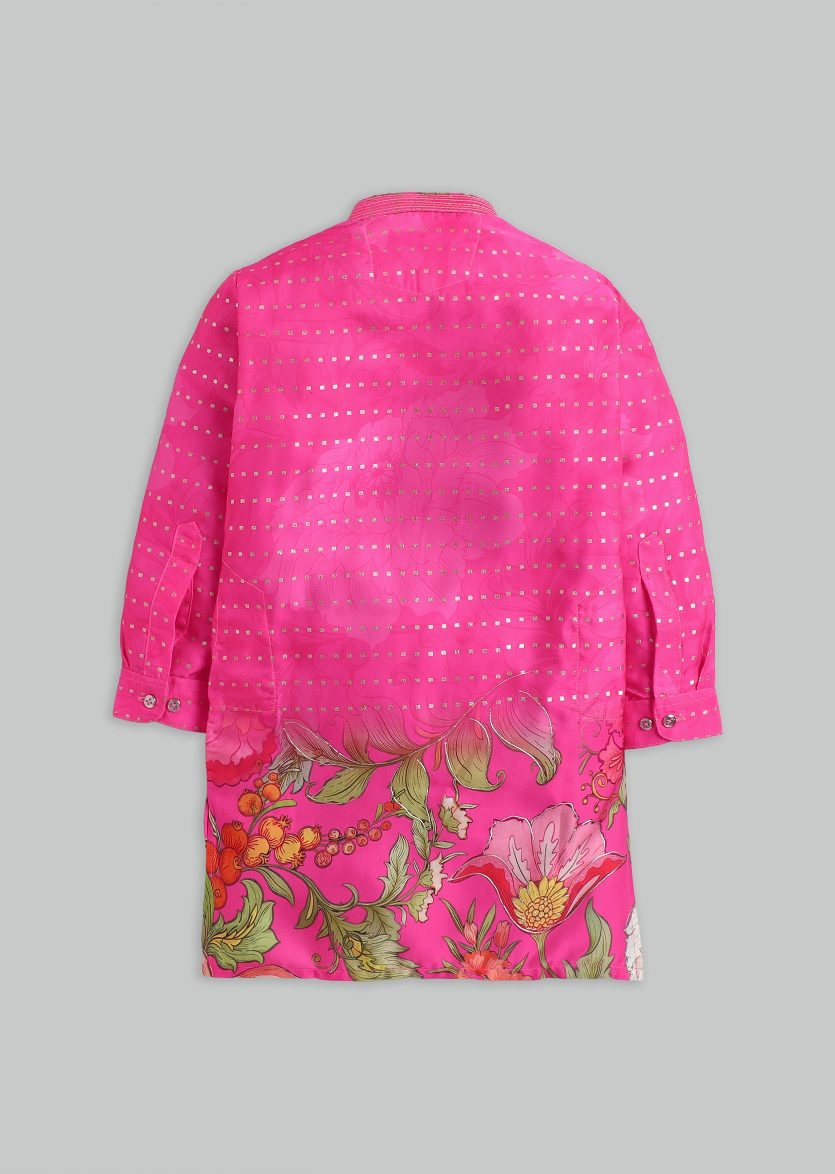 A festive silk kurta set in pink with floral foil detailing, designed with a mandarin collar and front buttons. Includes matching pants—perfect for celebrations and photo moments. Awarded as the... More Product Details