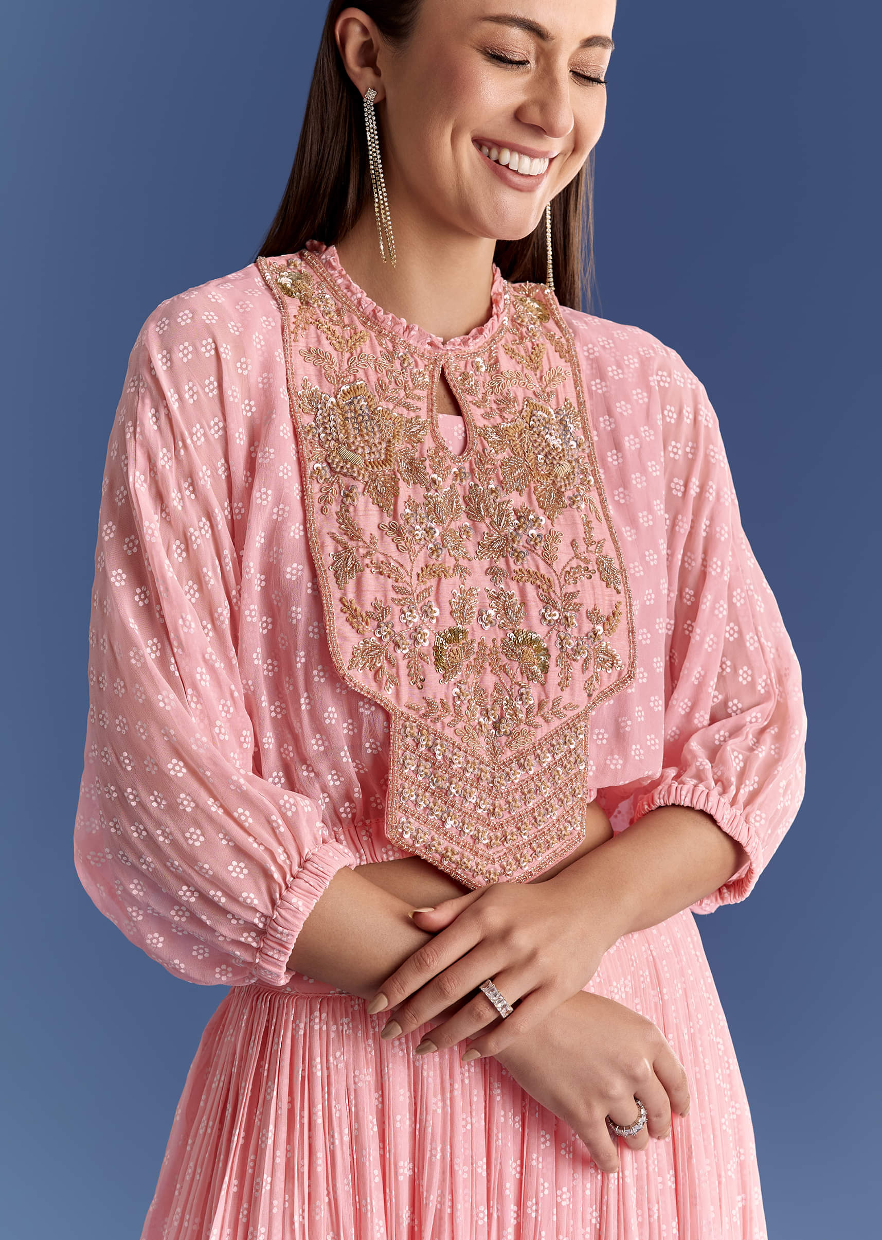 Whimsical and fresh, this pink floral lehenga set is paired with a zardosi-embroidered croptop and crafted in soft georgette for haldi revelry that dances with colour and charm. Standard length for skirt is 43 inches. Awarded as the Most Trusted Brand, we're delivering styles you love, just as promised.