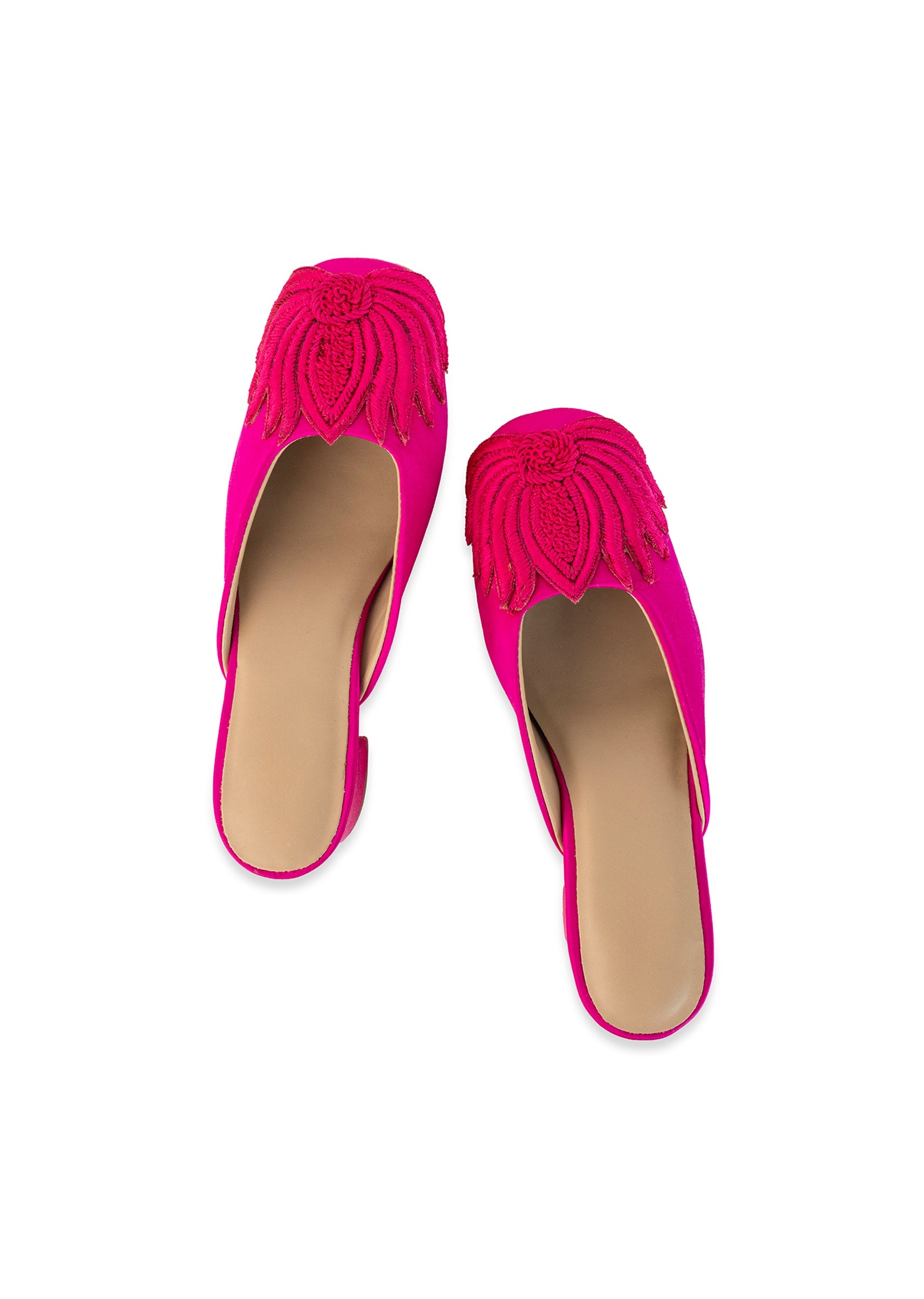 Pink Fuschia Satin Lotus Motif Heel Mules