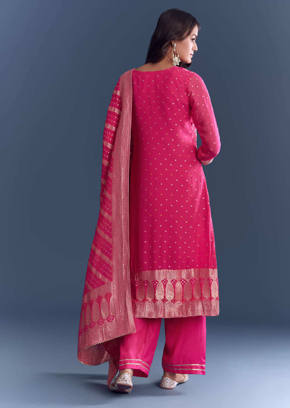 Pink Georgette Kurta Set With Bandhani Print And Jacquard Weave