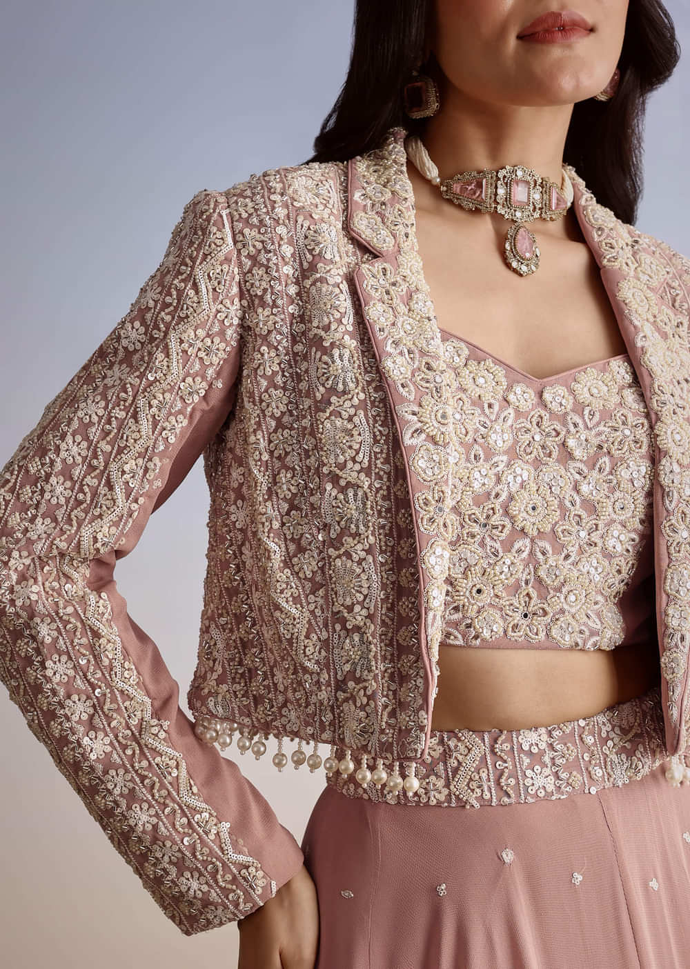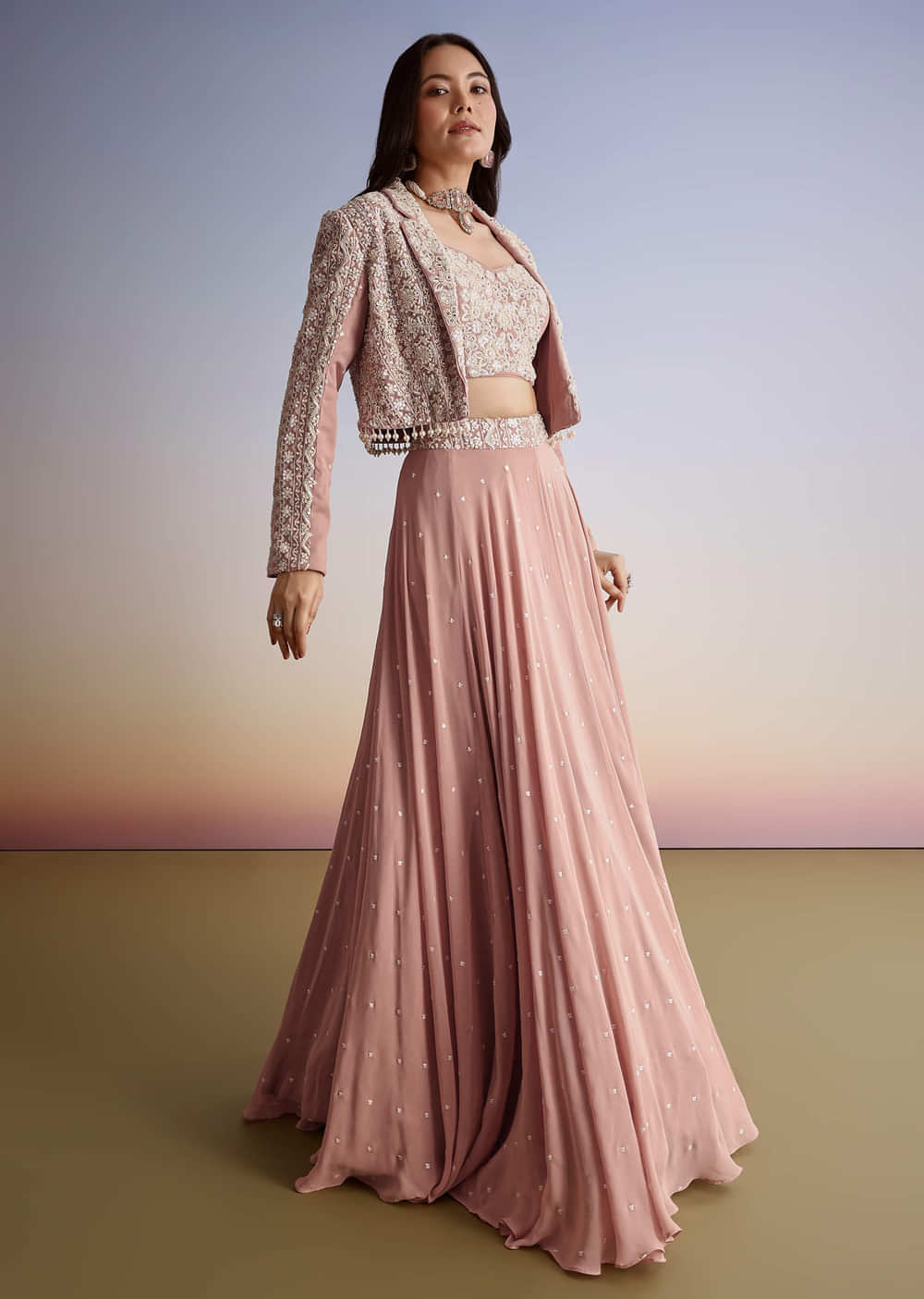 A graceful crop top and jacket combo in pink georgette, decked with moti and resham embroidery. Flowing silhouette perfect for sangeet or engagement nights. Comes with matching bottom for a... More Product Details