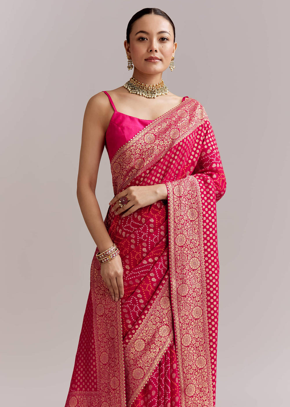 Pink Georgette Woven Saree With Floral Border And Bandhani Print
