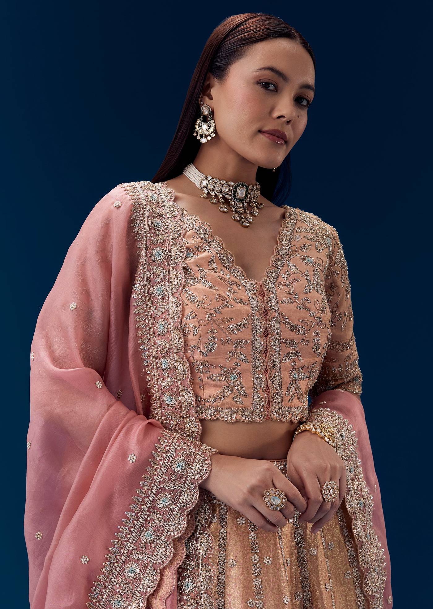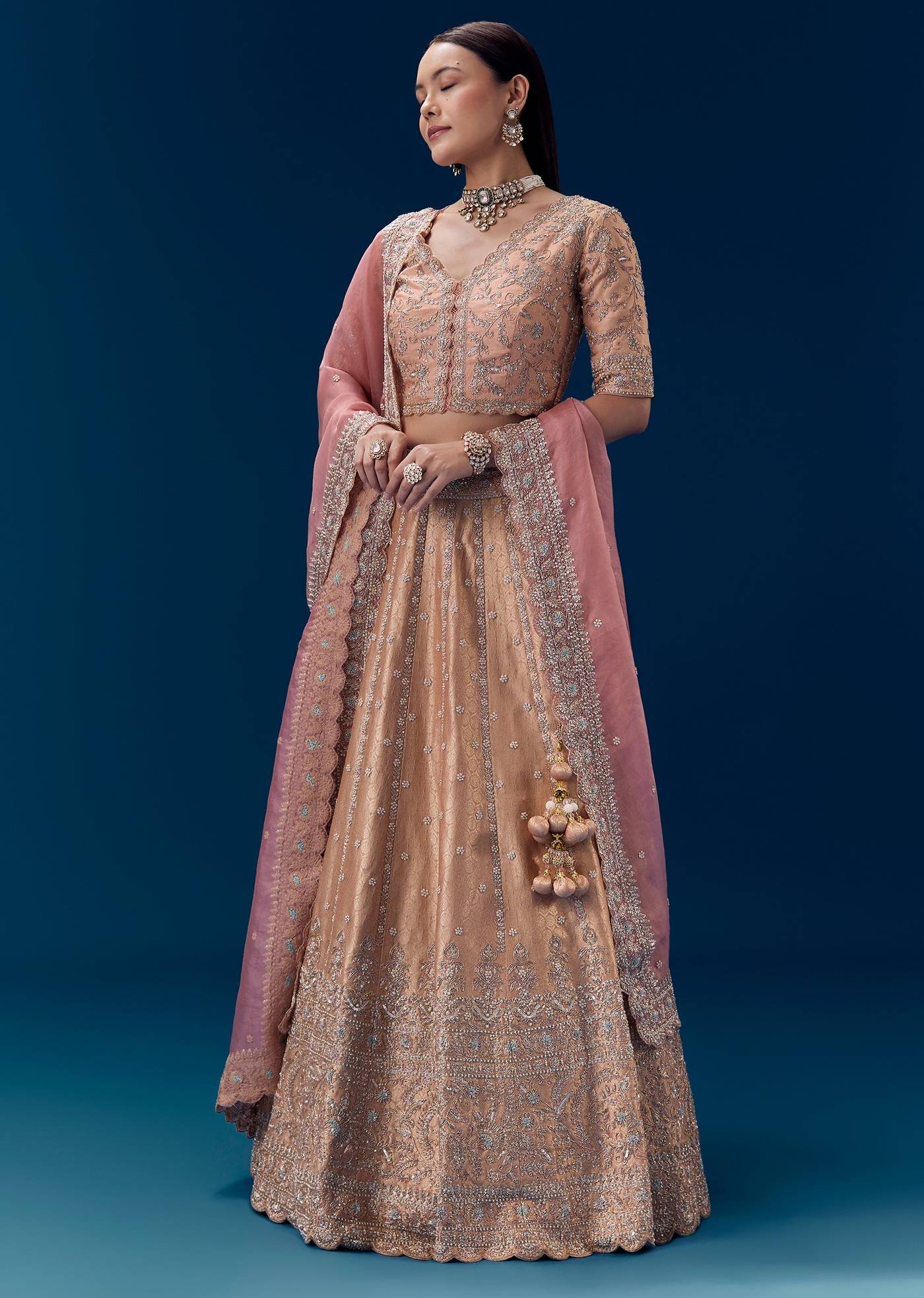 This pink lehenga set features a beautifully crafted lehenga and blouse made in net and georgette inspired fabrics, enriched with heavy embroidery, sequins, motifs, and resham thread work for a... More Product Details