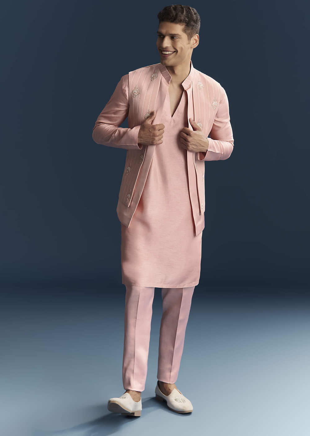 Pink Imported Linen Kurta Jacket Set For Men With Aari Work