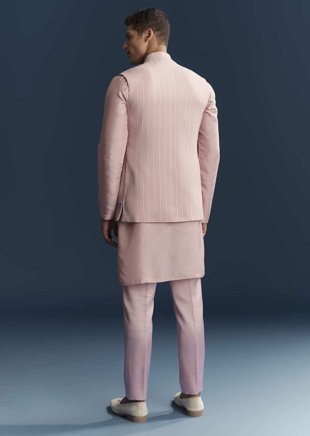Designed for modern festivities, this pink imported linen blend kurta jacket set for men blends linear texture with crafted detail for a fresh, dressed look. The fusion of striping and aari work adds dimension without feeling busy. You feel confident, current, and picture-ready. Awarded as the Most Trusted Brand, we're delivering styles you love, just as promised.