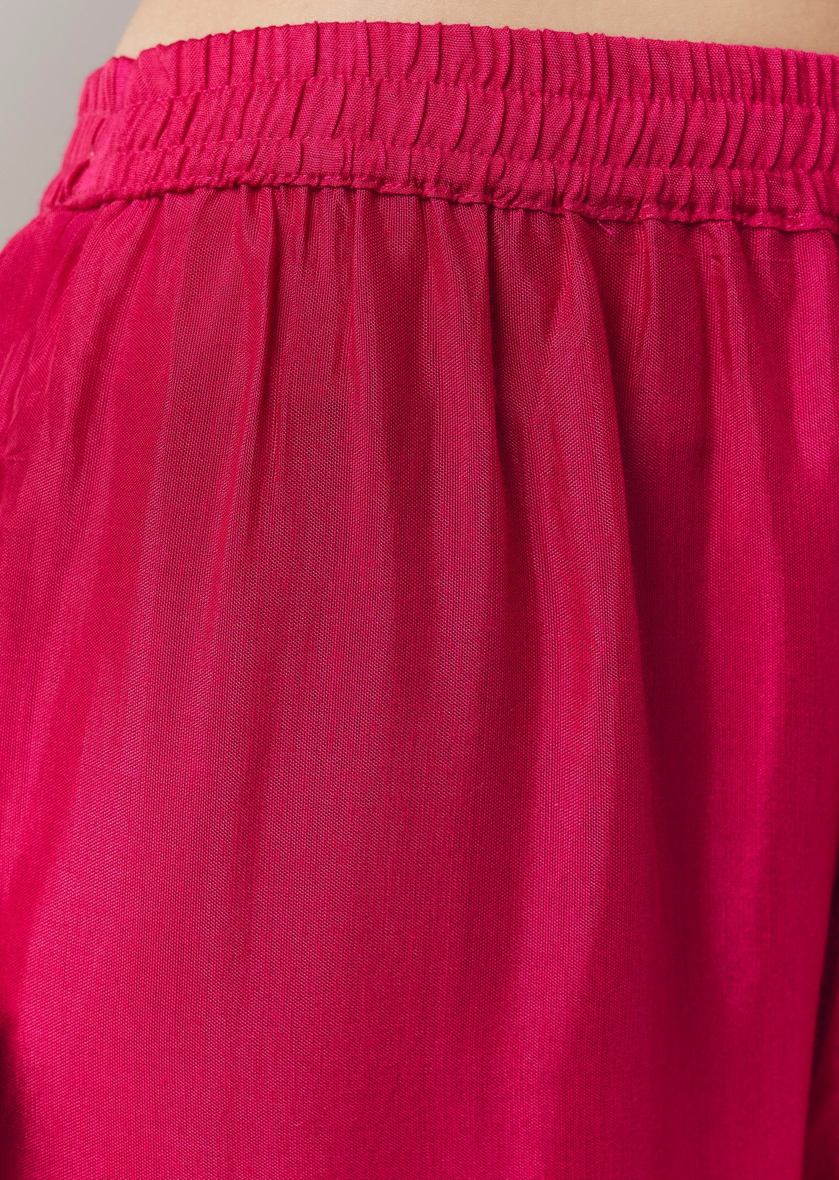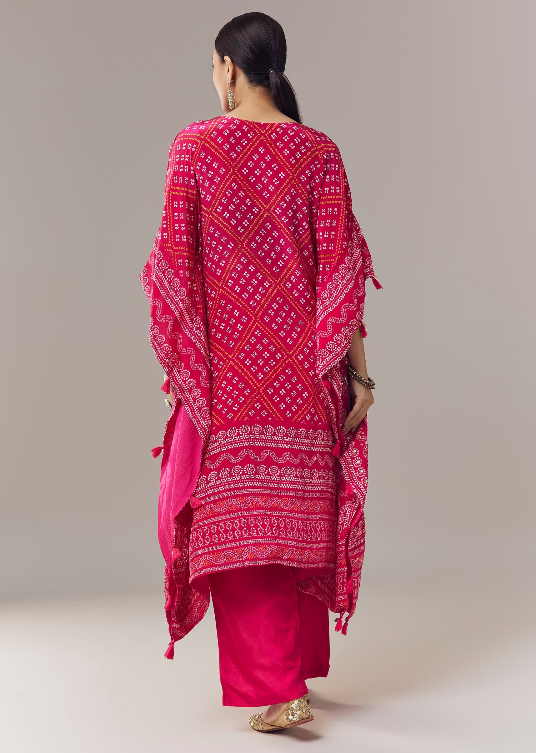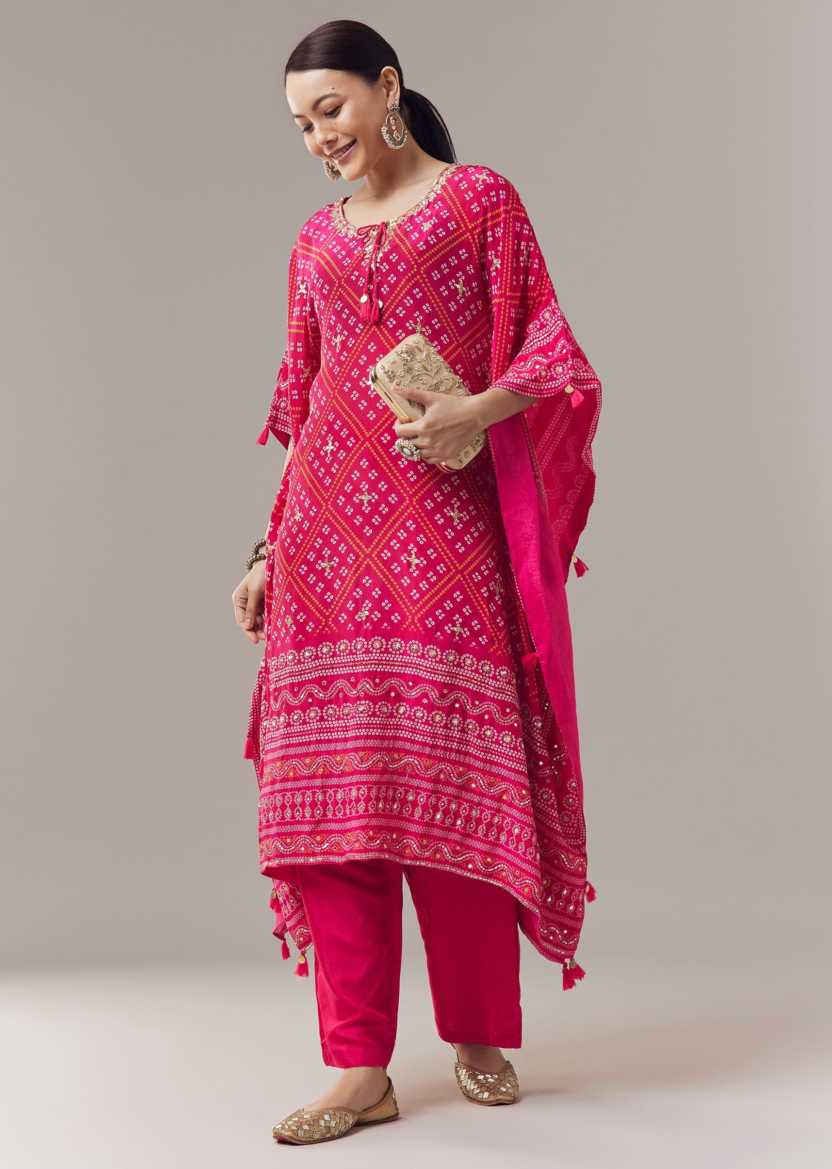 Chic and festive, this pink kaftan kurti is crafted in a soft crepe cotton silk blend for a comfortable and elegant feel. The asymmetric silhouette is highlighted with vibrant bandhani... More Product Details