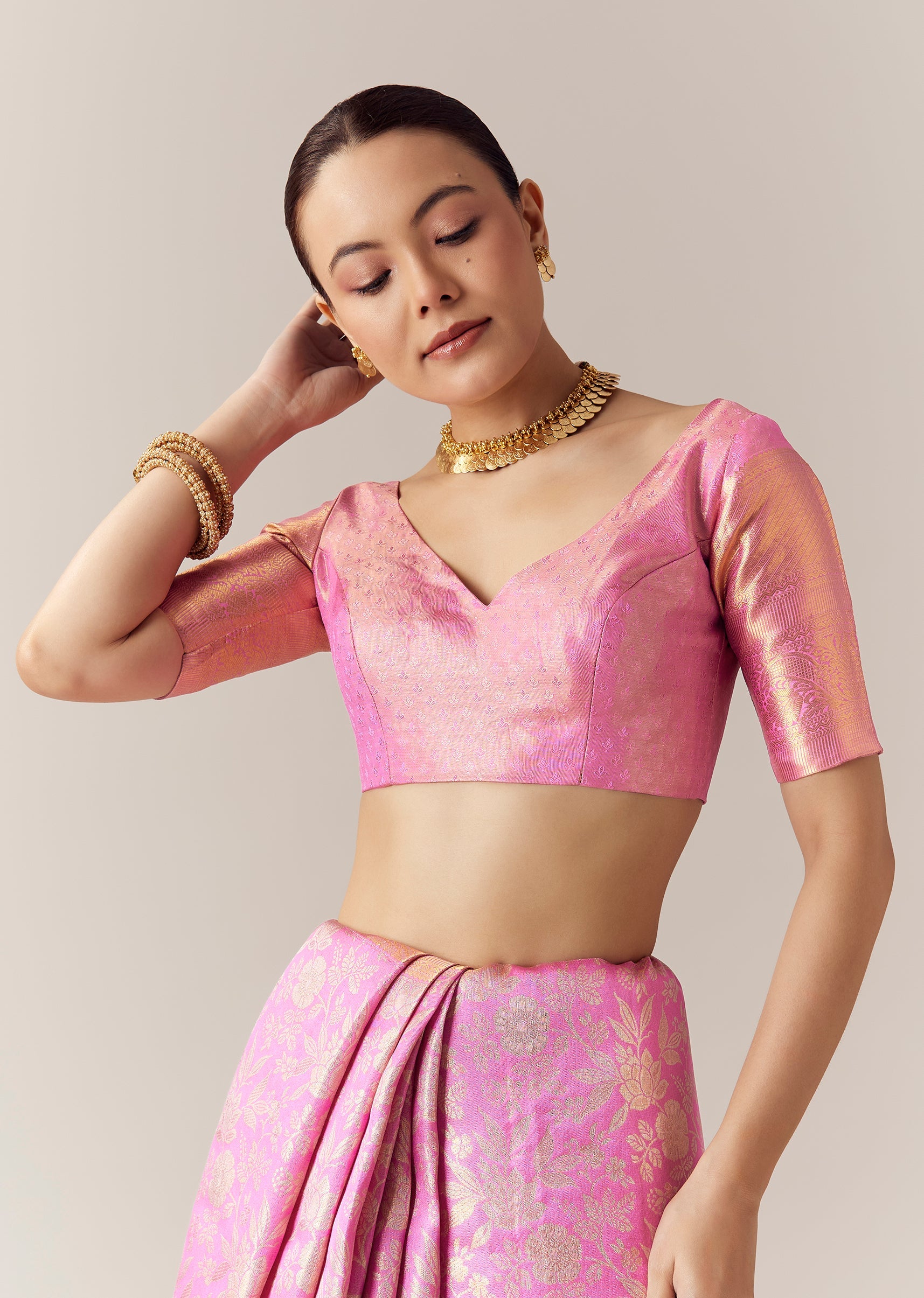 Pair it with temple jewelry or kundan pieces, a classic bun, and soft glowing makeup to highlight its vibrant pink and golden weave.
