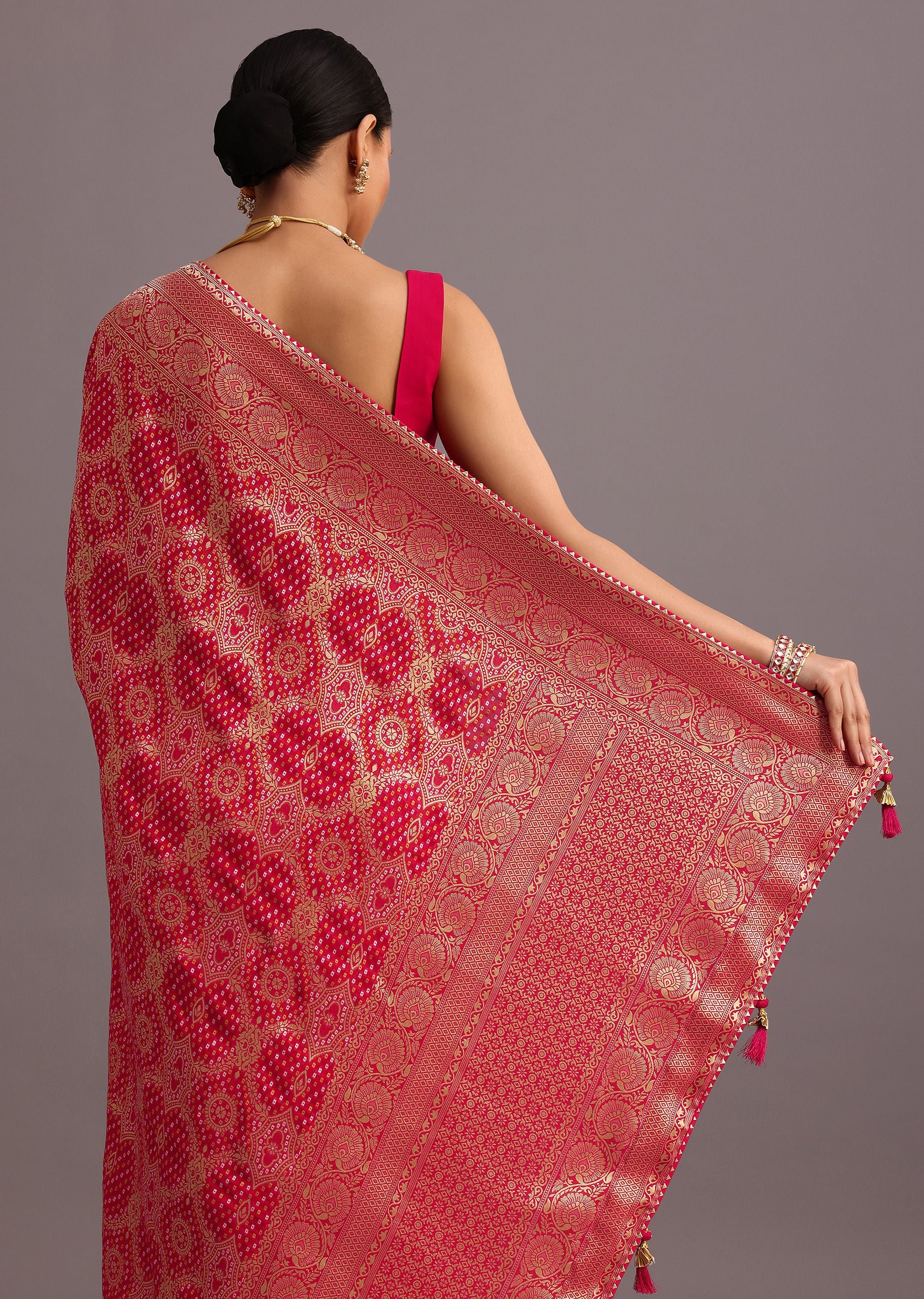 A delicate dream in pink. Imagine a soft, flowing khadi georgette saree, adorned with intricate gota patti embroidery that shimmers like starlight. The unstitched blouse offers a canvas for your... More Product Details