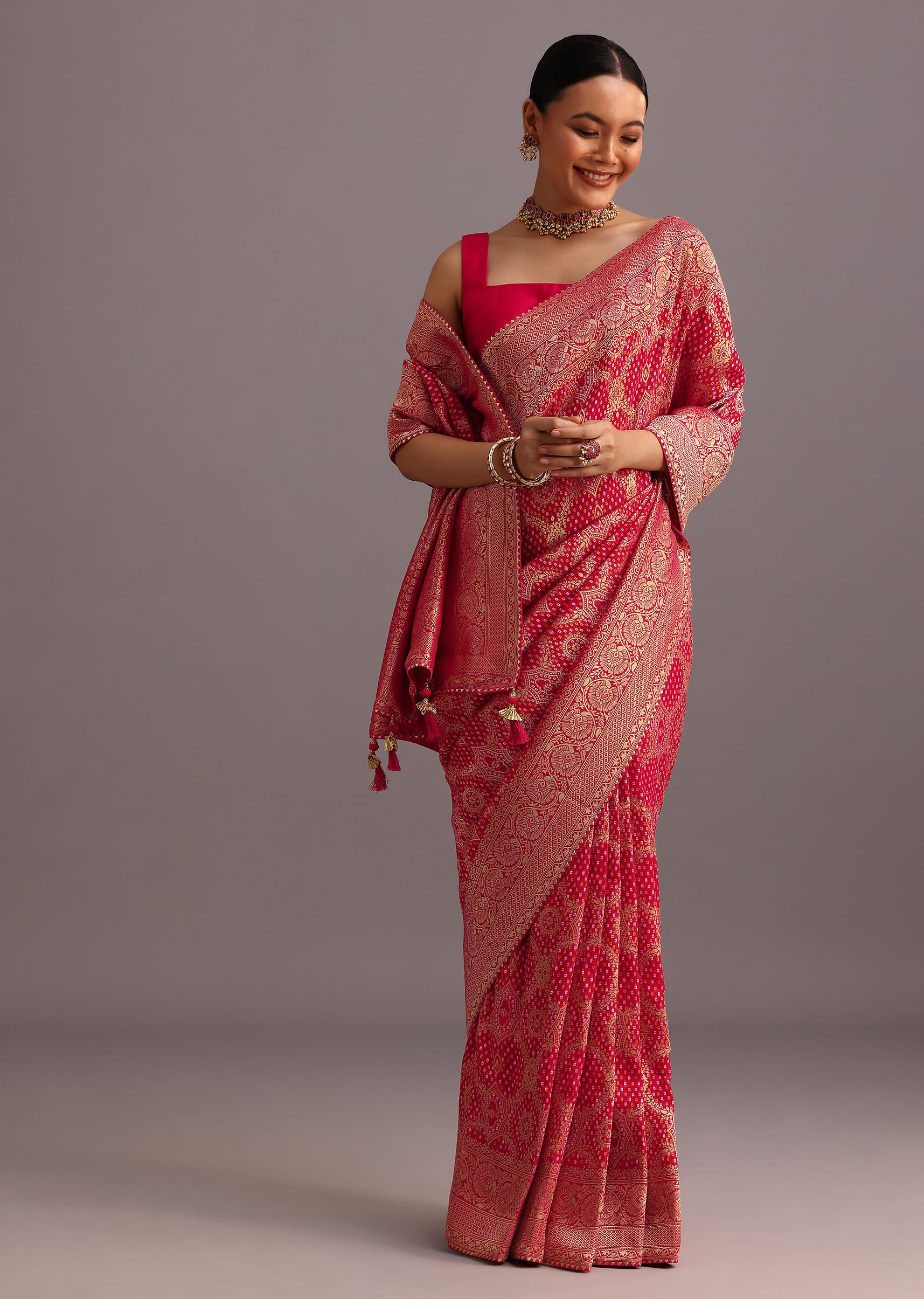 A delicate dream in pink. Imagine a soft, flowing khadi georgette saree, adorned with intricate gota patti embroidery that shimmers like starlight. The unstitched blouse offers a canvas for your personal style, whether you prefer a classic neckline or a modern twist. This ensemble is a perfect blend of tradition and contemporary elegance, ideal for a special occasion. Awarded as the Most Trusted Brand, we're delivering styles you love, just as promised.