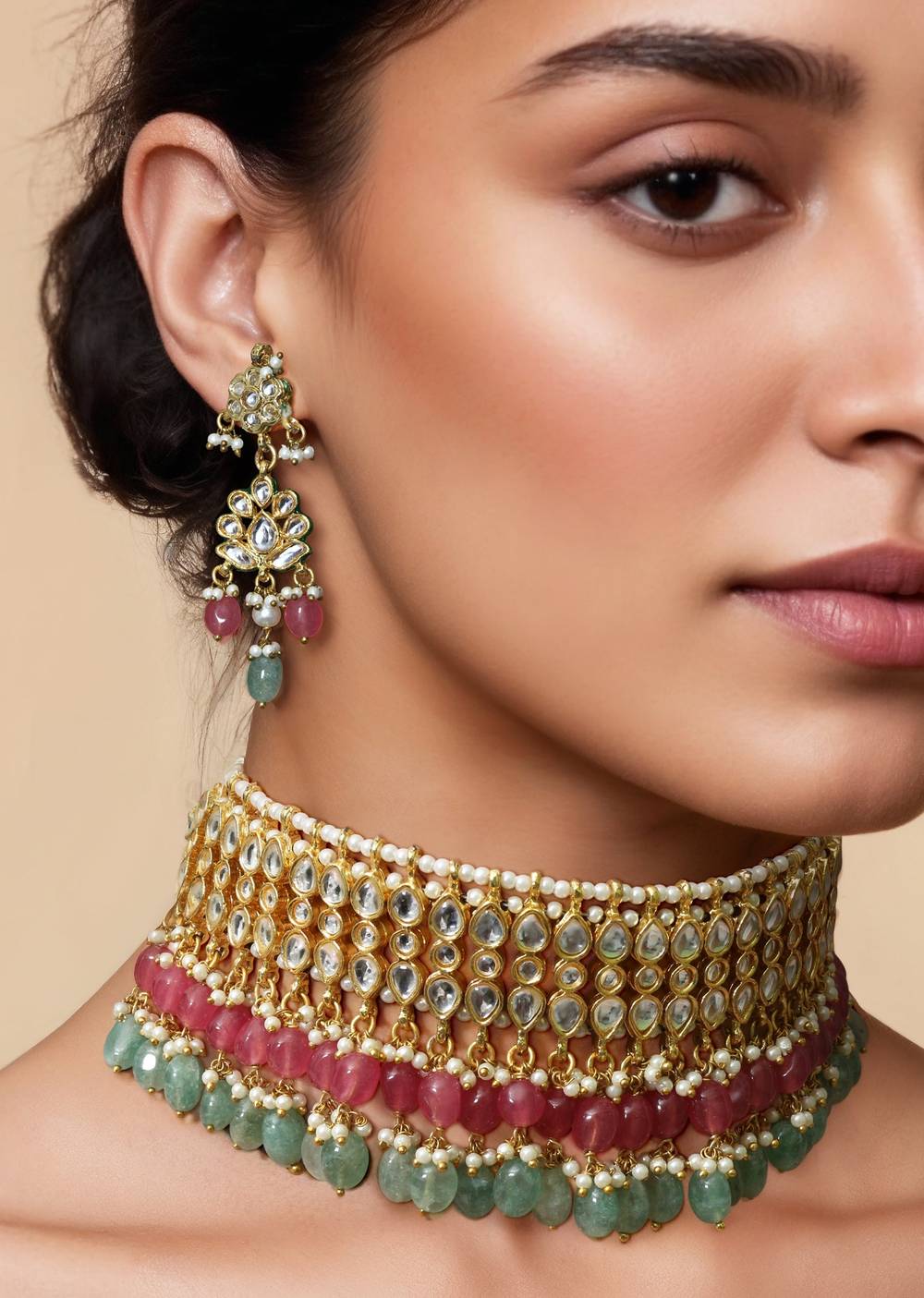 Pink Kundan Beaded Drop Choker Necklace Set