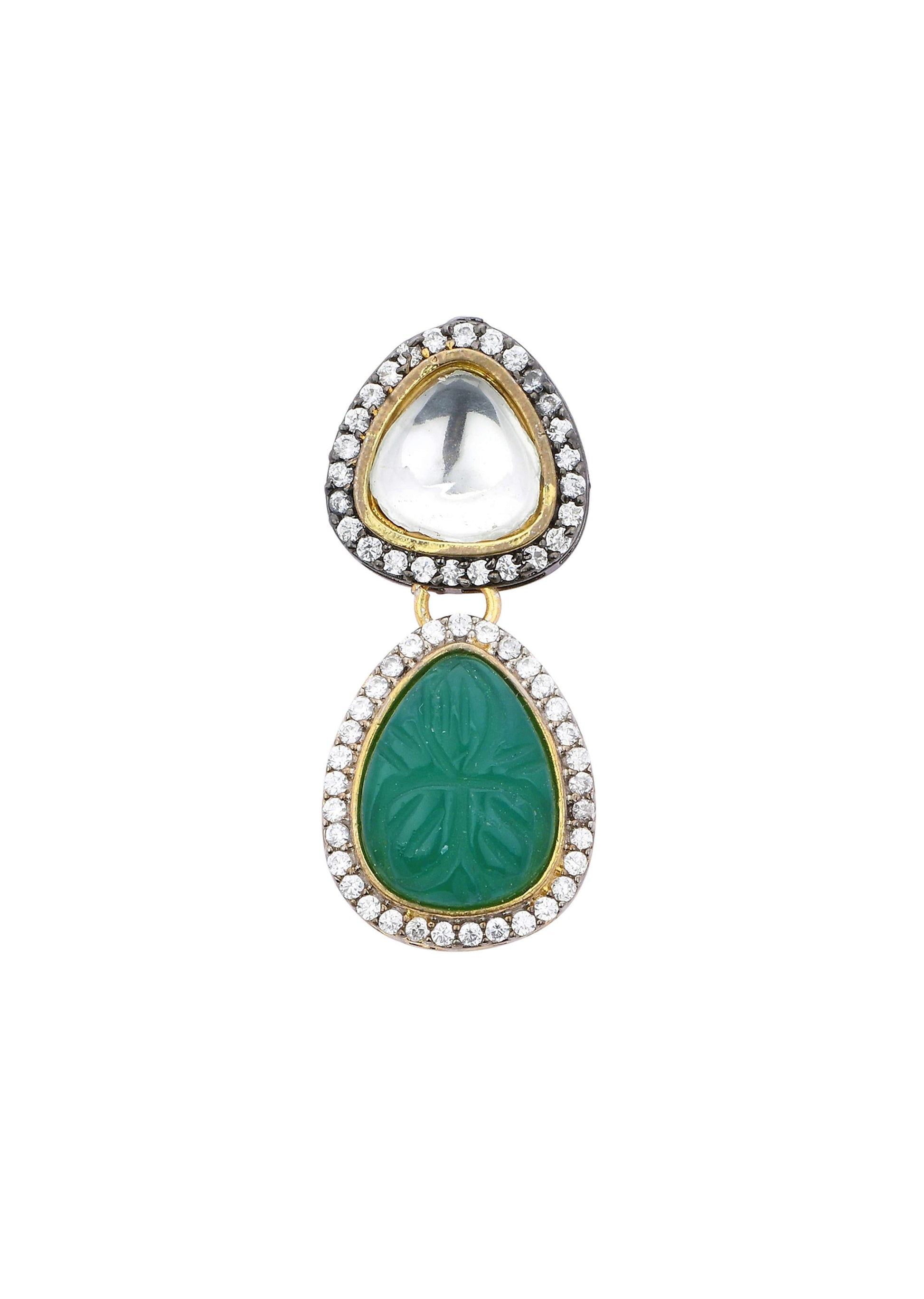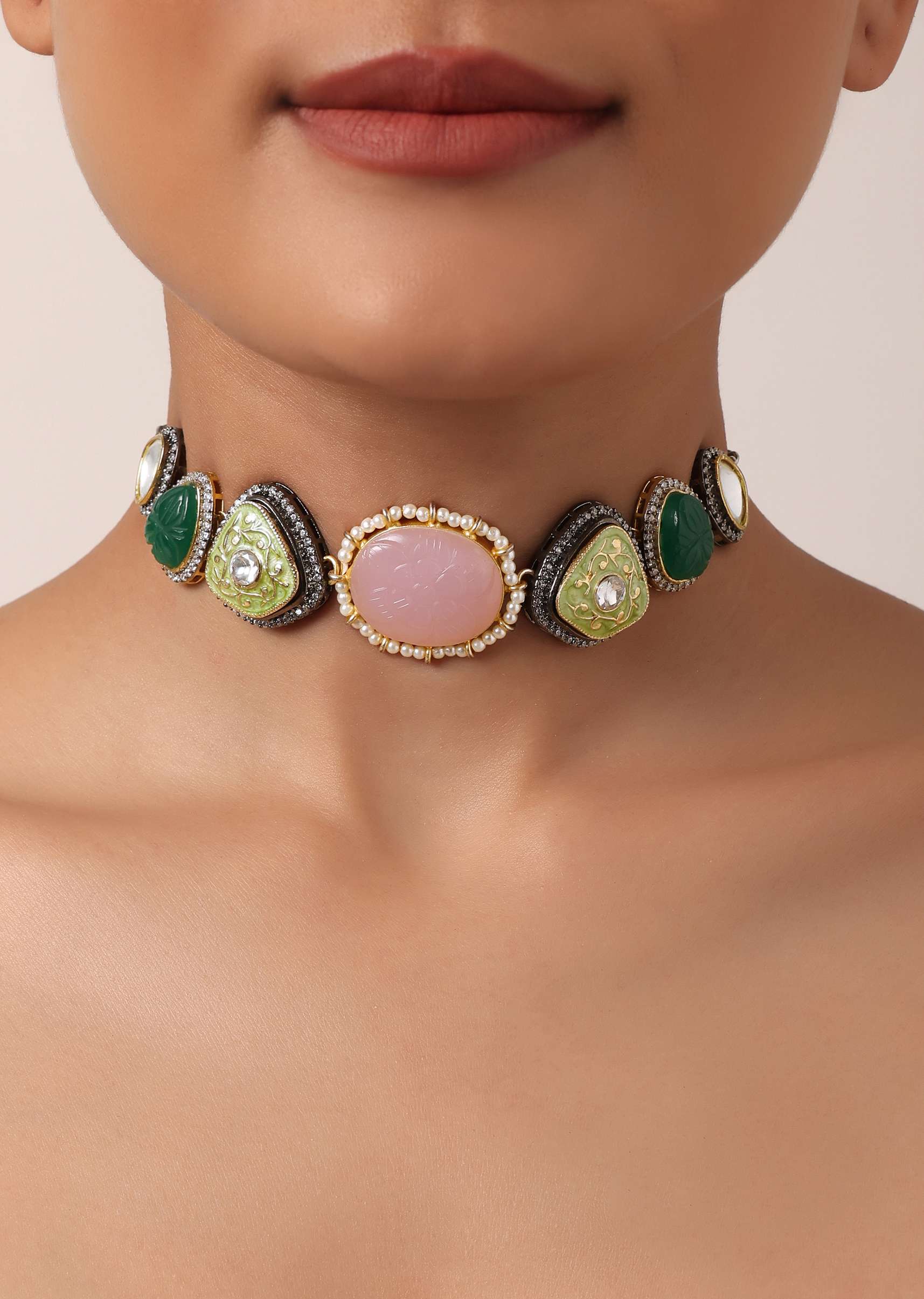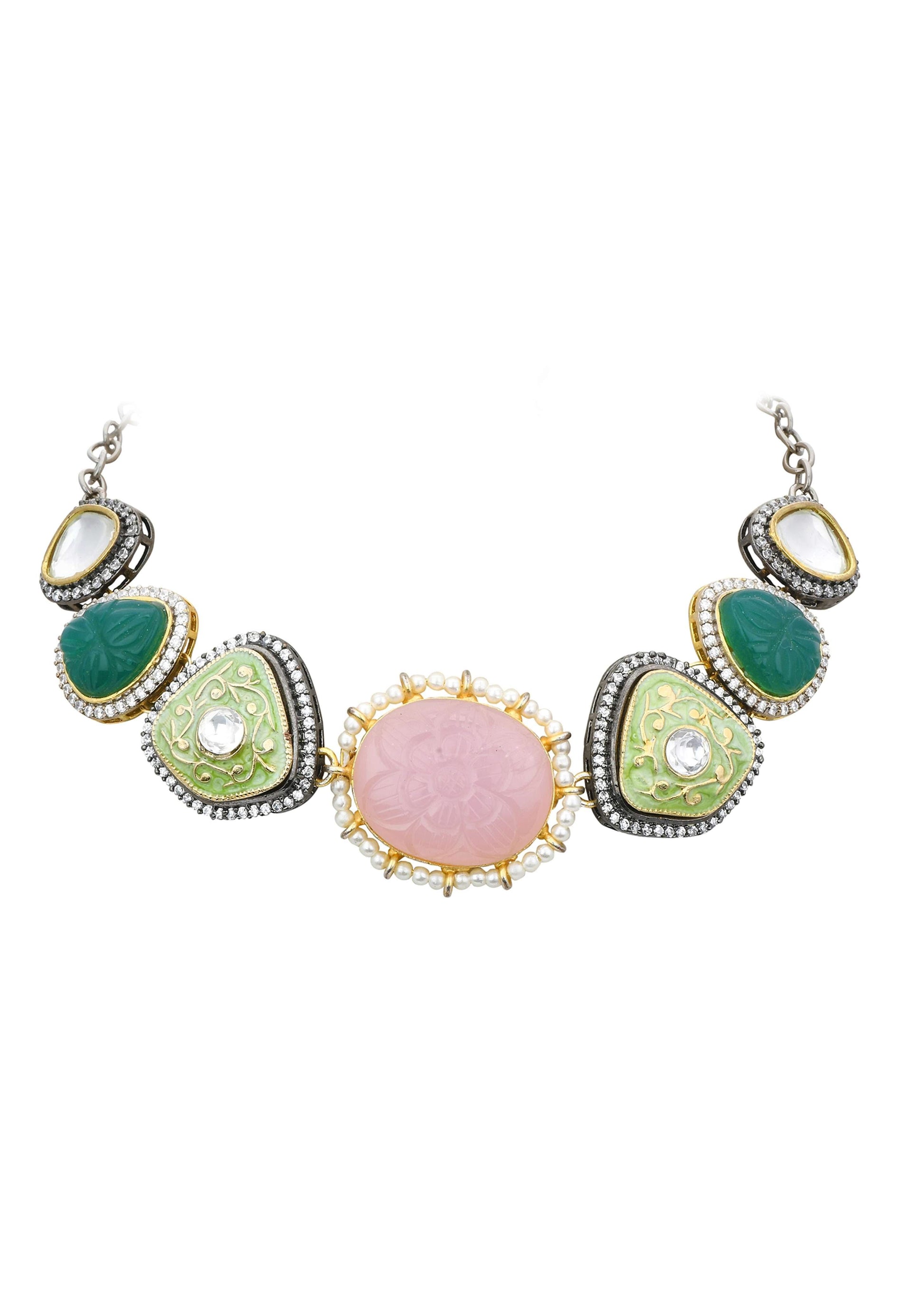 Featuring our exquisite choker set that is a beautiful blend of modernity and traditional craftsmanship. Set on a two-tone finish mix metal base, it is adorned with delicately cut colorful... More Product Details