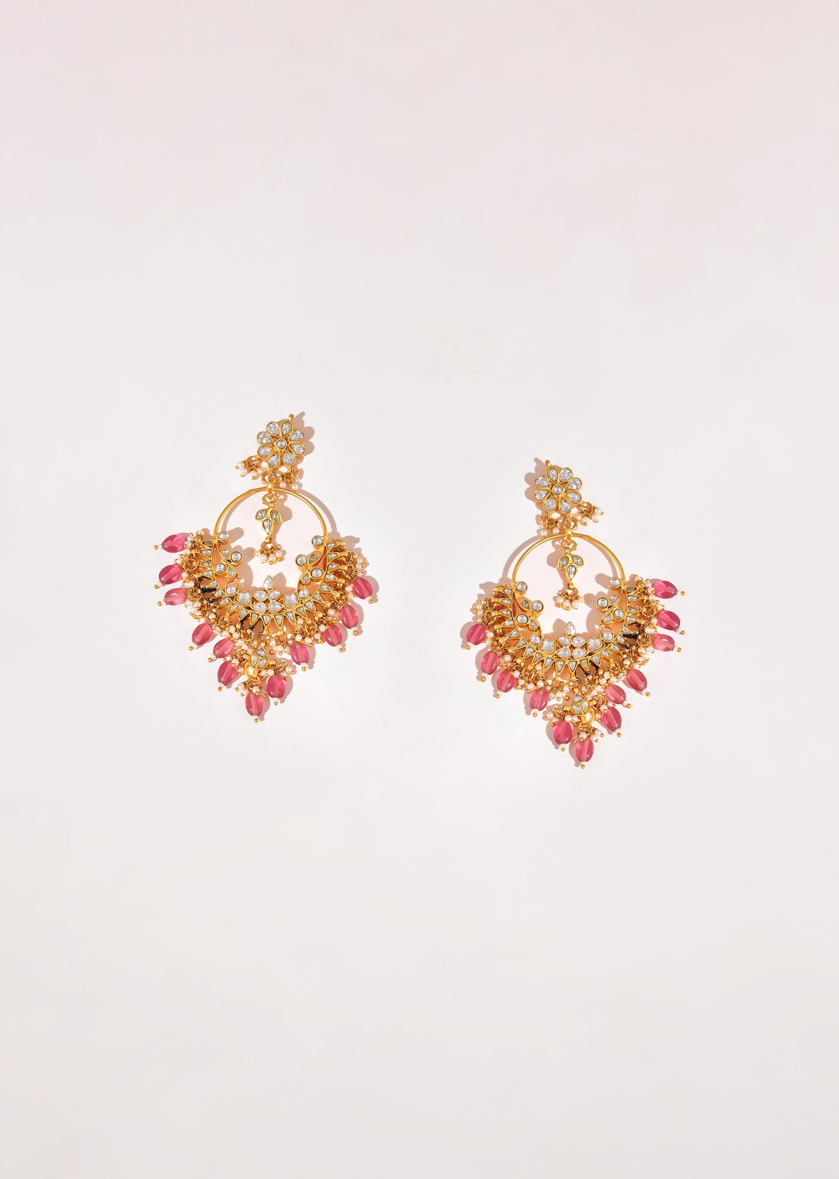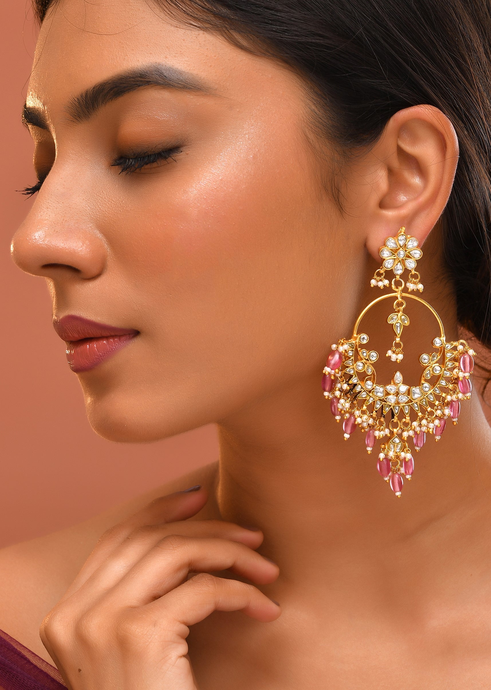 Turn heads with these pink kundan oversized bead drop earrings, crafted with intricate detailing and bold drops for a striking festive look. Perfect for weddings or special occasions, they add... More Product Details