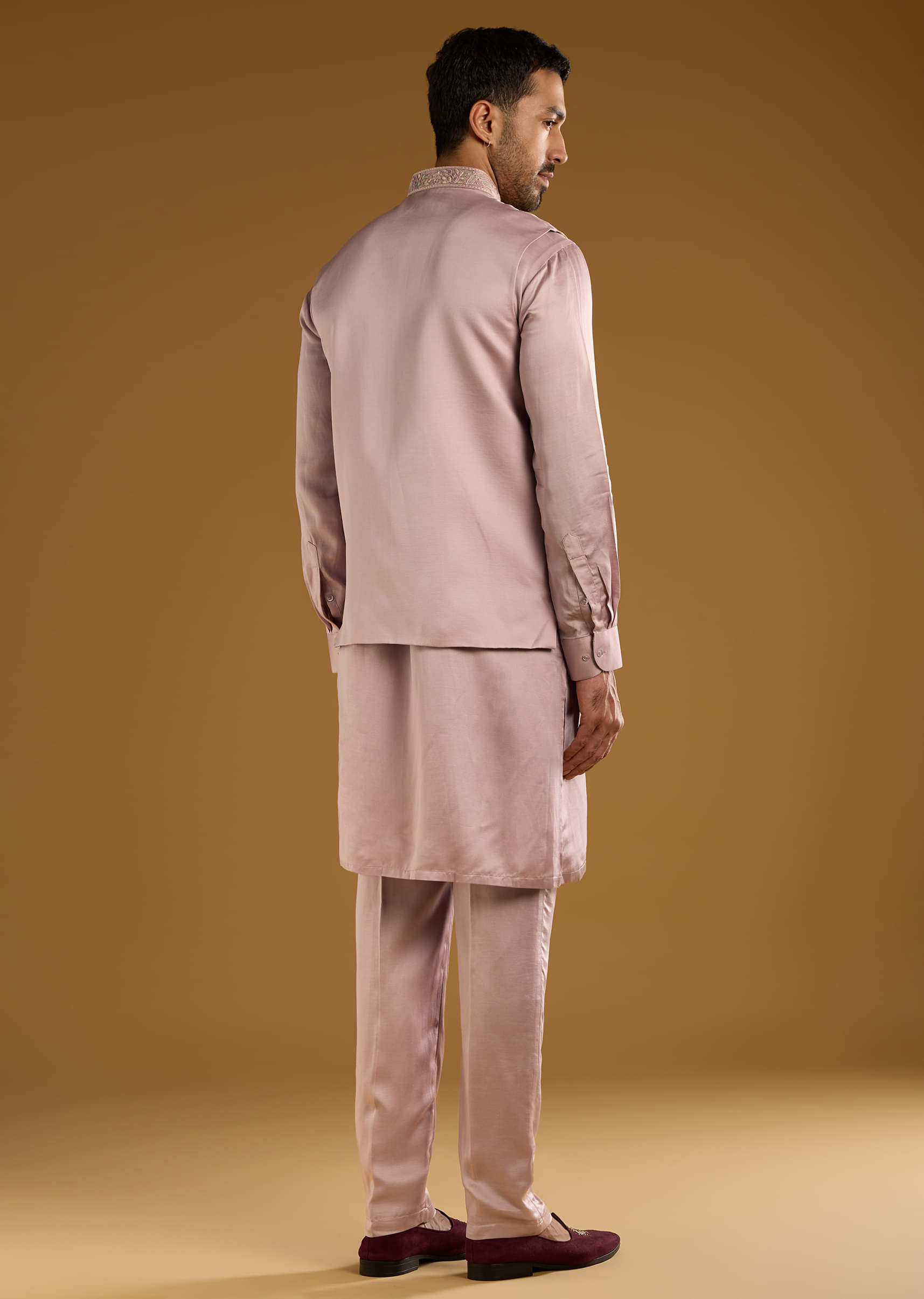 Pink Kurta Jacket Set For Men With Thread Work