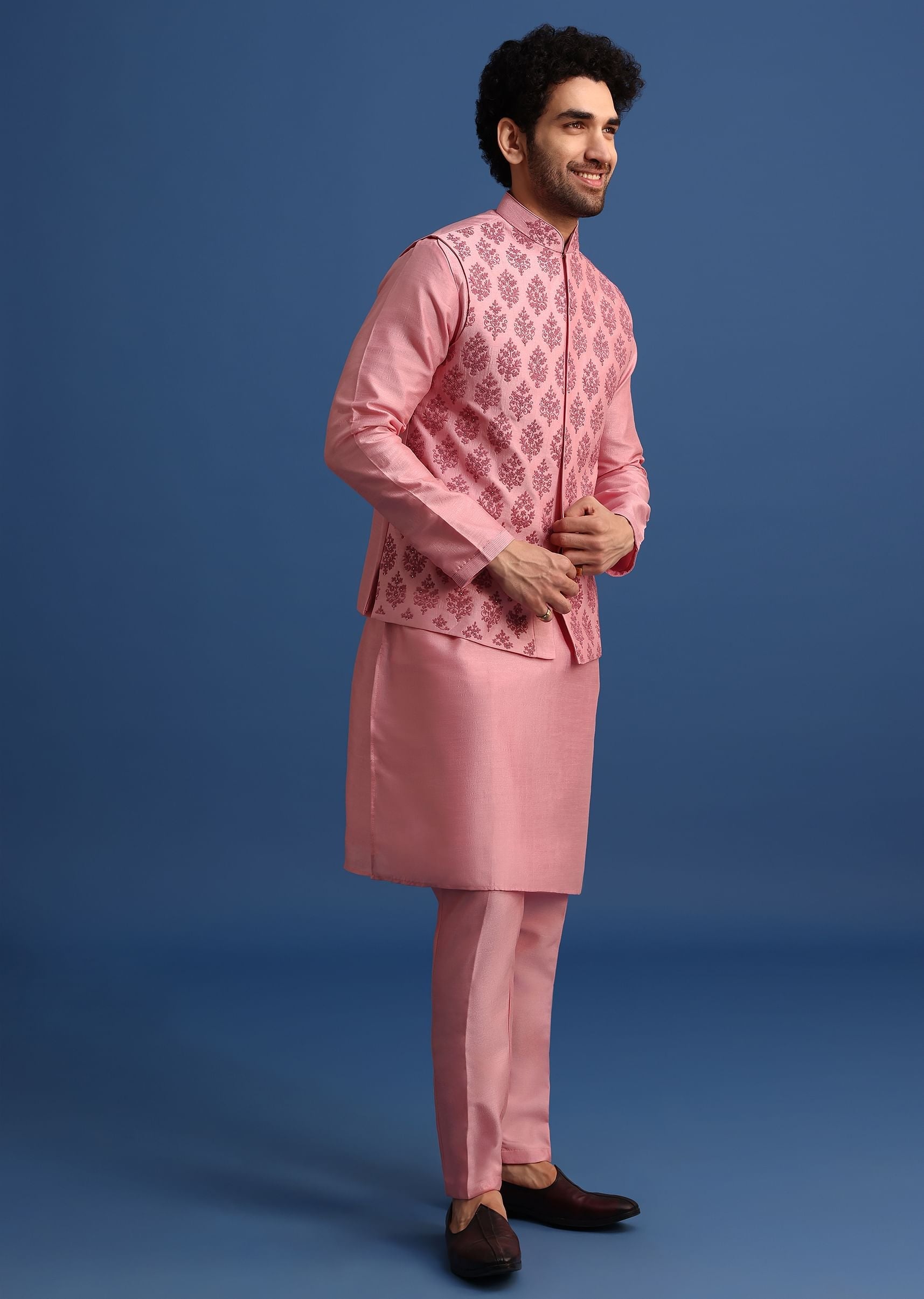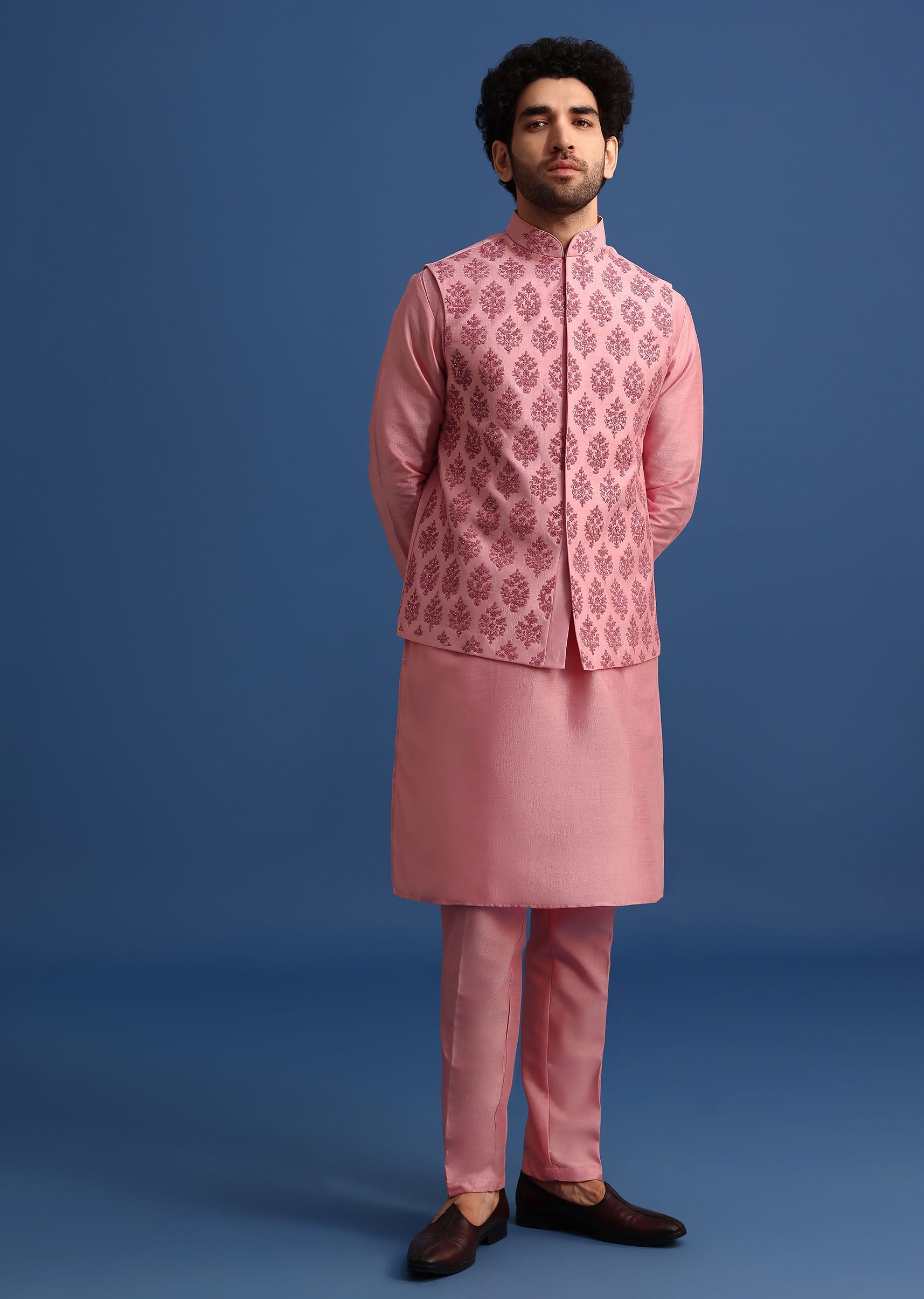 Discover the epitome of style with our Pink Raw Silk Fabricated Kurta Jacket Set. With its lush raw silk fabric delicate dori work and brilliant stone embroidery this ensemble is a testament to fine craftsmanship and elegance. Ideal for special occasions. This jacket comes with a kurta and pants. Awarded as the Most Trusted Brand, we're delivering styles you love, just as promised.