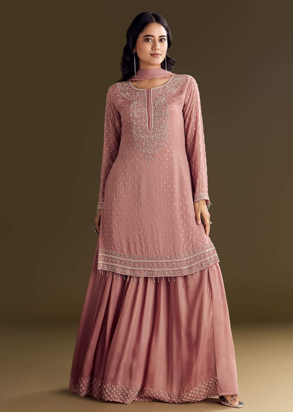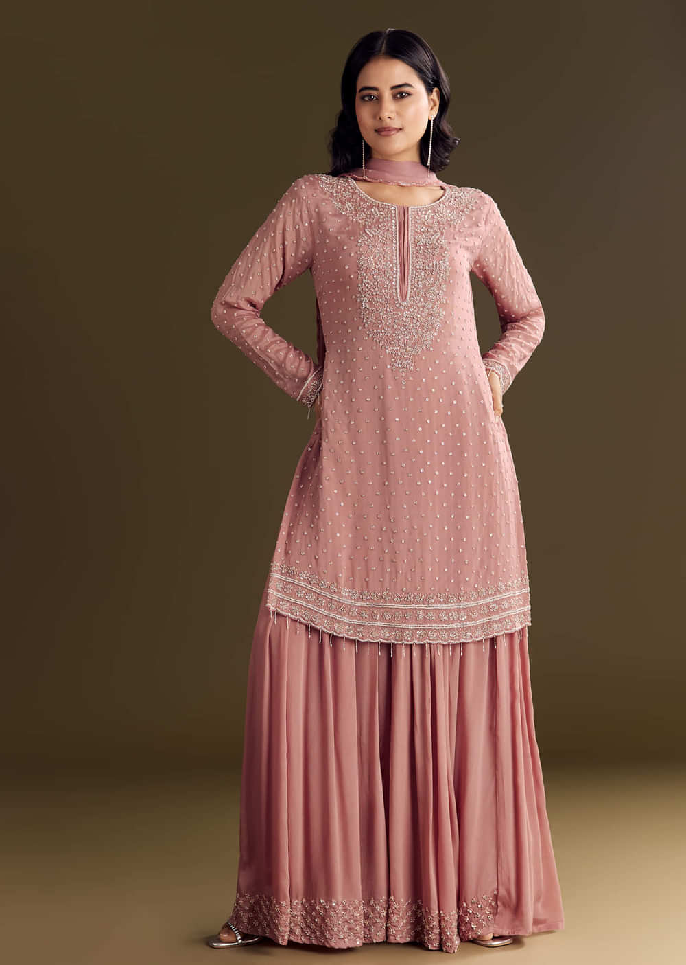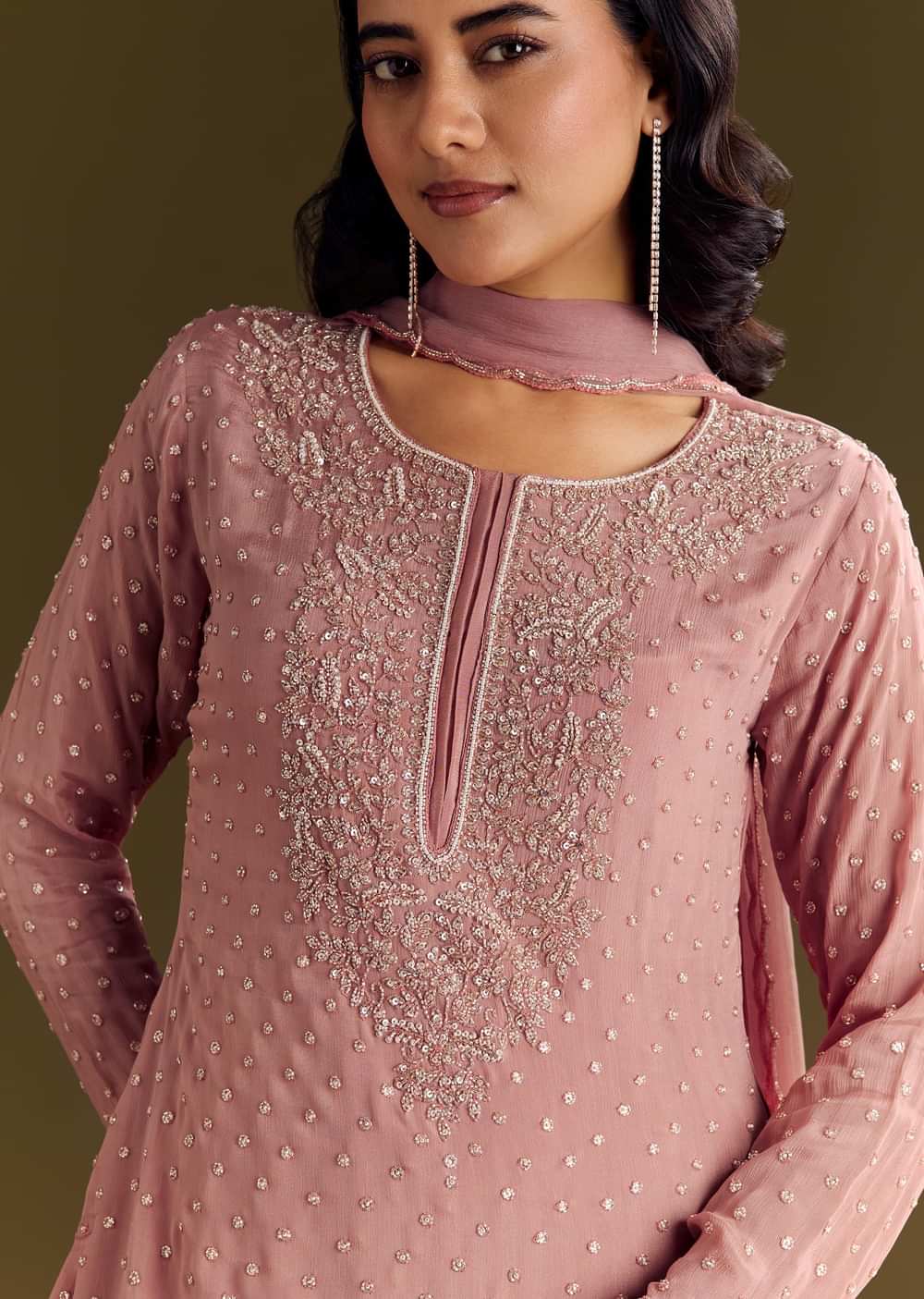 Pink Kurta Set With Embroidered Palazzo And Sequins Dupatta