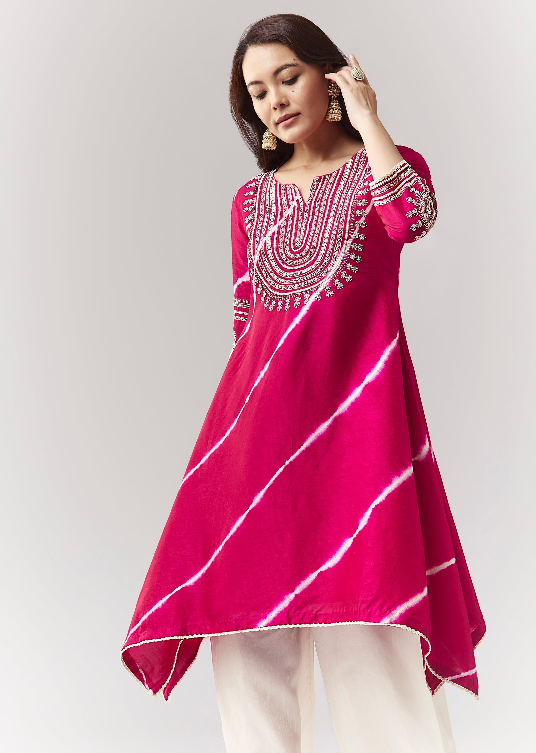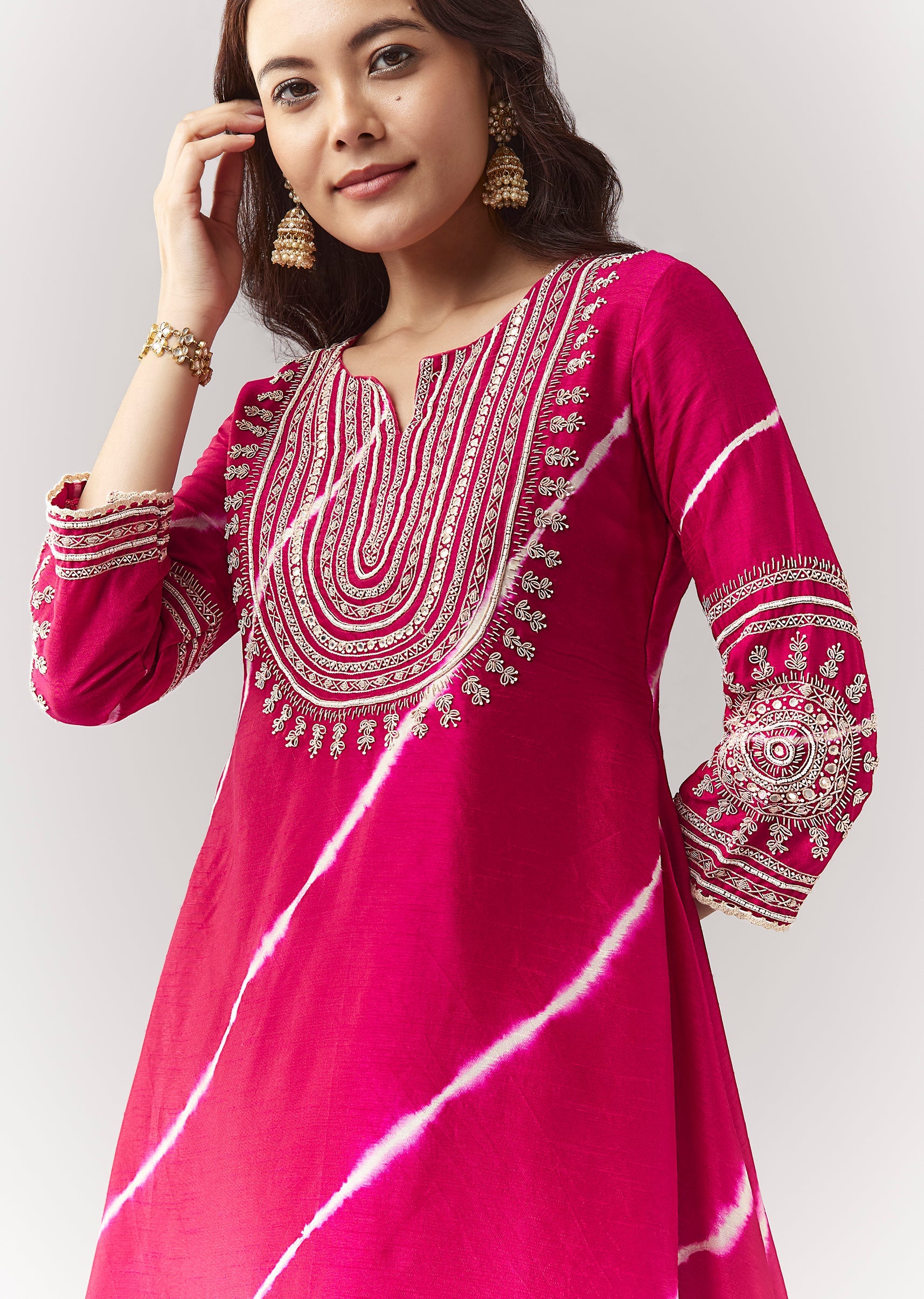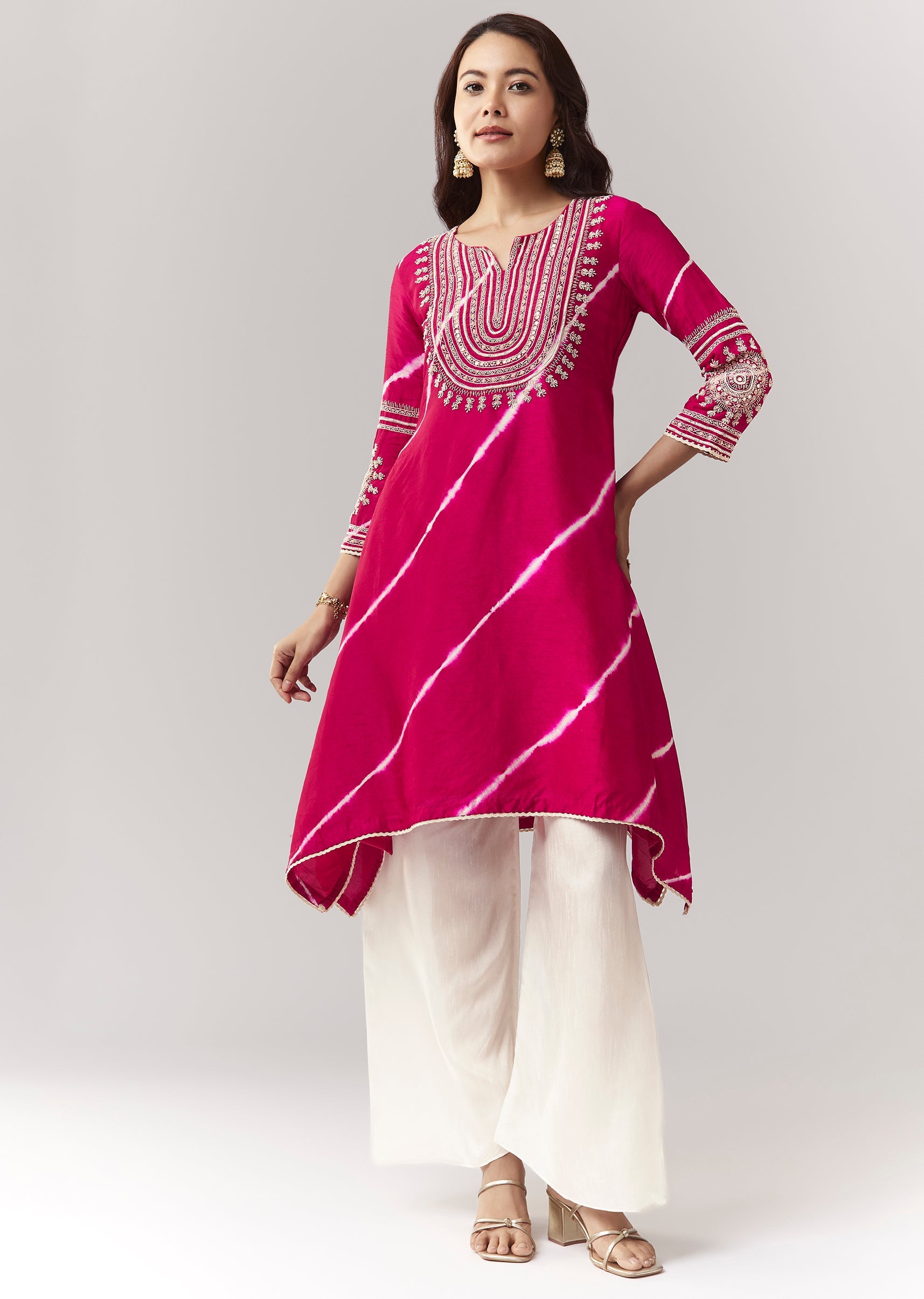 More Product DetailsA festive pink leheriya A-line kurta with zardosi/moti work, paired with wide palazzos. Awarded as the Most Trusted Brand, we're delivering styles you love, just as promised.