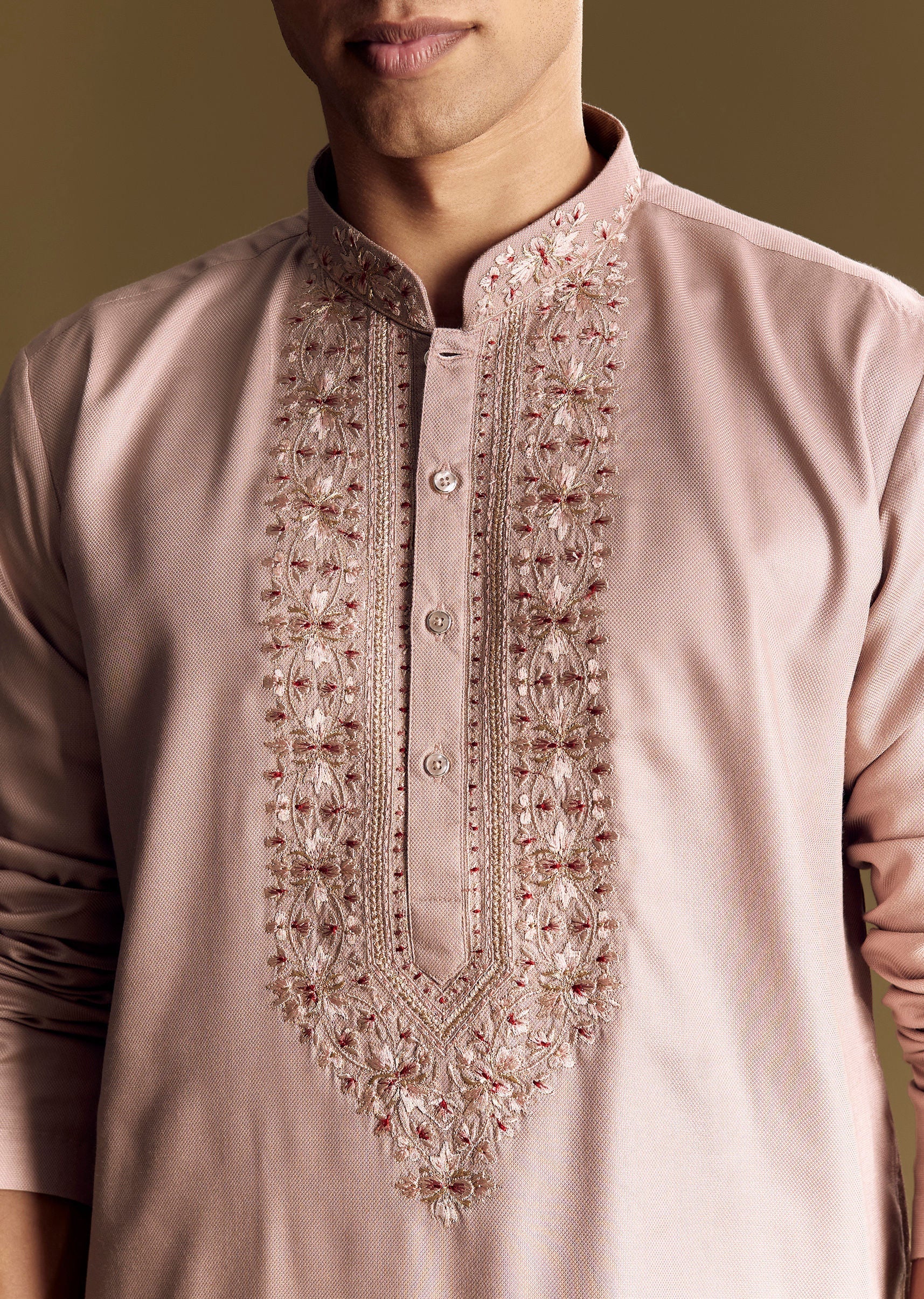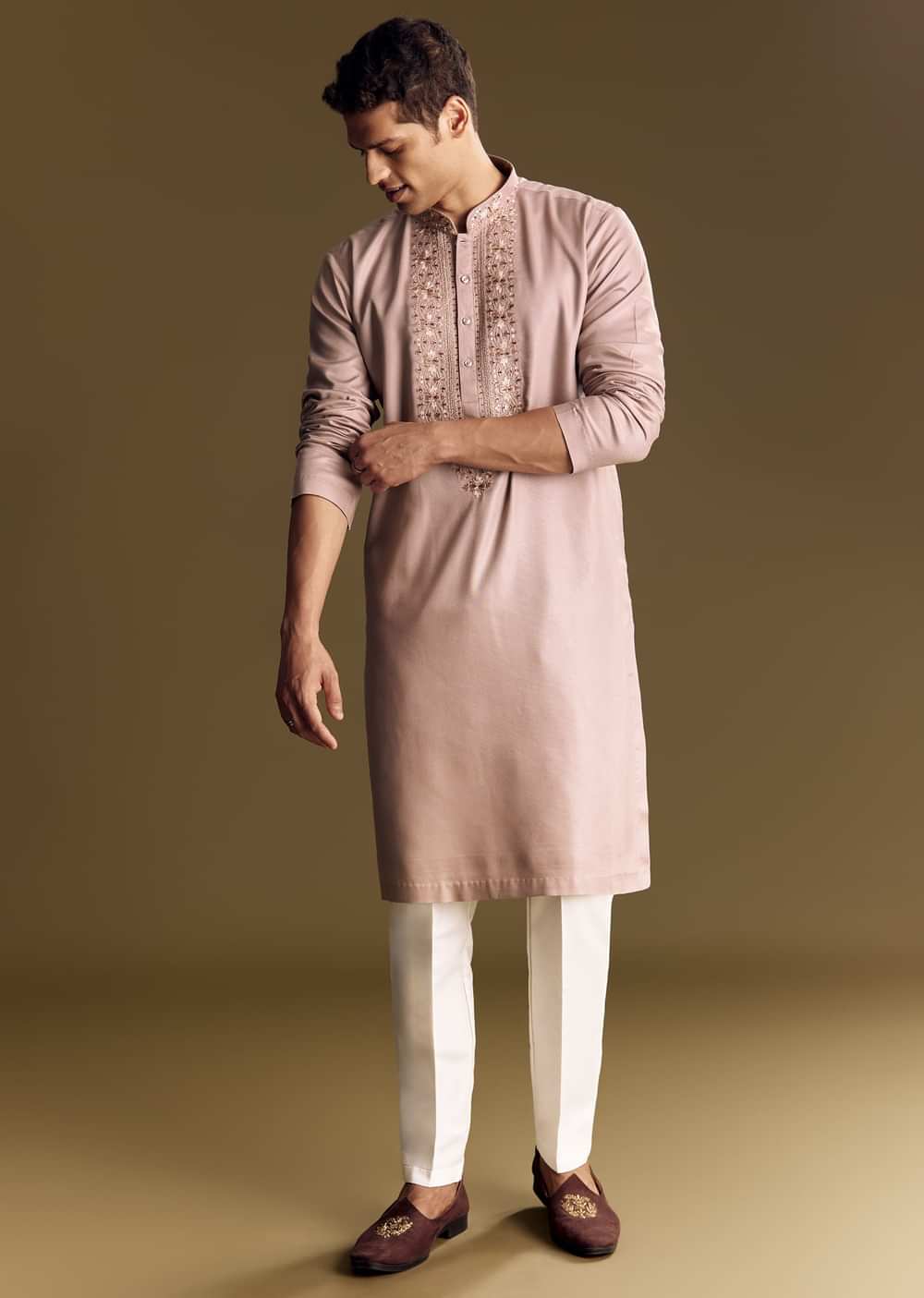 Crafted in breathable modal fabric, this pastel pink kurta set features delicate thread and resham embroidery. With its clean mandarin collar and classic buttoned placket, it offers a timeless look ideal for day festivities and celebrations. Awarded as the Most Trusted Brand, we're delivering styles you love, just as promised.