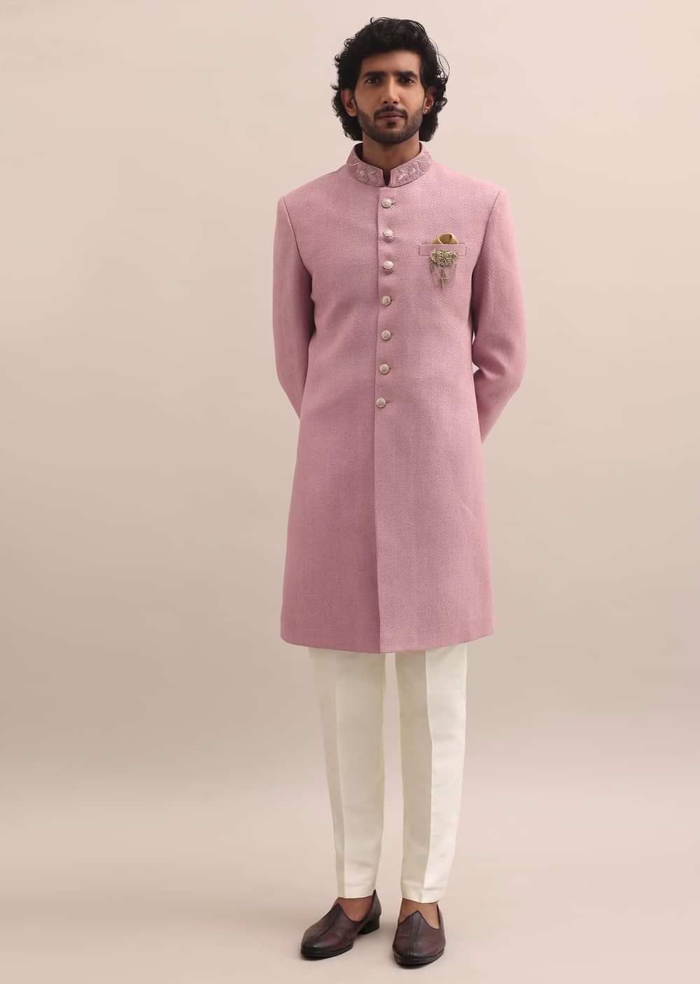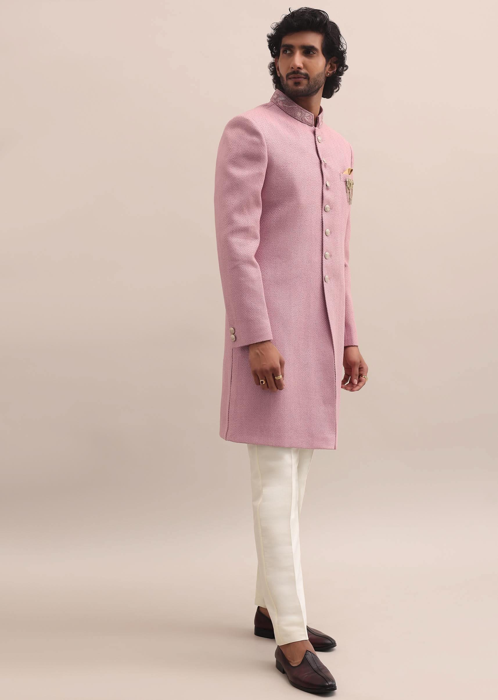 Pink Moti Embroidered Silk Nawabi Suit For Men