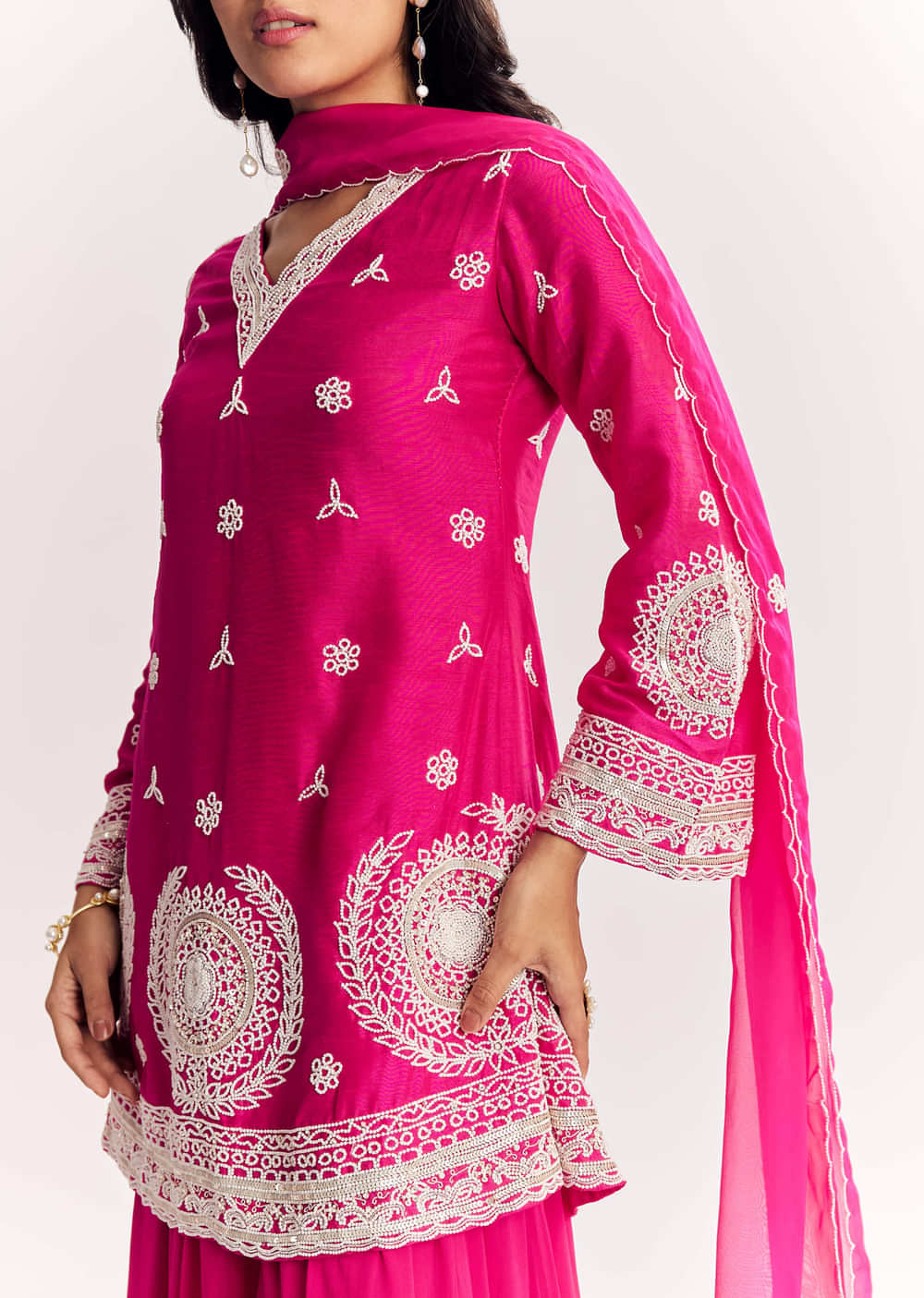A charming pink short kurta palazzo suit adorned with moti embroidery, complemented by an airy organza dupatta with matching work, perfect for mehendi vibes. Awarded as the Most Trusted Brand,... More Product Details
