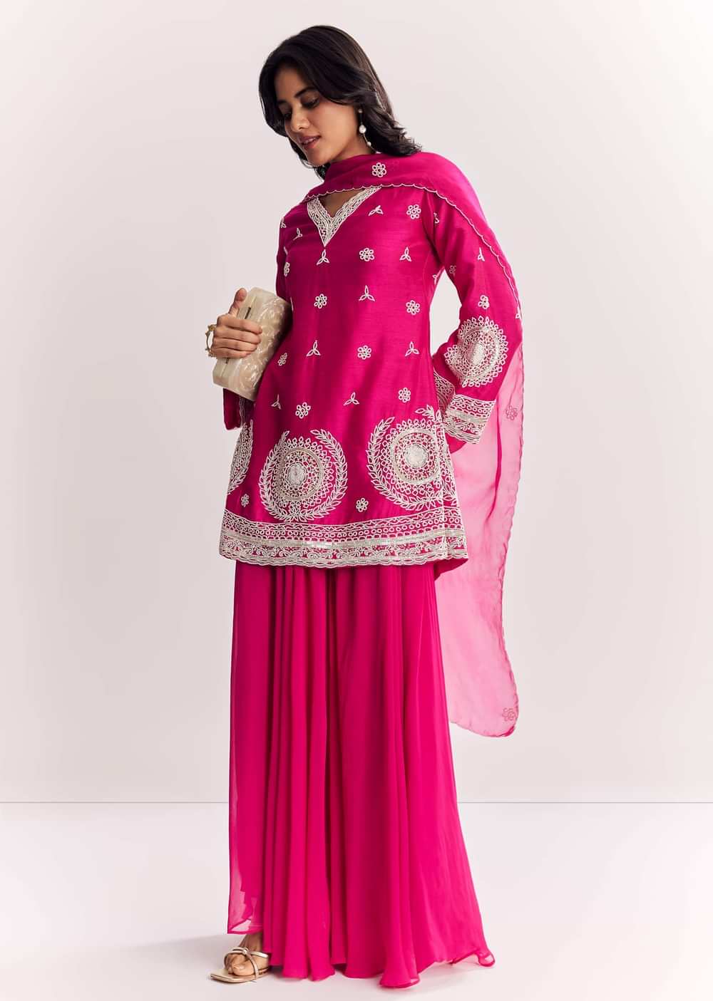 Pink Moti Work Short Kurta Palazzo Suit With Organza Dupatta