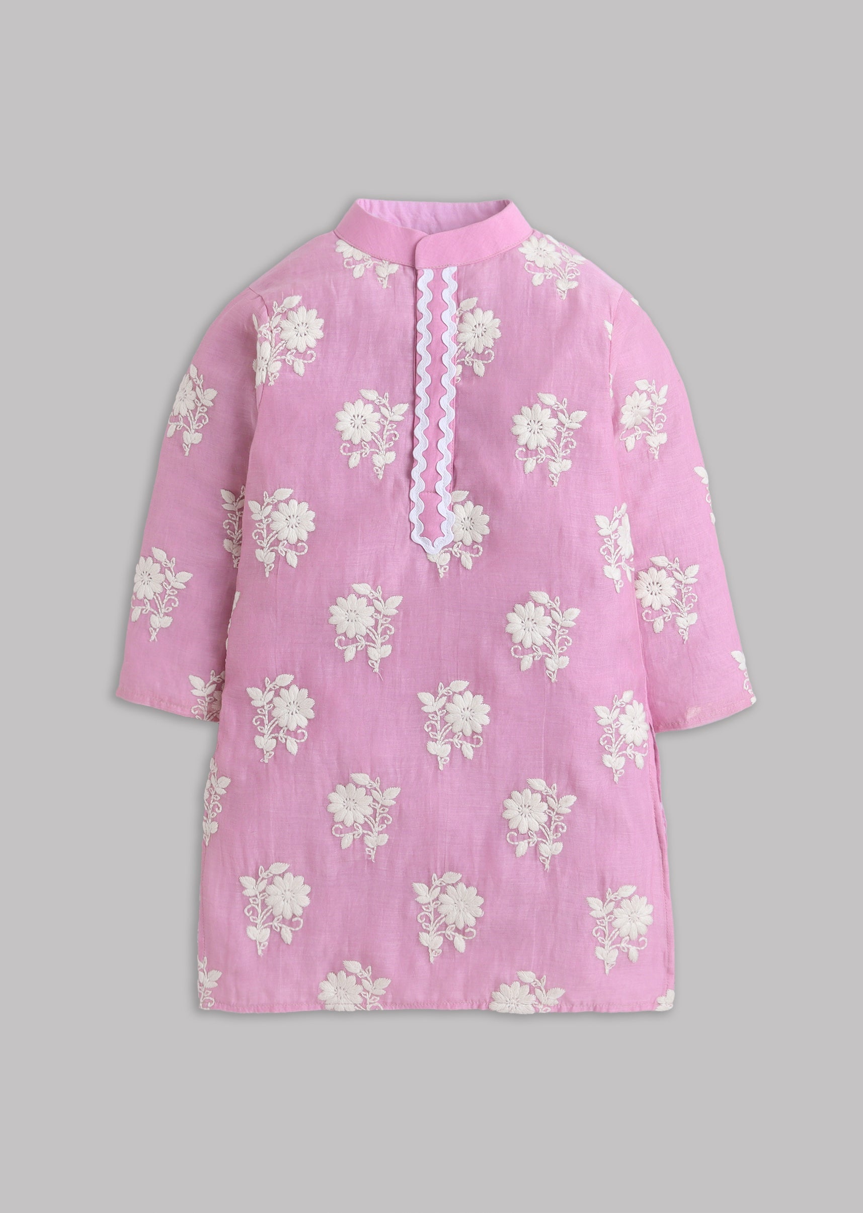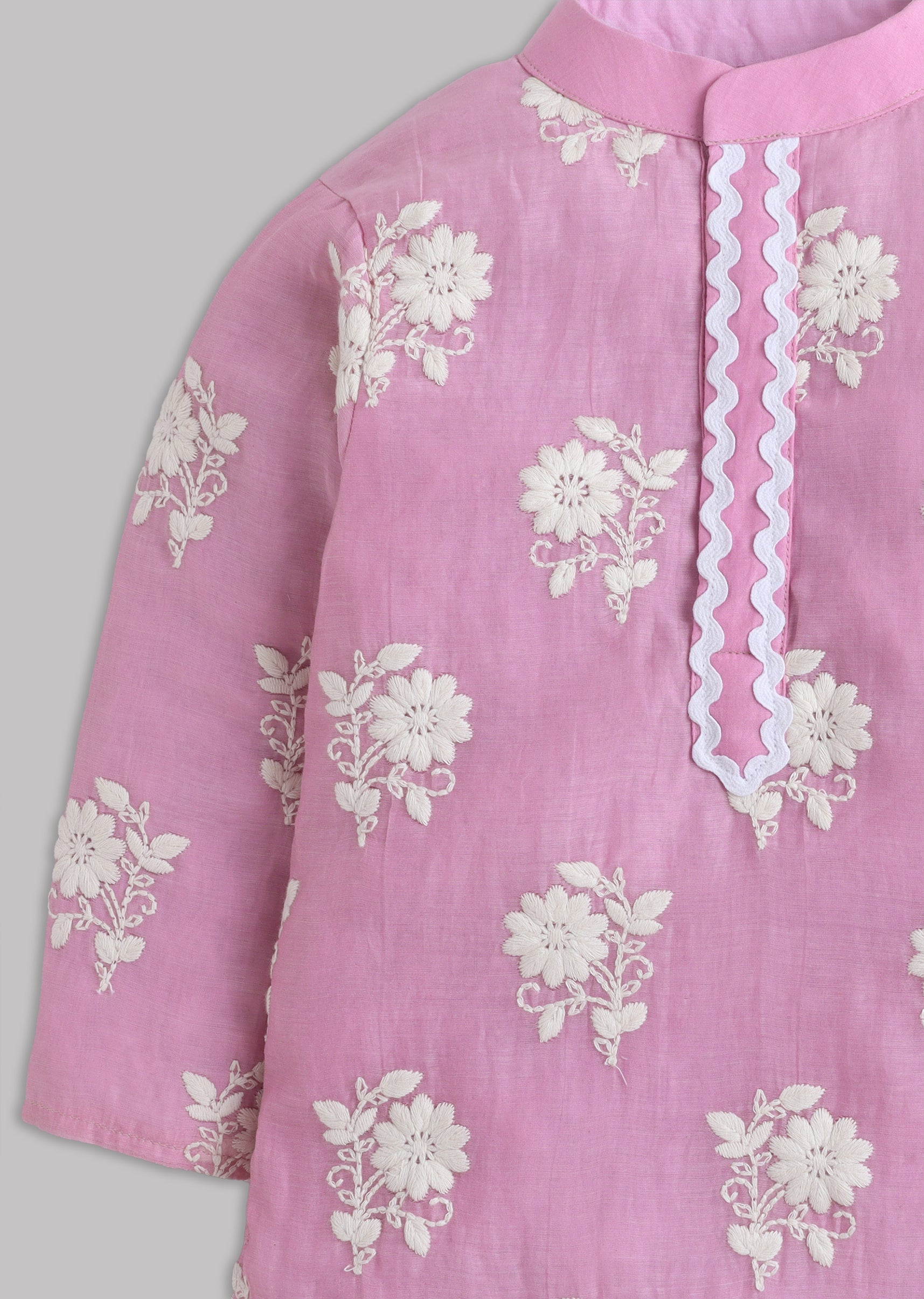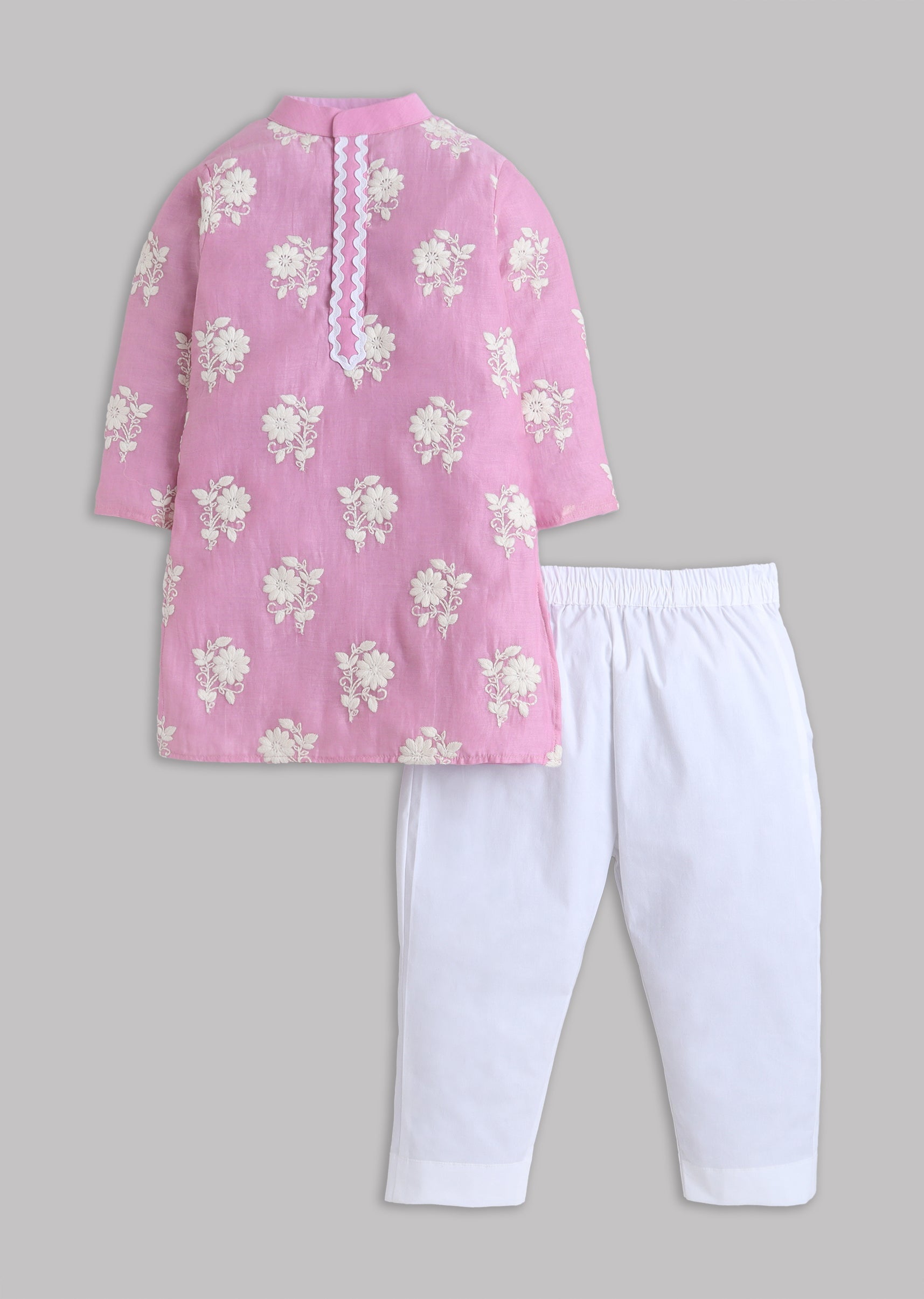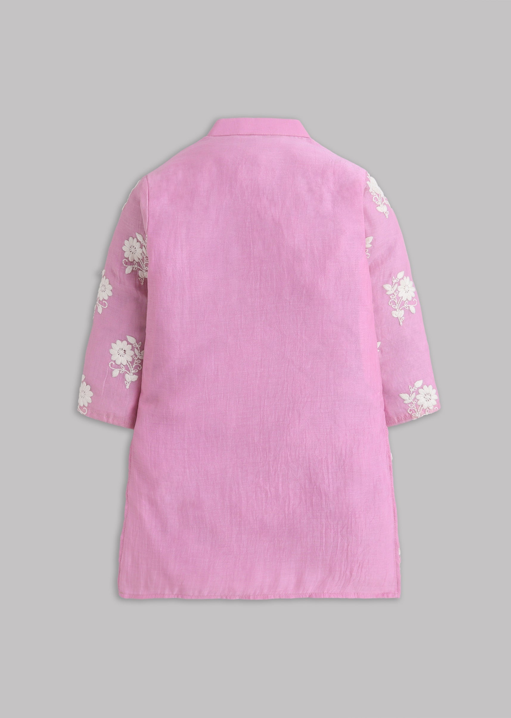 A festive pink kurta set in soft cotton with Mul Chanderi styling and subtle embroidery. Finished with full sleeves and a mandarin collar, paired with a matching bottom—ideal for daytime... More Product Details