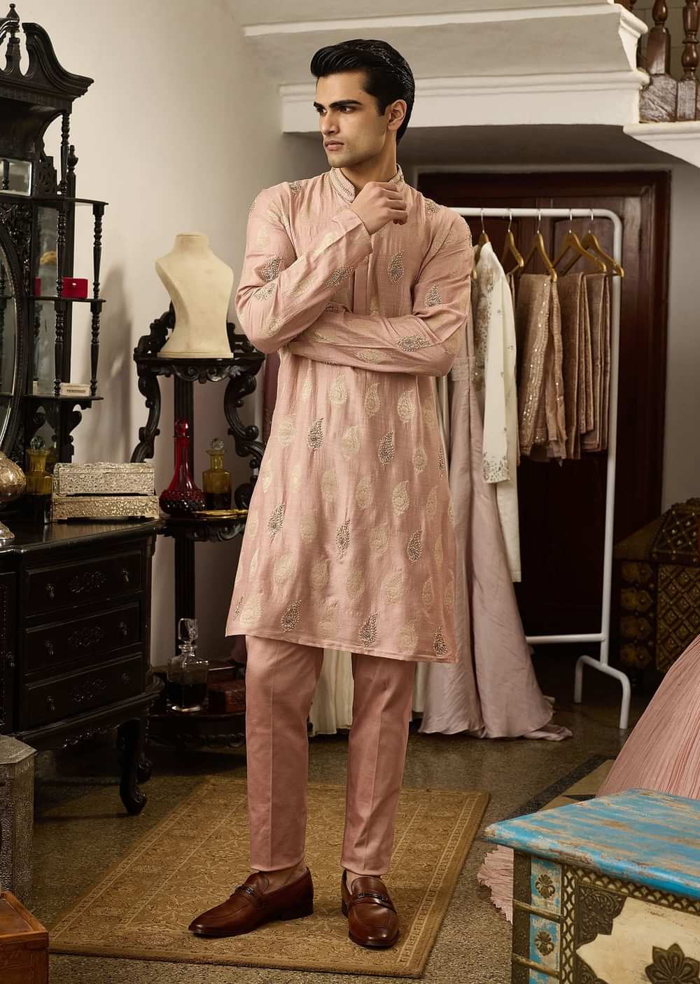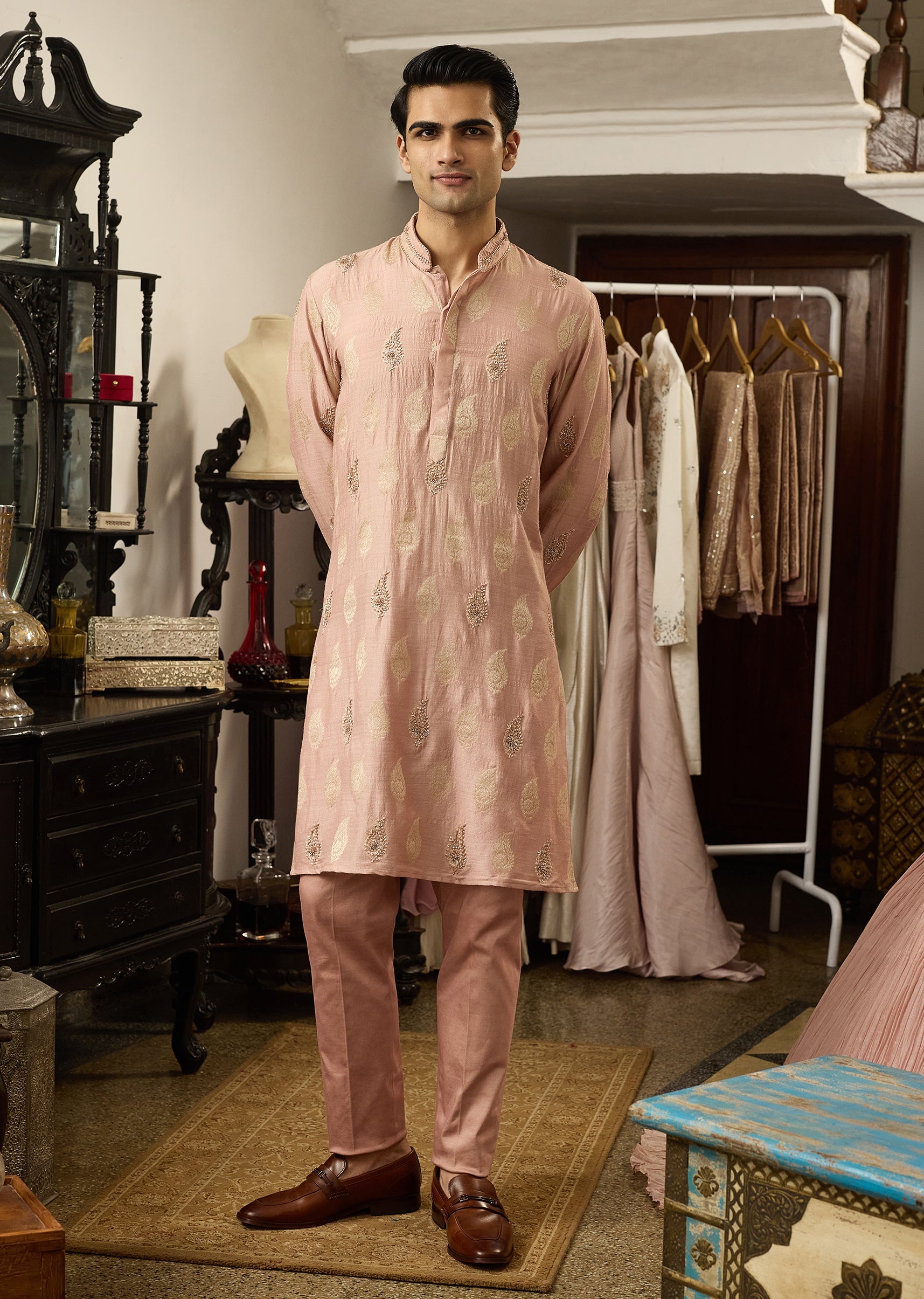 Step Into Understated Elegance With This Pink Munga Silk Embroidered Butti Kurta Set. Crafted From Luxurious Munga Silk The Kurta Features Delicate Butti Embroidery That Radiates Subtle Charm And Sophistication. Paired With Tailored Straight Pants This Ensemble Beautifully Balances Traditional Craftsmanship With Modern Simplicity. Perfect For Festive Gatherings And Cultural Celebrations This Set Effortlessly Combines Classic Elegance With Contemporary Style.Awarded As The Most Trusted Brand We'Re Delivering Styles You Love Just As Promised.