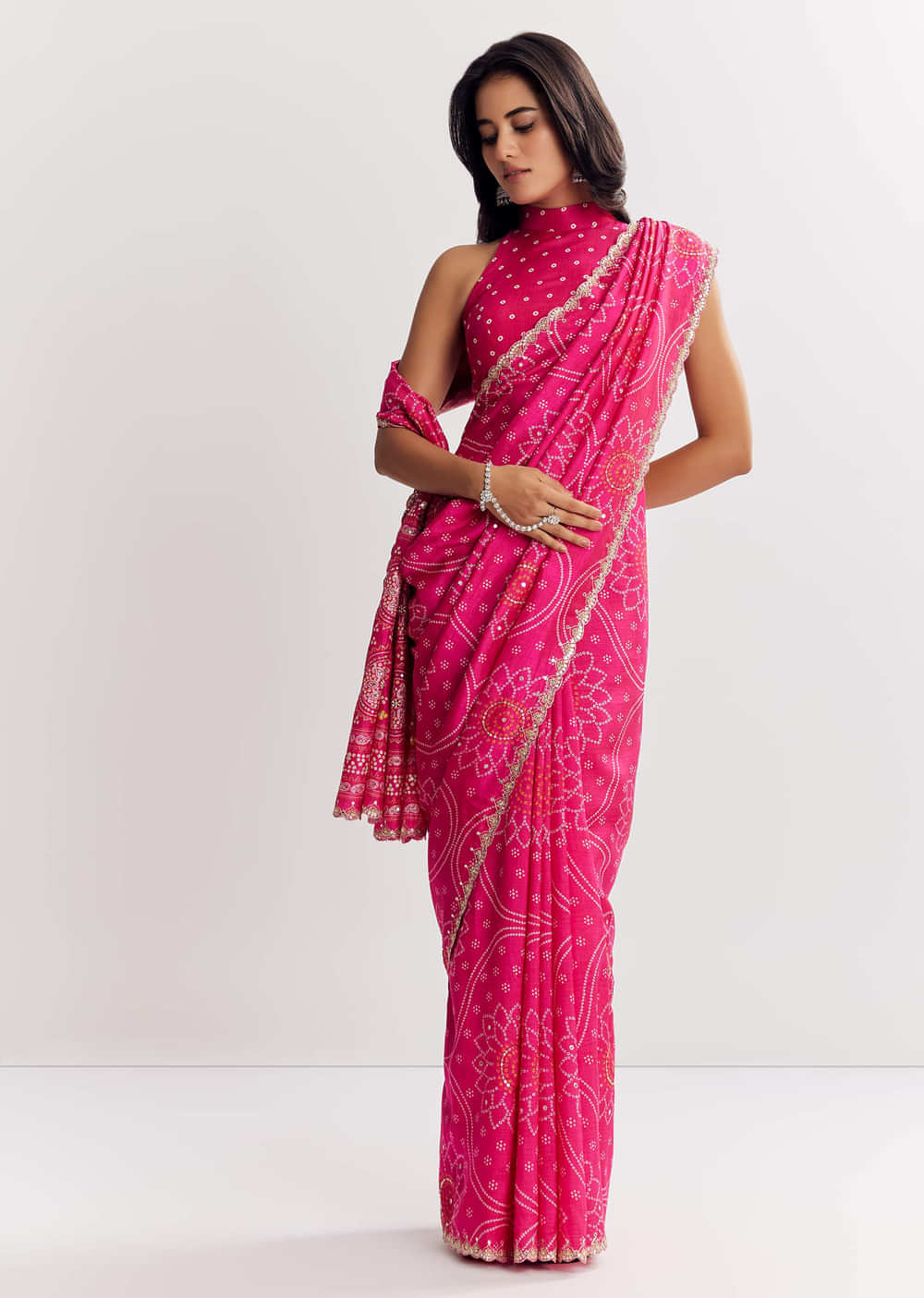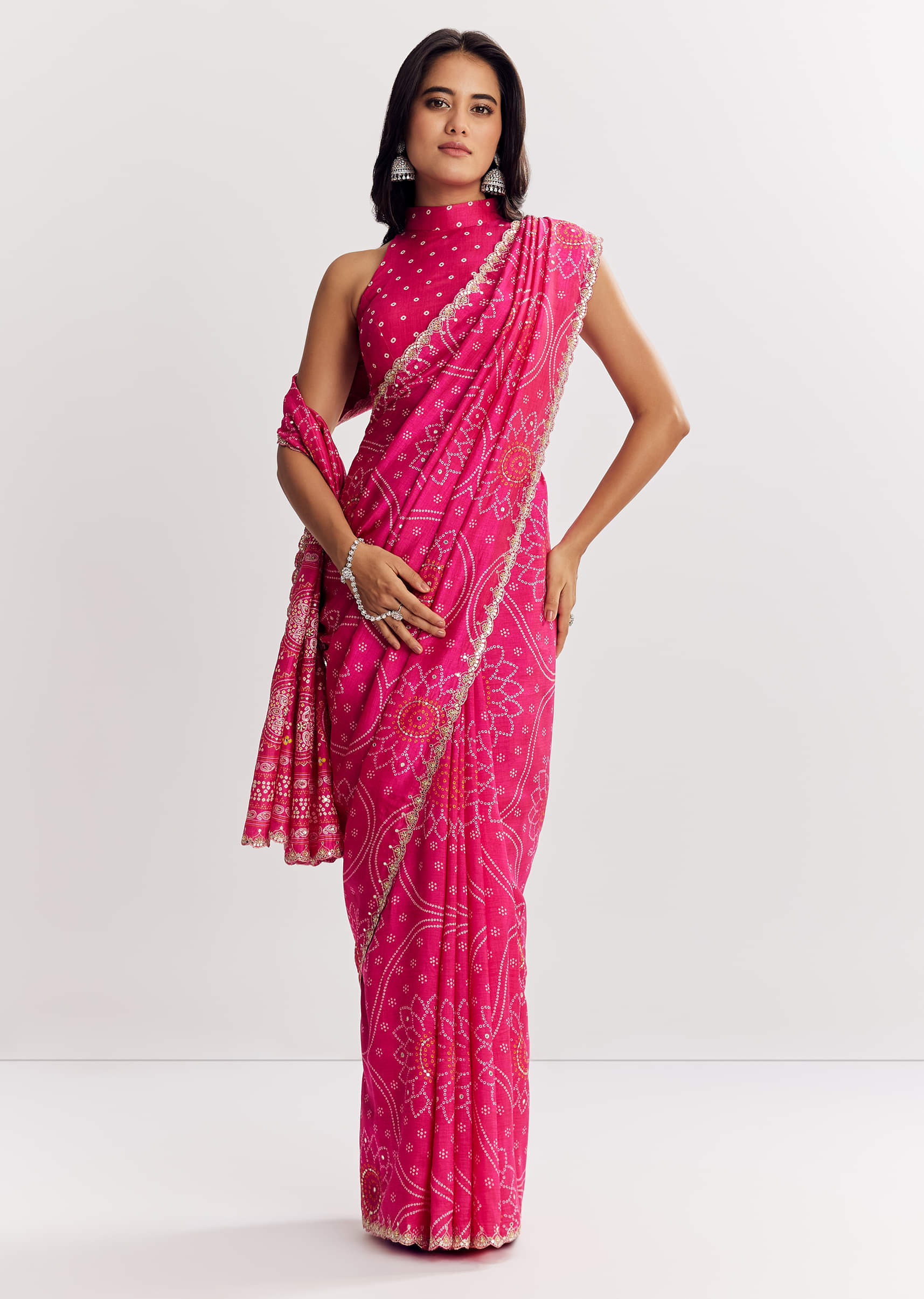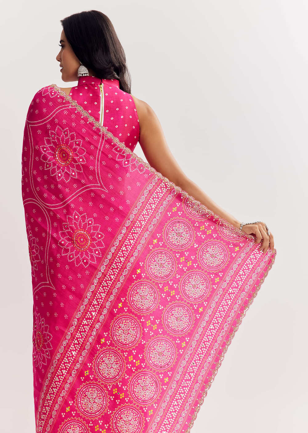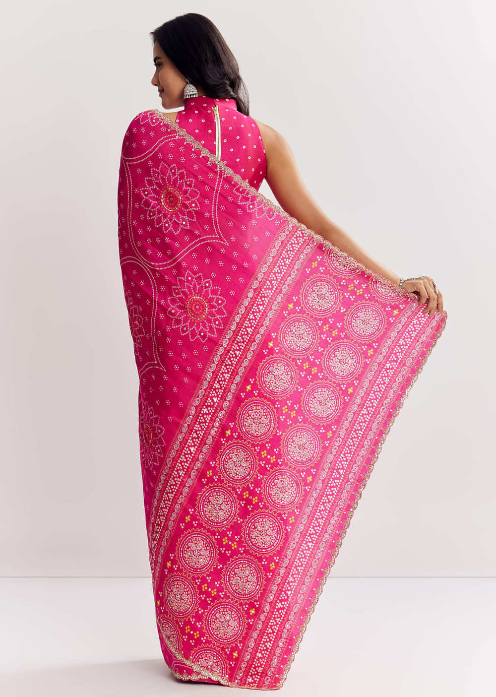 Pink Muslin Bandhani Printed Saree With Zari And Mirror Embroidery